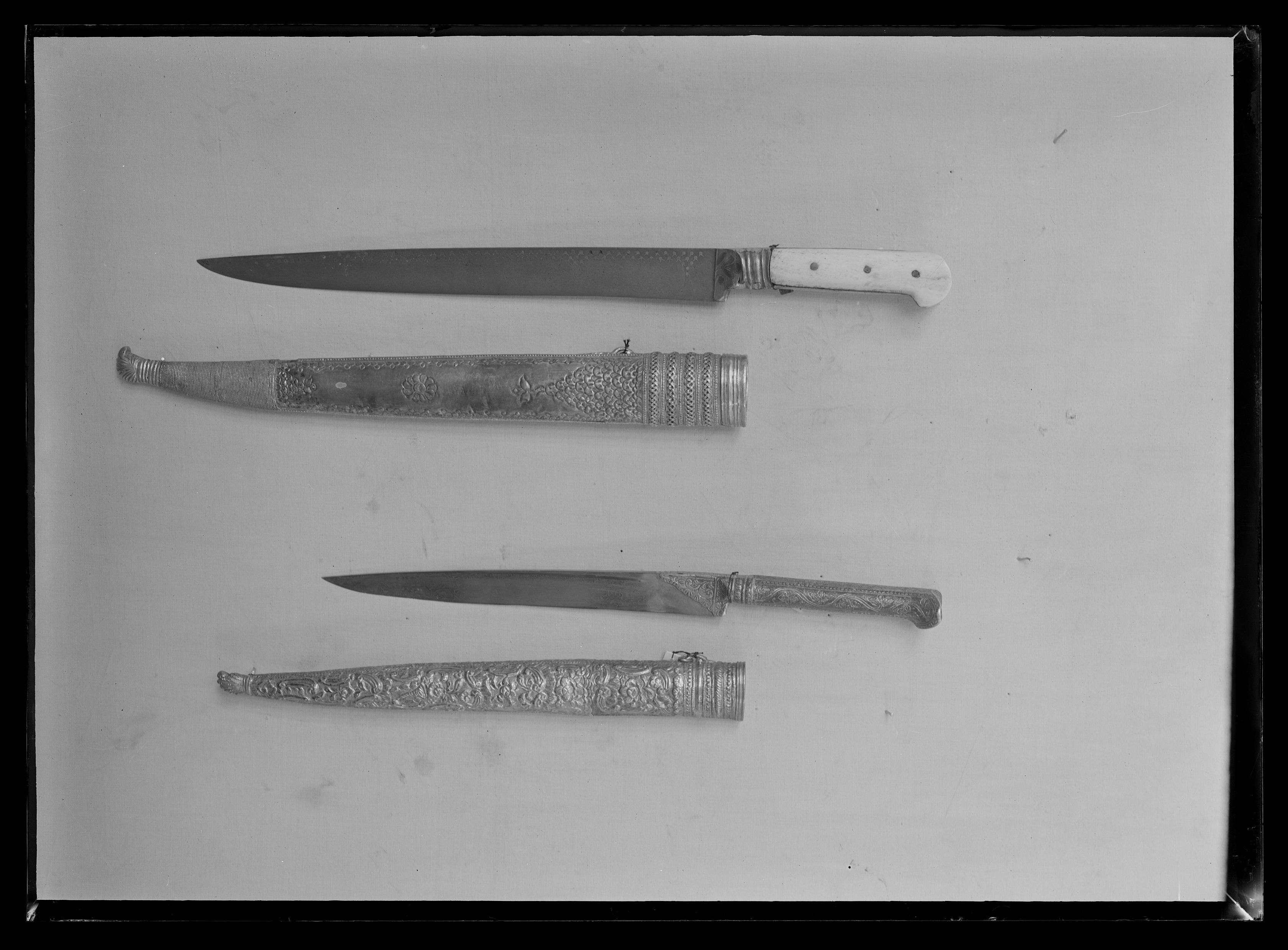 Skaft av silver, cylindriskt med öron och med yttäckande dekor i form av längsgående bårder, bl.a. treklöverranka och tät bladbård. Skaftets nederdel övergår i ett beslag som går en bit ned längs bladets rygg, med graverad bladdekor. Blad av damaskerat stål 22 mm bred vid fästet, eneggad med svagt konvex rygg och en aning s-formad egg.