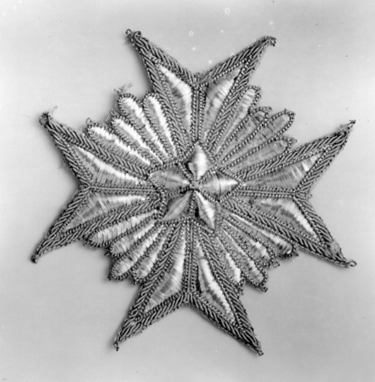 Malteserkors, broderat med silverlan, -kantiljer och -paljetter, mellan korsarmarna fyra rundade strålar av silverlan och kantiljer. Över korsmitten en femuddig, fasetterad stjärna i låg relief av silverlan och -kantiljer. På baksidan vitt papper.