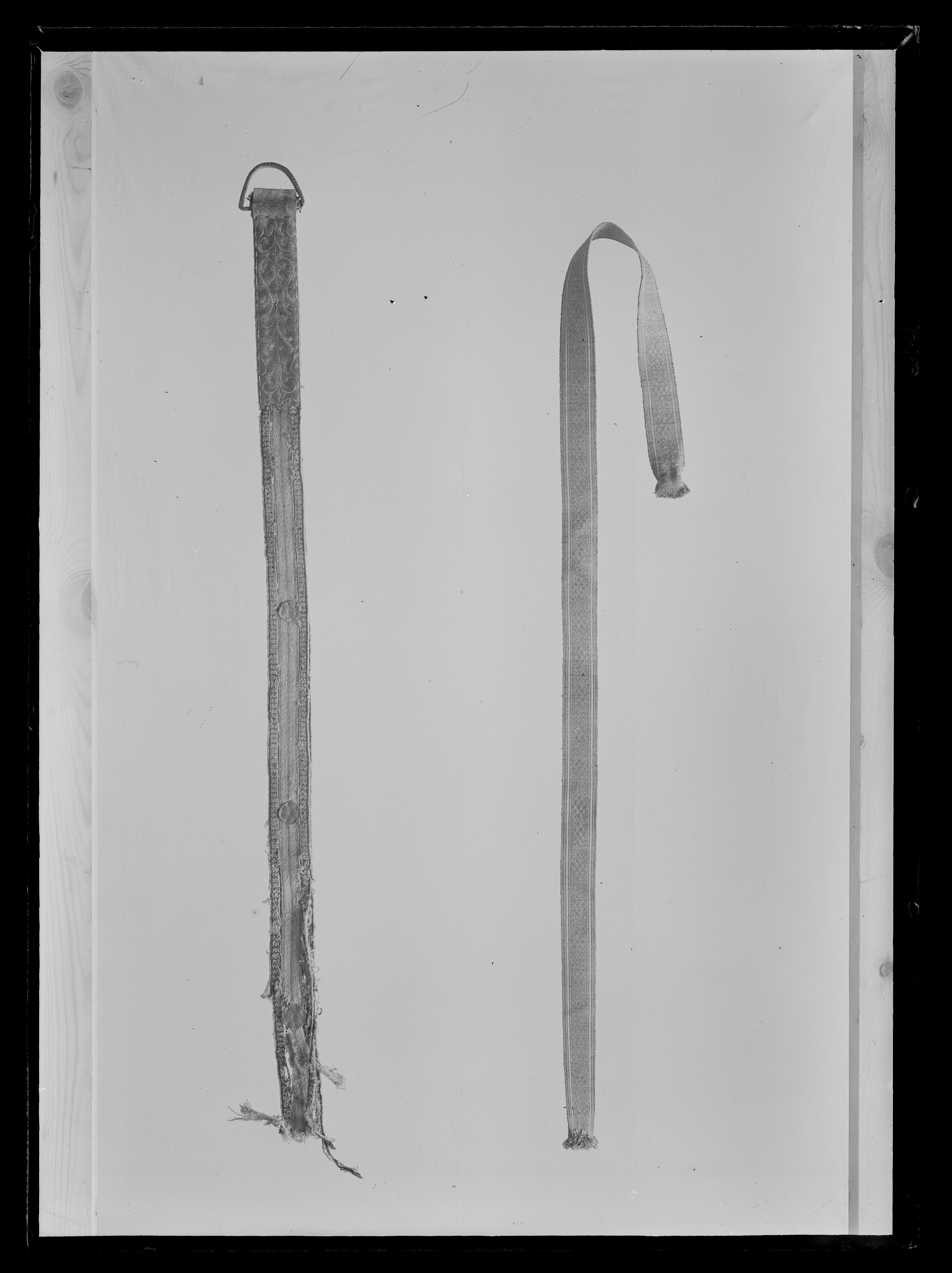 Bukgjord av dubbelt vävt mörkgult ylleband med bruna inslag vid kanterna. Läderskoning i ändarna med på utsidan broderade rankor med silvertråd. Två halvsfäriska byglar av stål, i den ena lädderrem, l 920 mm b 15 mm.