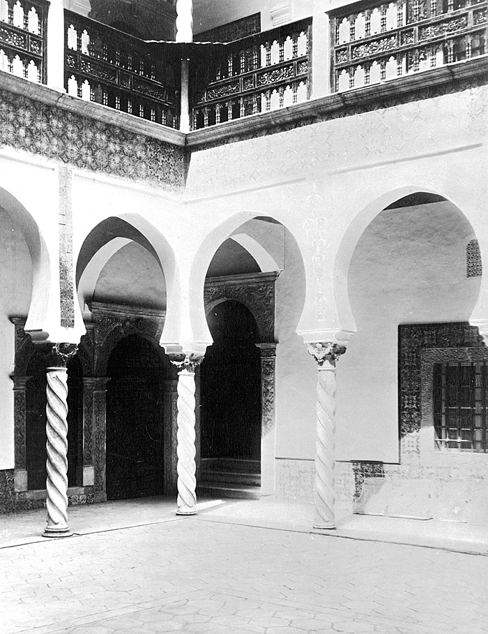 ALGER, Algeriet. Innergården i ärkebiskopens palats. Foto från resa genom Algeriet och Tunisien samt åter över Schweiz, 11 februari - 19 maj 1889. Samtliga foton i gruppen LXVI:F. är inköpta av Wilhelmina von Hallwyl i Alger, Biskra, Tunis, Constantine, Oran och Blidah vid hennes vistelse i nämnda städer tillsammans med sin make, Walther von Hallwyl, sin mor, Johanna Kempe, f. Wallis, dottern Irma samt fröknarna Caroline Pflaum och Ida Uhse. Uppgifterna kommer från fröken Ida Uhses reseanteckningar.