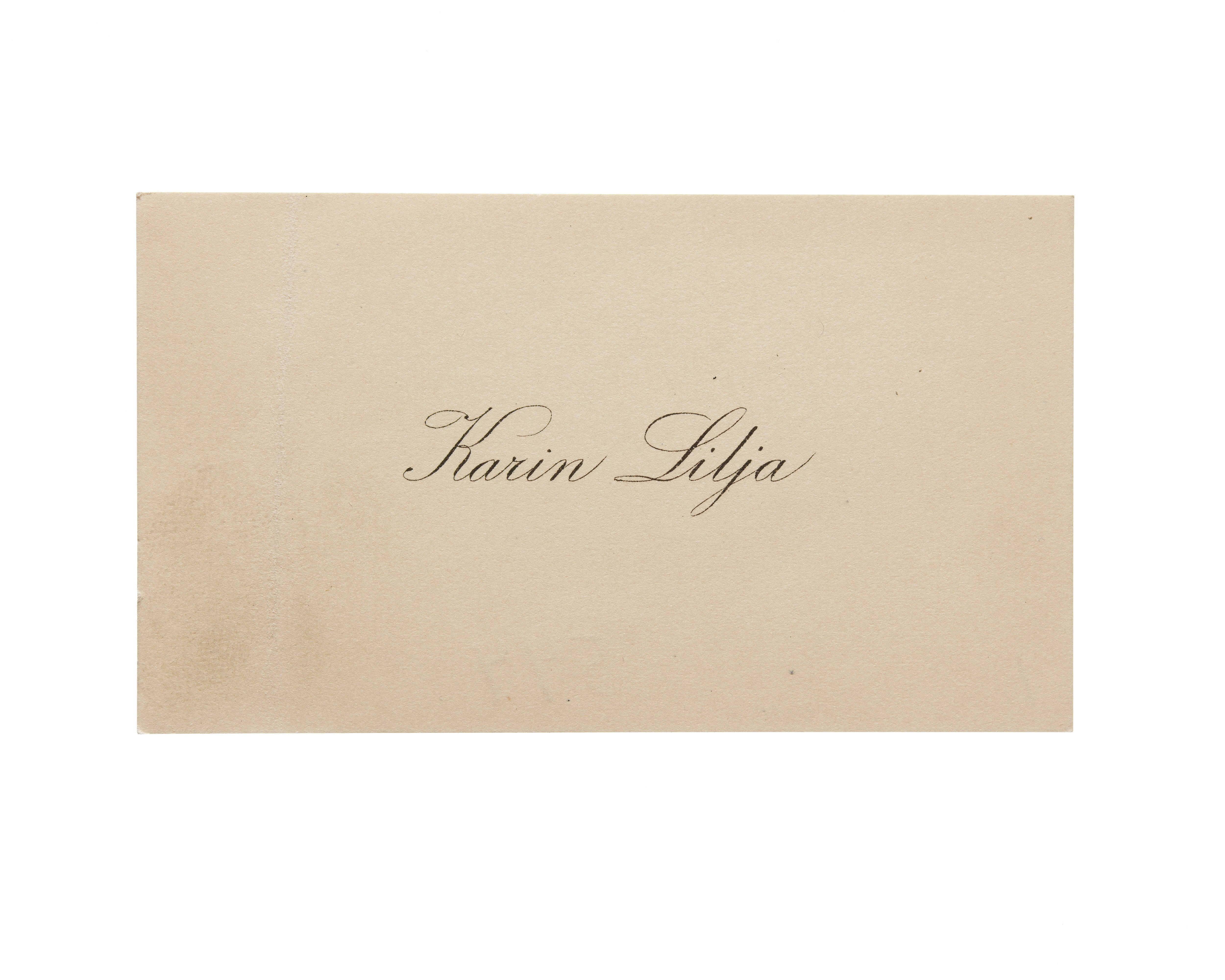 Ett visitkort från Karin Lilja, utan datum, vikt i vänstra sidan.