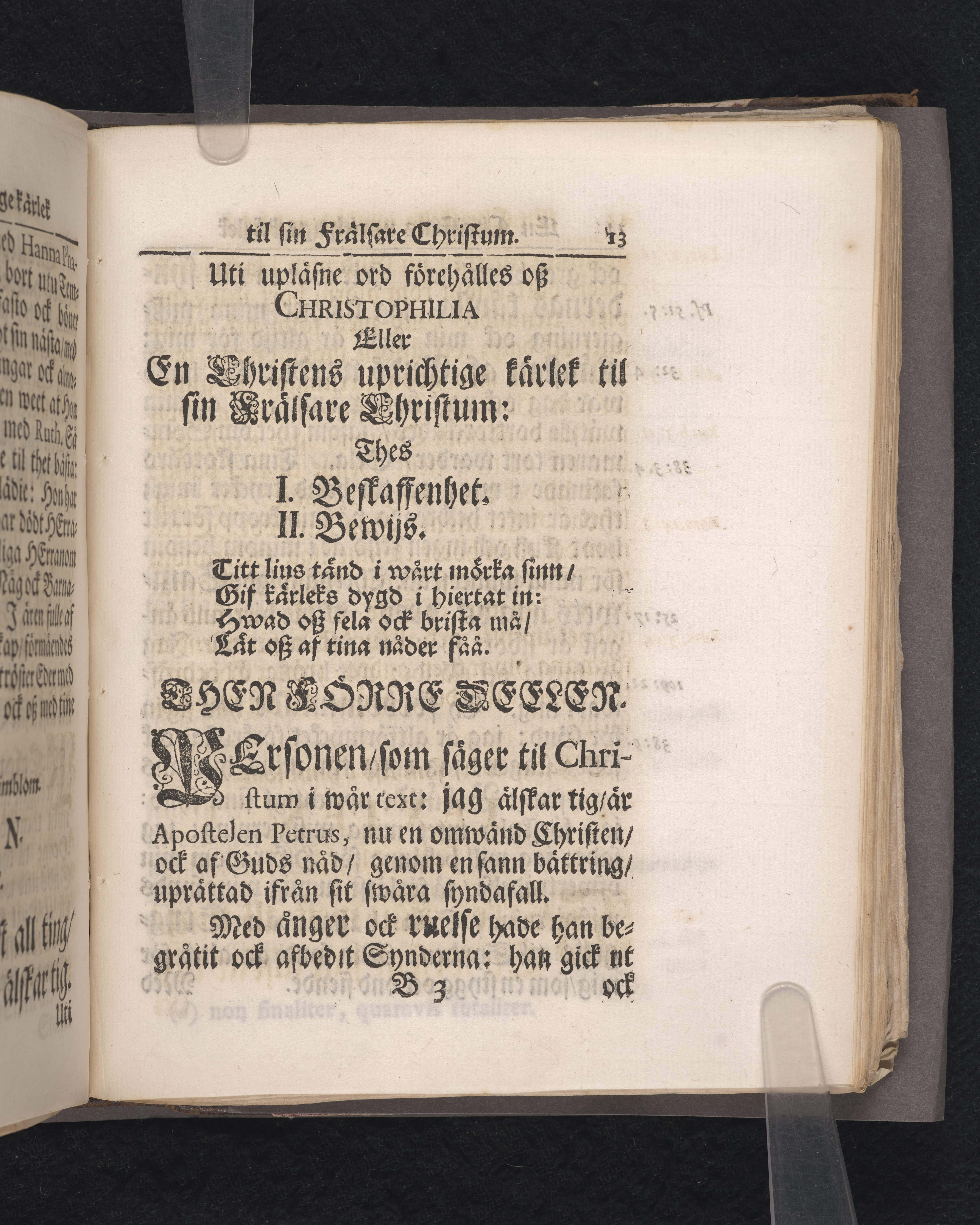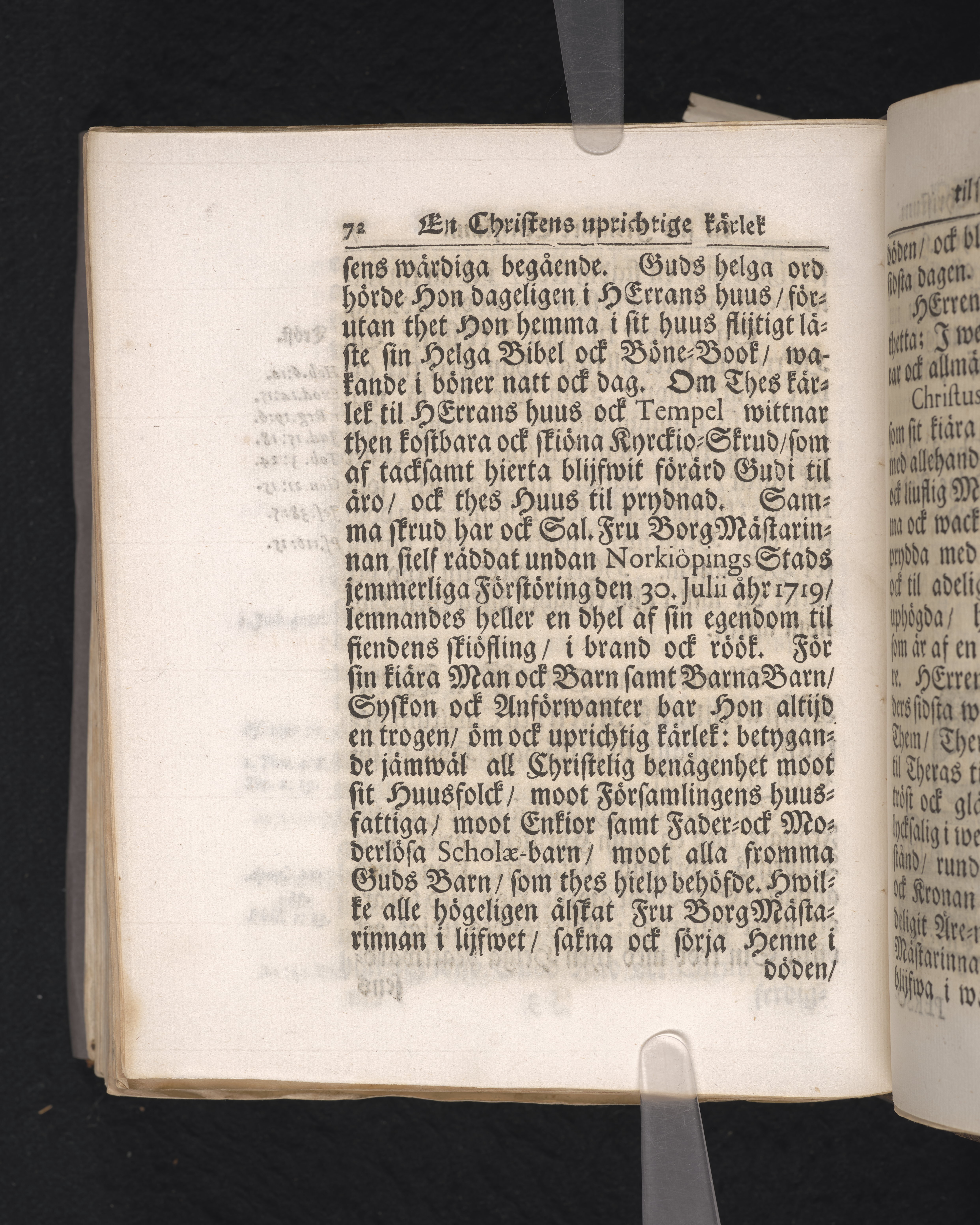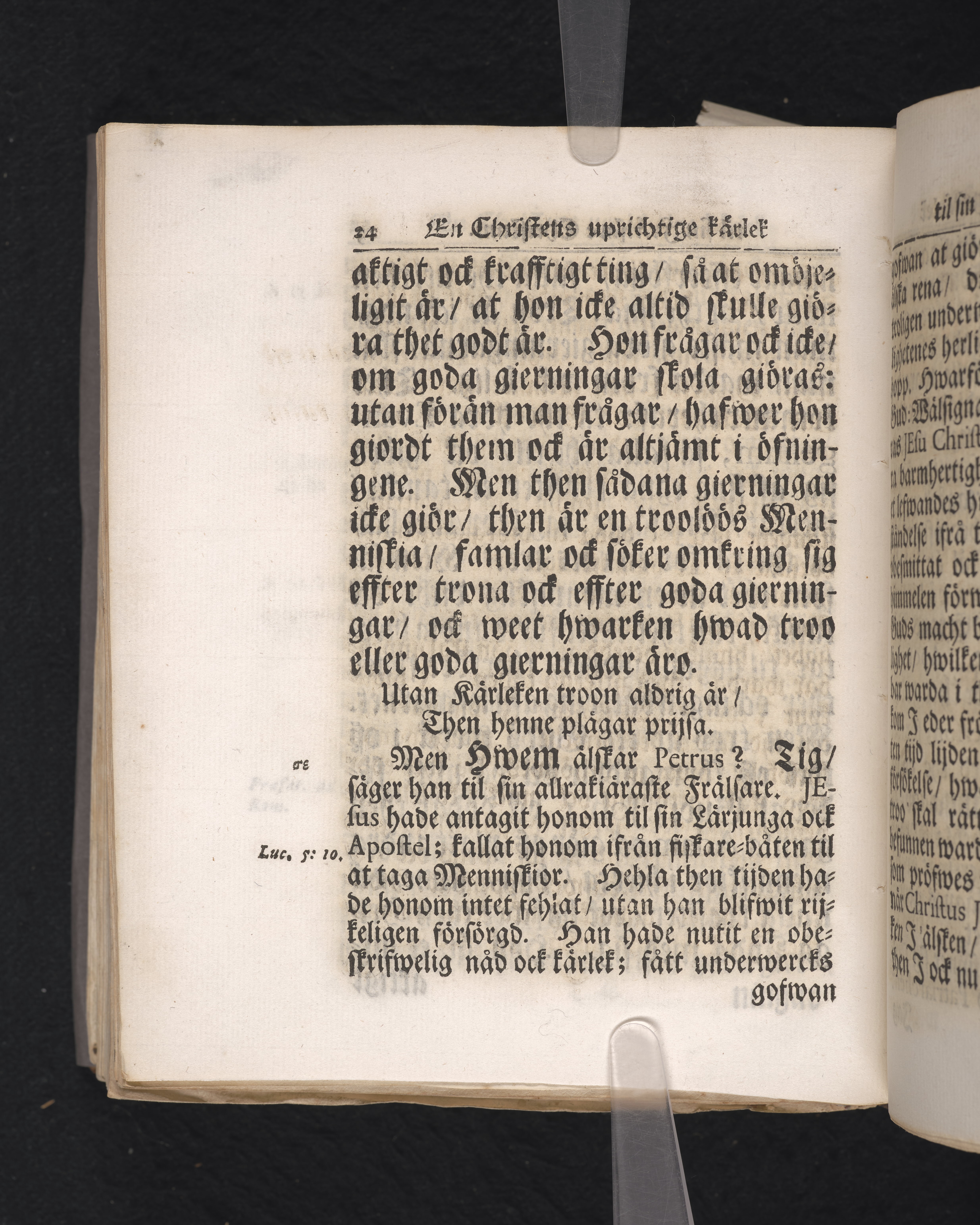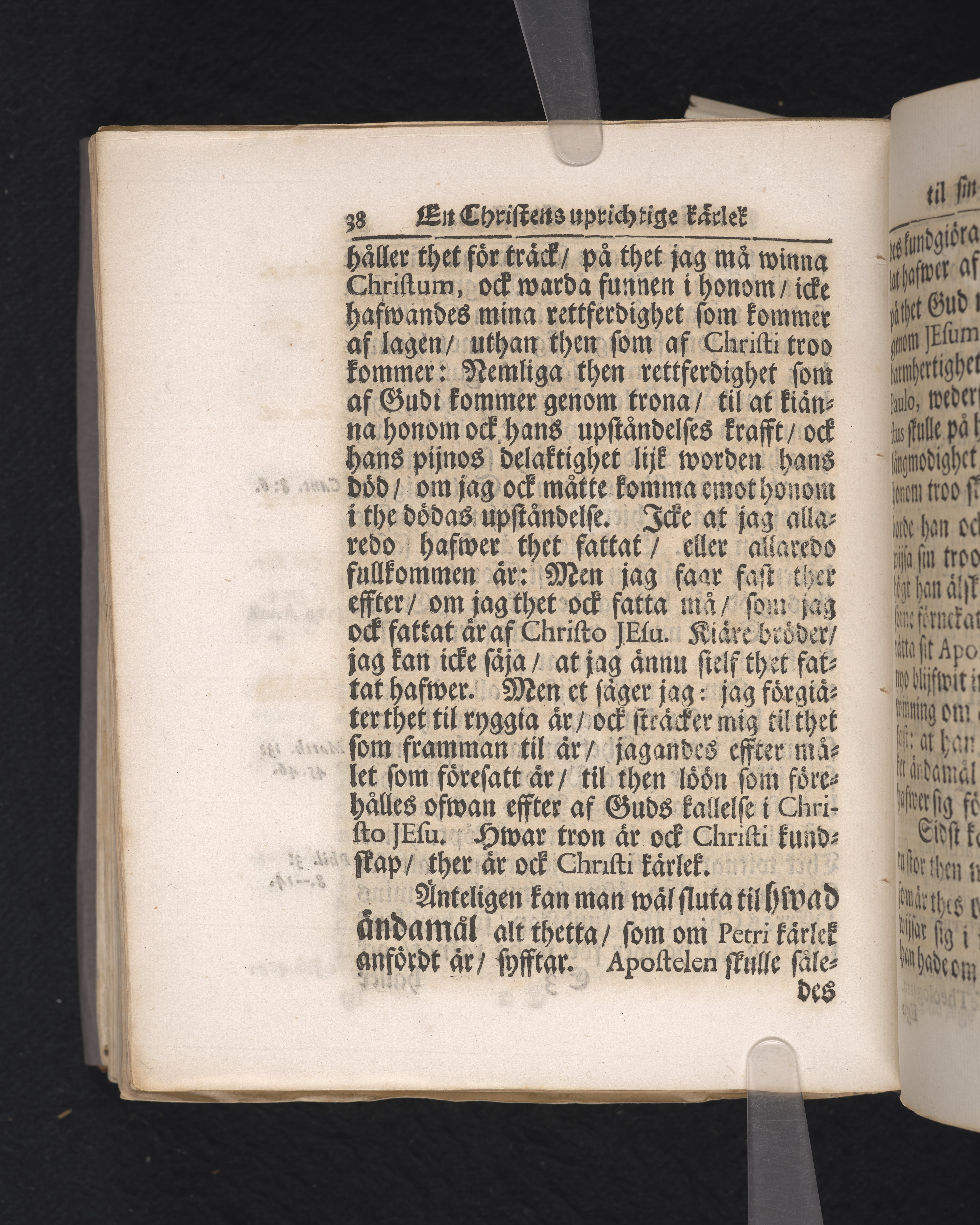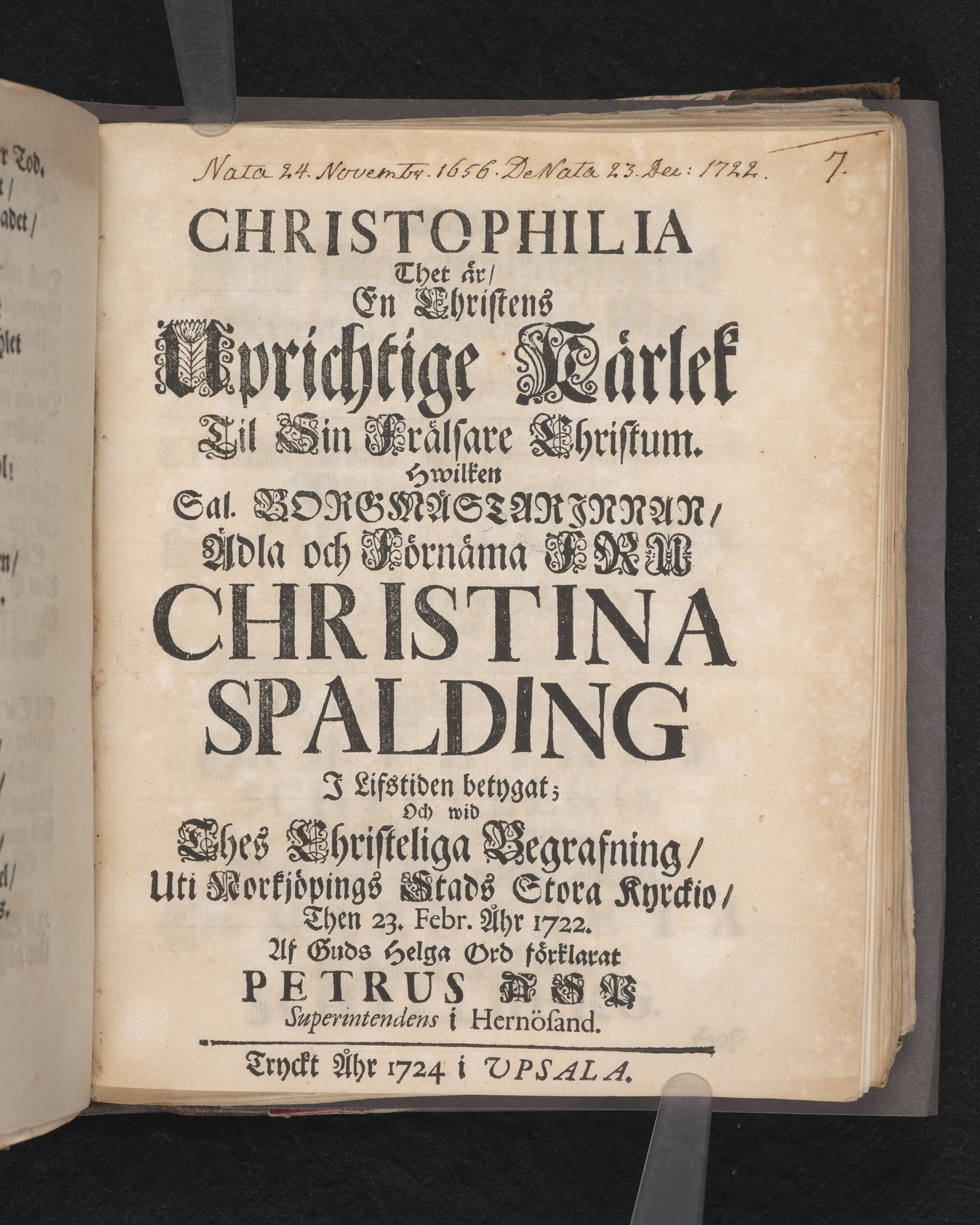 Christophilia thet är, en christens uprichtige kärlek til sin frälsare Christum. Hwilken sal. borgmästarinnan ... Christina Spalding i lifstiden betygat; och wid thes christeliga begrafning, uti Norkjöpings stads stora kyrckio, then 23 febr. åhr 1722 af Guds helga ord förklarat. Petrus Asp ... Tryckt åhr 1724 i Vpsala.