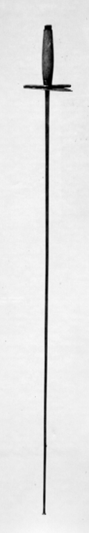 Enkelt fäste bestående av ljus träkavel med rund ovalt tvärsnitt, knapp saknas (förekommen) Parerstänger raka med rundat tvärsnitt och av samma längd som den utanför parerstängerna fästade ovala plana parerplåten. Klinga rak, smal med raktangulärt tvärsnitt och jämt avtagande mot spetsen, som är utsmidd till en tvärställd platta rundad ca 8 mm i diameter. På båda sidor av starka delen punsat i antikvaversaler: "SOLINGEN" åtföljt på sidorna av ett punsat enkelt rakt linjeornament med liten mittcirkel och kantiga ändornament.