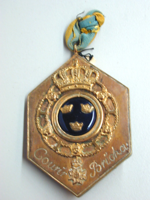 Sexkantig bricka av förgylld mässingsplåt, på framsidan rundel täckt med blå emalj, därpå fäst tre kronor av mässing. Rundeln omgiven av dubbel kant, repstavsring och därutanför slät ring, krönt av kunglig krona, rundeln omgiven av serafimerkedjan med kors. Längs kanten på båda sidor om korset graverat: "Courir Bricka". På baksidan graverat: "N:o 20" samt därnedanför ristat: 1796. Därnedanför samt på övre spetsen öglor av mässing i den övre fäst ett blågult band av sidenmoaré.