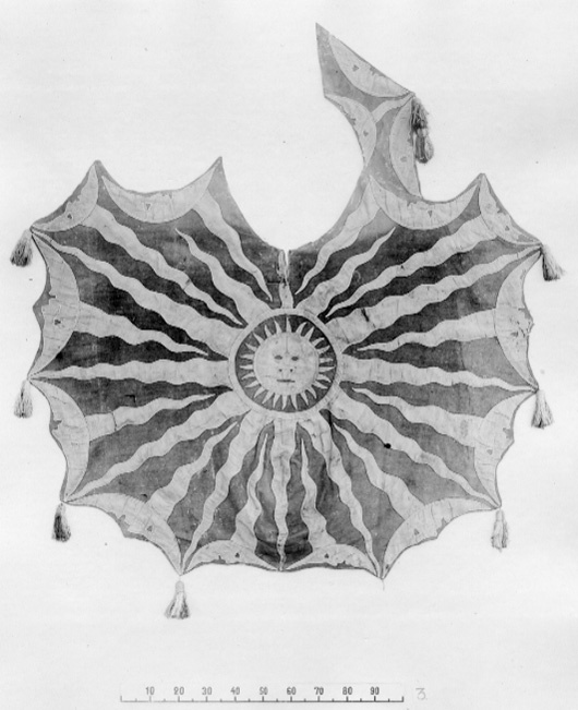 Bottentyg av rött kläde med applikationer av ljusblått taft med ljusa 2 mm bredasilkessnoddar i kanterna, även som konturer av ansiktsdetaljer. Centrerad bildad sol med en diameter på ca 400 mm med tolv utgående vågformadestrålar som är bredare vid basen och spetsiga mot täcktets ytterkanter. Längsytterkanterna tolv bildade månar, åtta större och fyra mindre, och tre stycken påbogstycket, medansikten vända utåt. Från varje månrygg utgår en stråle som spetsigtavslutas mot solringen. Varannan stråle går mot solen och varannan ifrån. Bogstyckethar en liten stråle. Vid den strålens spets en tofs och i täckets sidor avslutasvarje stråle från solen med en tofs, 150 mm lång med snodd, av silke i brunt, beige och blått, de övre 35 mm har ett sammanhållande nätverk. Fyra tofsar i vänster sida,tre i höger och en saknas. Längs bogstyckets ytterkant och i ytterkanten längs första vänstra månasiktet genombottentyget och fodret sex parvis sittande hål kantade med kaststygn, ca 4 mm idiameter. I slutet av bakre kantens mittstråle två likadana hål. Diagonaler, bogstycke 740 mm. Foder av blått linne i tuskaft, vådbredd 800 mm.