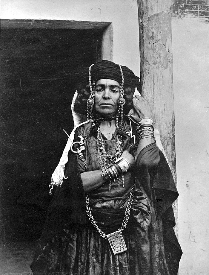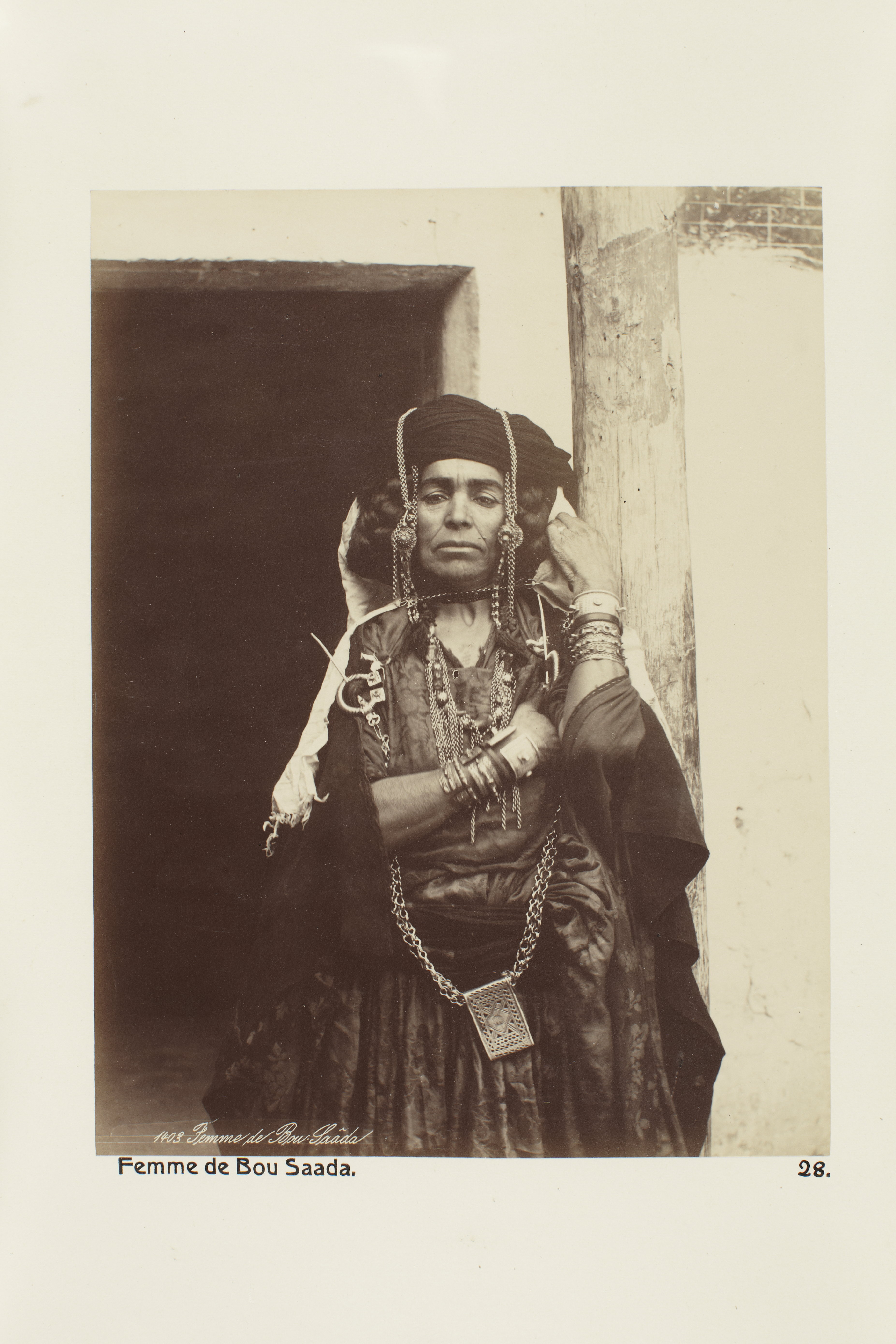 Algeriet. Kvinna från Bou-Saada. Foto från resa genom Algeriet och Tunisien samt åter över Schweiz, 11 februari - 19 maj 1889. Samtliga foton i gruppen LXVI:F. är inköpta av Wilhelmina von Hallwyl i Alger, Biskra, Tunis, Constantine, Oran och Blidah vid hennes vistelse i nämnda städer tillsammans med sin make, Walther von Hallwyl, sin mor, Johanna Kempe, f. Wallis, dottern Irma samt fröknarna Caroline Pflaum och Ida Uhse. Uppgifterna kommer från fröken Ida Uhses reseanteckningar.