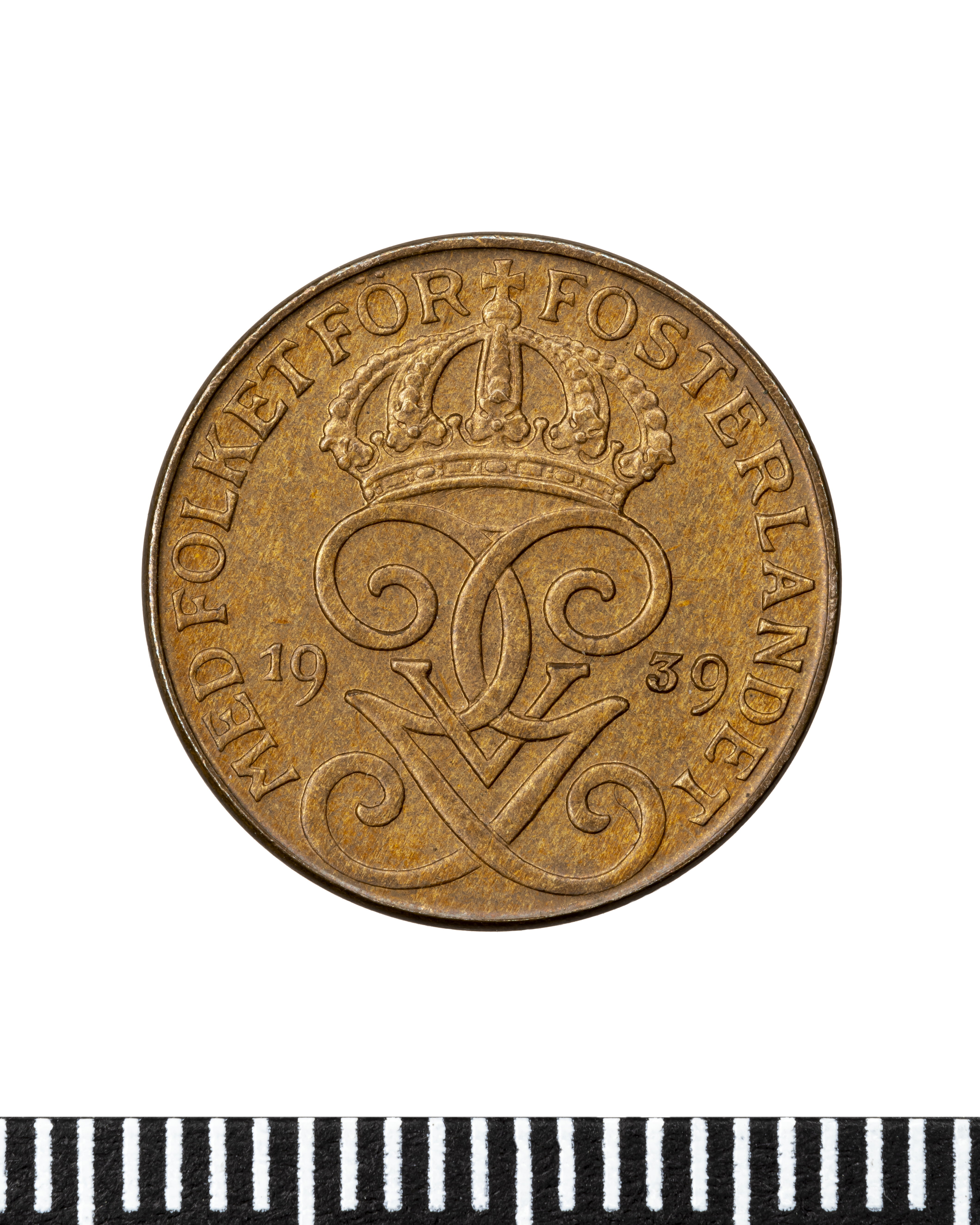 Upphov: Gustaf V av Sverige. Media: Mohr, Jens. Ekonomiska museet - Kungliga myntkabinettet/SHM, (CC BY 4.0) Du får bearbeta och dela verket för alla ändamål, även kommersiella, så länge du anger upphovsperson och licensgivare.