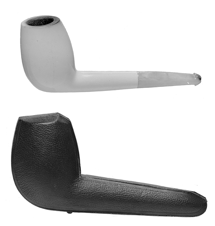 TOBAKSPIPA (s. k. snugga) med etui. Av vit piplera och bärnsten. Huvud äggformigt, med rakt avskuren mynningskant; från botten utgår i trubbig vinkel ett rundstavigt rakt jämngrovt skaft. Munstycke av bärnsten. Längd: 4,1 cm. Huvud, höjd: 5,8 cm.; diameter: 4 cm. Etui (original): Klätt med pressat svart skinn (chargin) samt fodrat med röd sammet och rött siden (atlas). Längd: 15,4 cm.; bredd: 7,4 cm.; tjocklek: 4,8 cm. Inköpt av Walther von Hallwyl under 1890-talets senare hälft hos Hoflieferant Fr. Rosenstiel, Unter den Linden, Berlin.