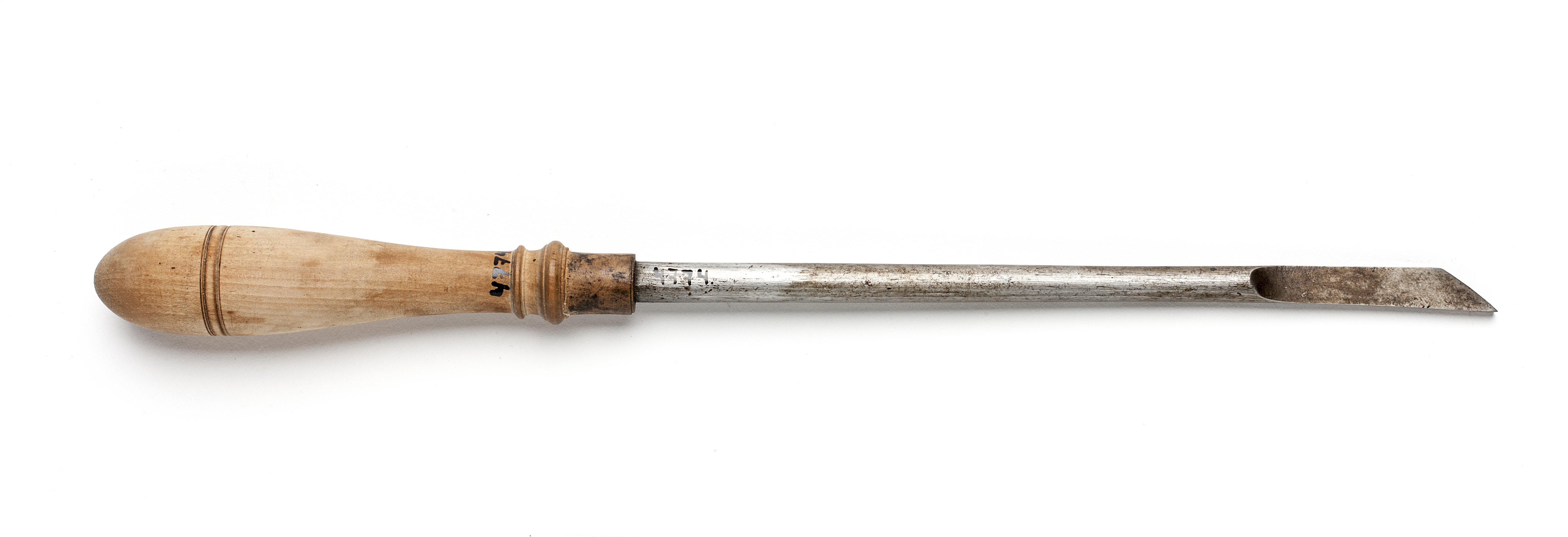 Rund klinga, i änden med rektangulär genomskärning. Svarvat skaft av päronträ med två vulster nedtill ("skoklostertyp"). Ringen bortfallen.