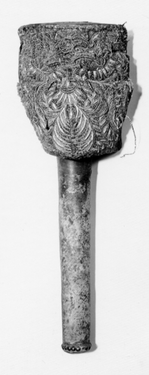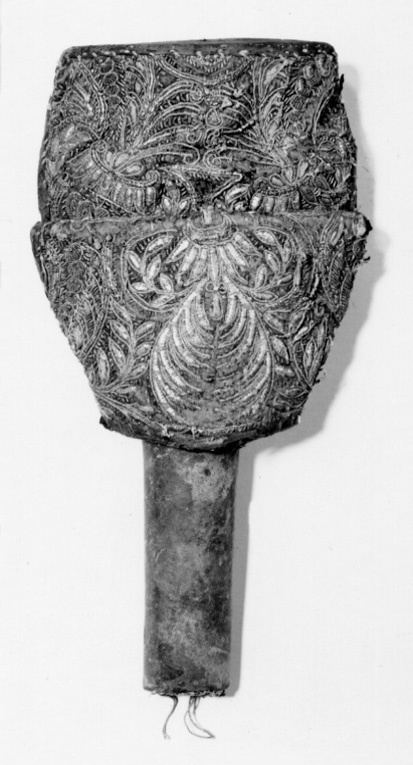 Hölster överklätt med ljusbrunt skinn. Rektangulär kappa, klädd med röd sammet och yttäckande broderi med silverlan och silvertråd i form av rankor och blad. Nedtill en krans med 17 ståltännlikor. Upptill på insidan två vertikala hällor för hölsterrem.