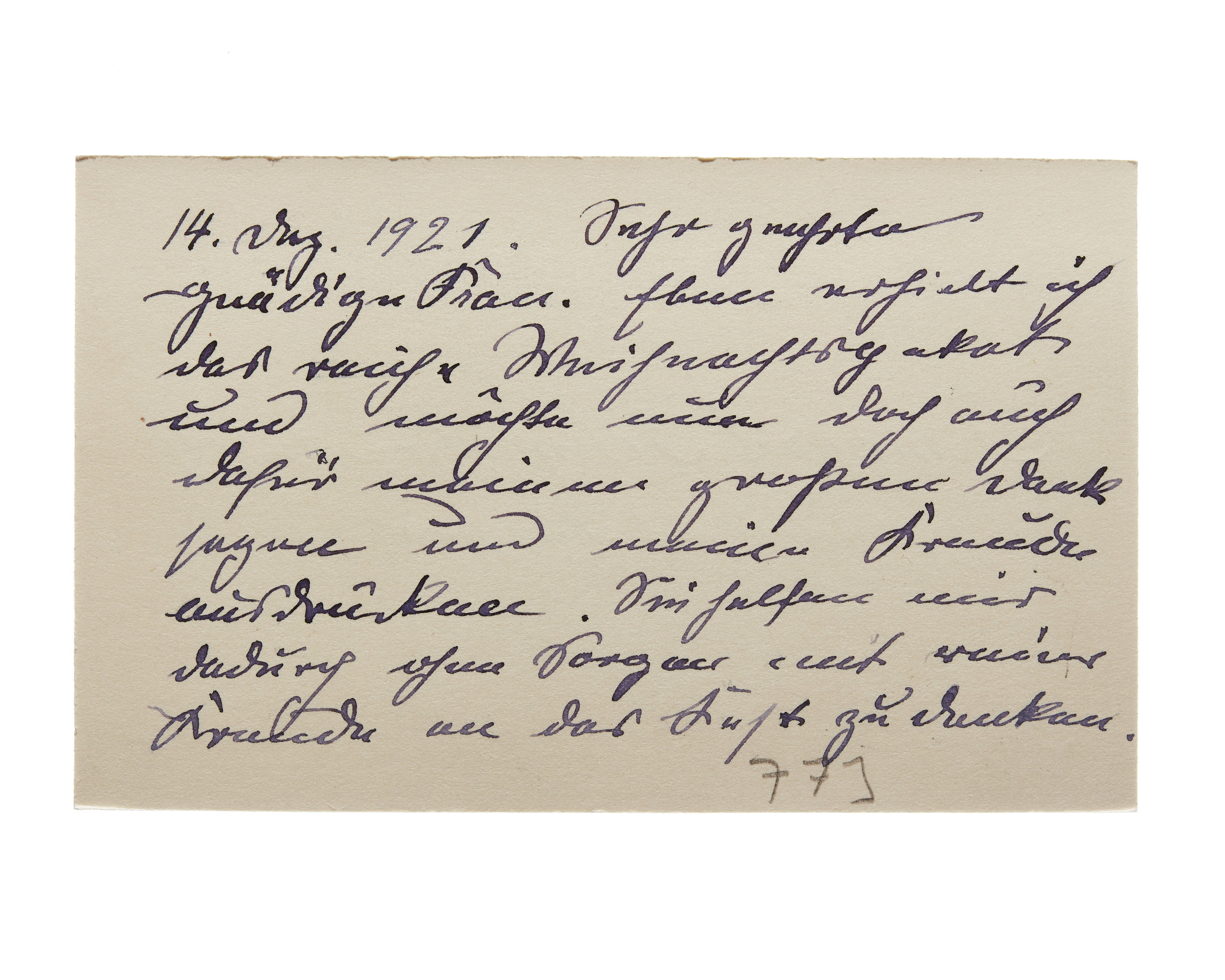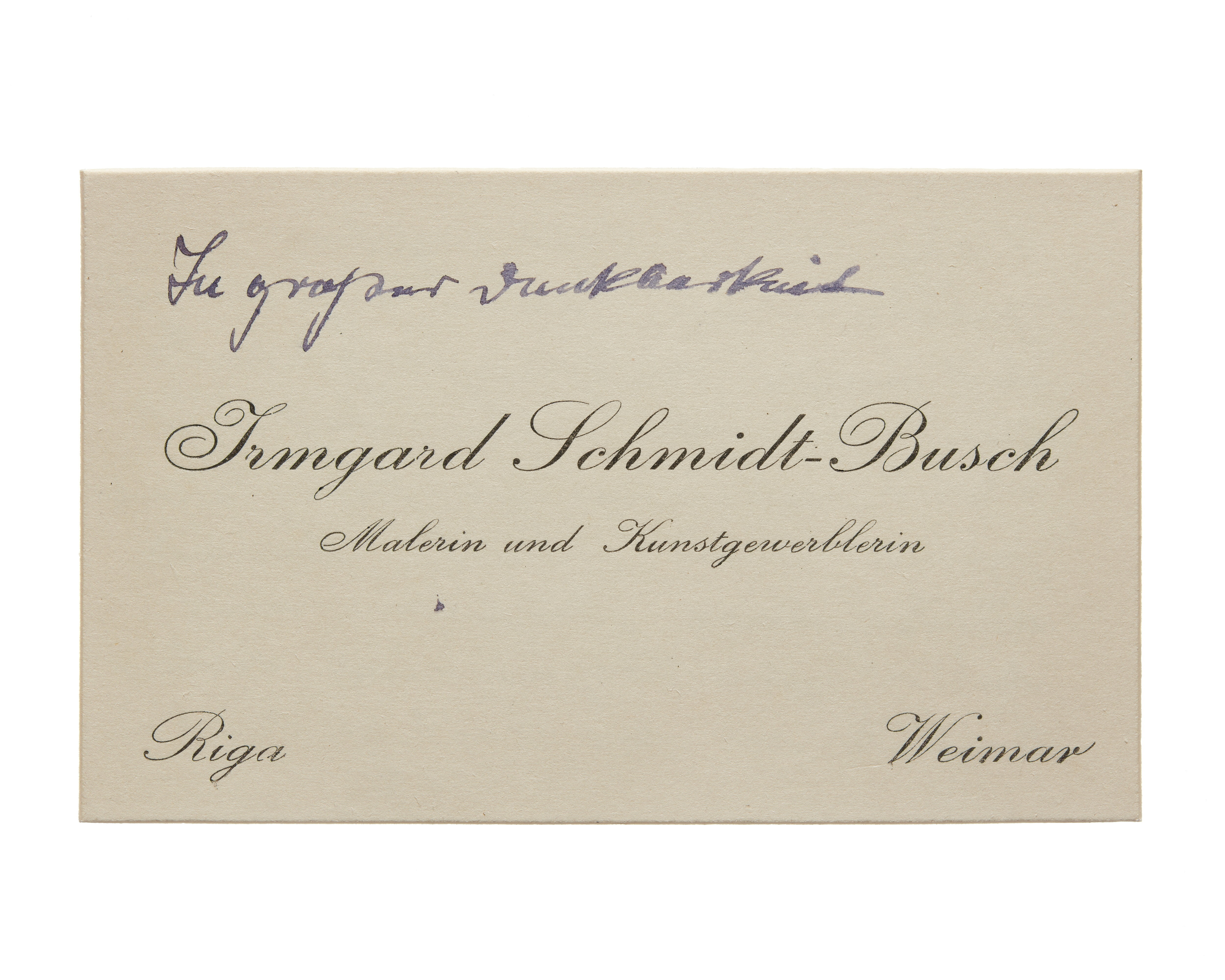 Ett visitkort från Irmgard Schmidt-Busch, Malerin und Kunstgewerblerin. Adress (nedre vänstra hörnet) Riga, (nedre högra hörnet) Weimar. Med handskrift. Daterat 1921.