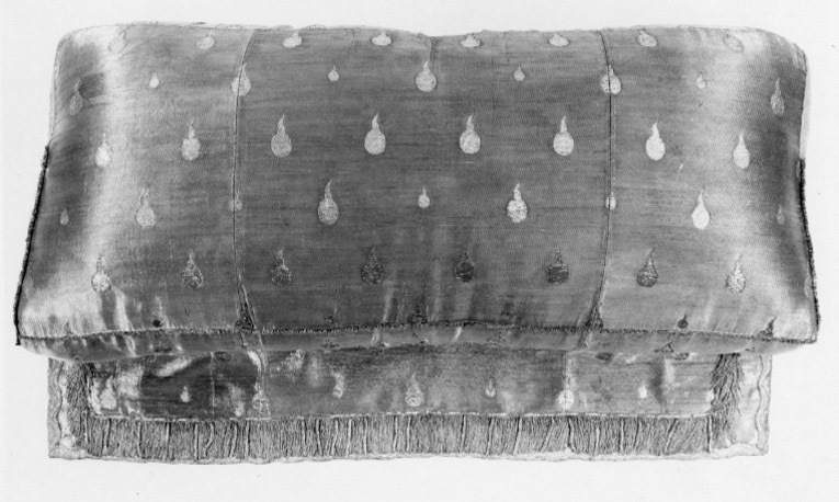 Rektangulär, stoppad, dyna med nedhängande kappa. Till sittplats längst fram i Kröningsvagnen. Dyna och kappa av silverbrokad med invävda flammor av förgylld silvertråd. Dynans överdel ihopsydd av tre våder, mellandelen av fyra våder och kappan av fyra våder. Kappan fodrad med vit parkum. Dynans undersida sida samt halva sidan fodrar med vit parkum. Kappan kantad av vågmönstrad silvergalon. Ovan denna, 8 cm upp, påsydd silverfrans med buljoner. De främre sömmarna samt sidosömmarna kantas av trind guldfrans. Sittdynorna var ursprungligen klädda med ett slätt odekorerat silvertyg. Till kröningen 1751 kläddes de om med ett nytt silvertyg med broscherade guldflammor samt stoppningen av dun tillökades med tagel och bomull.