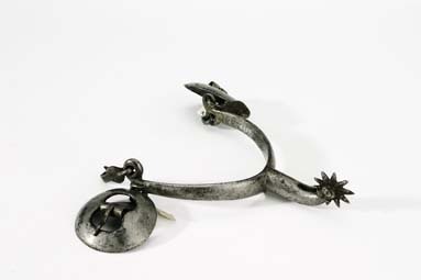 Sporre av förtent stål. U-formade skänklar baktill en uppåtriktad spets. Skänklarnas ytterändar har två öglor, nedåtböjda. I öglorna är fäst en rund sölja med bred platta och en kläpp. Böjd sporrhals 45 mm lång med klinga av stål, 10 taggar.