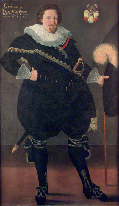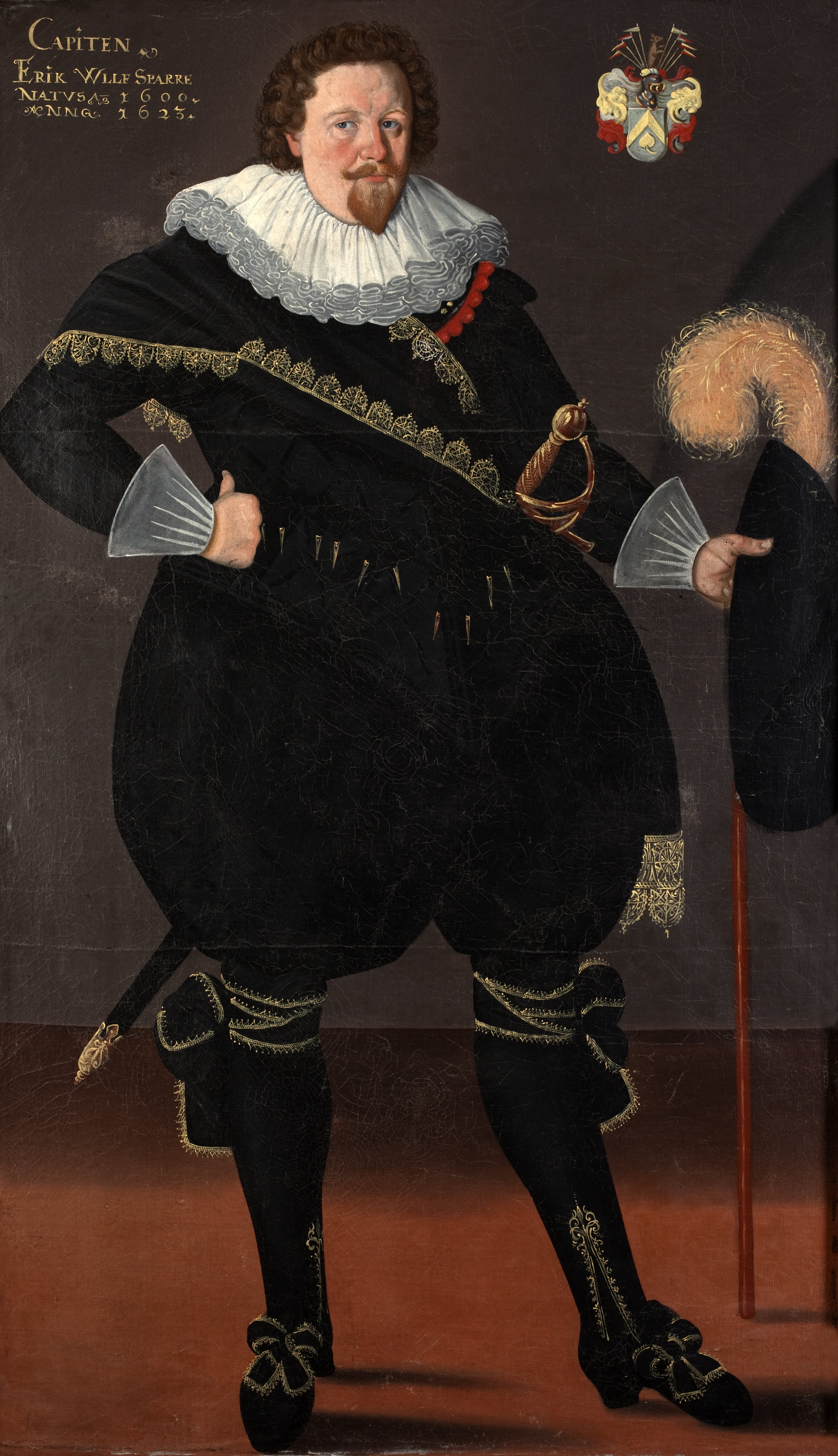 Helfigur , stående , fas höger , höger hand i sidan , vänster hand håller käpp och plymagerad hatt. Svart tröja med skört och pluderhosen. Stor nedvikt pipkrage , svart axelbindel , värja , svarta strumpor och skor. Inskrift överst t.v : " CAPITEIN ERIK WLLF SPARRE NATVS Ao 1600 ANNO 1623 ". I övre högra hörnet vapensköld med blad under sparre. Spikad på ram , fastskruvad vid väggen.