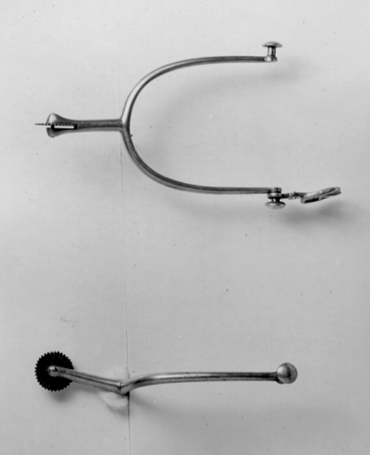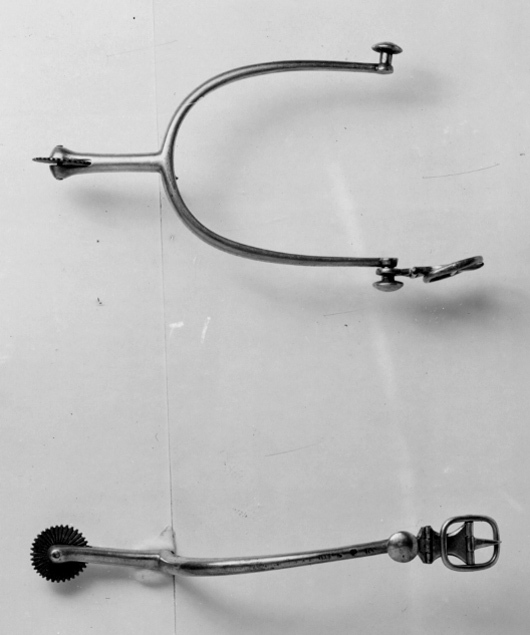 Sporre av förgyllt silver. U-formade skänklar med runda, plana knappar på hals på ytterändarna. Kring den ena knappen sölja med gångjärn. På ytterskänkelns yttersida svenska silverstämplar: "HG" (?) tre kronor och "B3" el. "R3". Rak sporrhals, 38 mm lång, med klinga av stål med små taggar och räfflad.