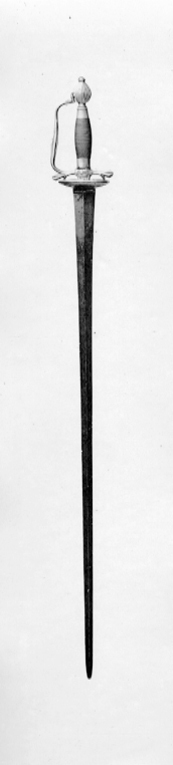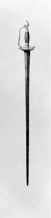 Fäste av förgylld mässing av efterkarolinsk typ. Utmed kanterna på parerplåtarnas utsida graverat i skrivstil: "För visad mandom mot Rikets Fiender 1790 under Kriget mot Rüssland Gifvit af Konungen till Liut. Sandberg". Kavel lindad med tunn, tvinnad koppartråd, breda, ringformiga beslag av förgylld mässing upptill och nedtill. Klinga rak, tvåeggad, slipad med mötande, jämnbreda skär. Invid fästet etsade rokoko-ornament.