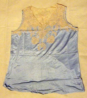 Pyjamasjacka av ljusblå charmeuse. Ärmlös. Jackan är upptill helt bestående avmaskinknypplad tyllspets. Motiv av blommor, rankor och blad. Jackan är nedtill skuren istora "vågor". I sidorna två hällor för skärp. På vänster framsida Sibyllas monogram:ett krönt S.