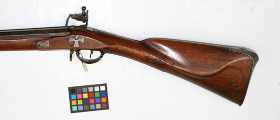 Slätborrad, brunerad pipa av stål, urfräst vid mynningen, kammaren åttsidig, pipans främre del mångsidig med smala sidor. På kammaren graverat: "Denna åmfilta Kist pipa har i 60 åhr varit brukad till stöd i en spis i Cronobergs län". Den del av pipan som döljs av stocken är obrunerad. Två mångkantiga rörkor. Riktmedel: Brunerat sikte på det blanka svansskruvbladet, stolpkorn av silver. Fästning: Ett häfte, ett pipstift av stål. Flintlås med plant låsbleck med försänkt bakspets. Plan s-formig hane med stor hanskruv, lös överkäke, päronformig käkskruv. På låsblecket nedanför den kantiga fängpannan graverat: "M. GIÖTER". Batteri med åsad eldstålsrygg, uppåtsvängd stötklack, batterifjäder med droppformigt löv. Fästning: Två låsskruvar. Halvstock av valnöt med kolv av fransk typ med snidat kindstöd, kolvlådelock med inskuret tumgrepp, snidade blad bakom svansskruvbladet. Näsband av horn. Beslag av stål, bakplåt med rakt avskuren tunga. Asymmetriska låsskruvbrickor, den bakre i form av T med vidgade armar, den främre med en bakåtriktad, vidgad arm. Mångkantig spetsrörka med tvär, fasad spets. Brunderd varbygel med fasade sidor, enkel bygel, långa armar med tvärt avskurna ändar. På främre armen finns en rembygel av stål. Tillbehör: Laddstock av trä, l: 946 mm, skodd med horn.