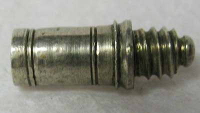 Tillverkad i silver, cylindrisk med enkel ekor av skurna linjer. Ena änden ihålig med invändig gängning, andra änden tappformig och gängad.
