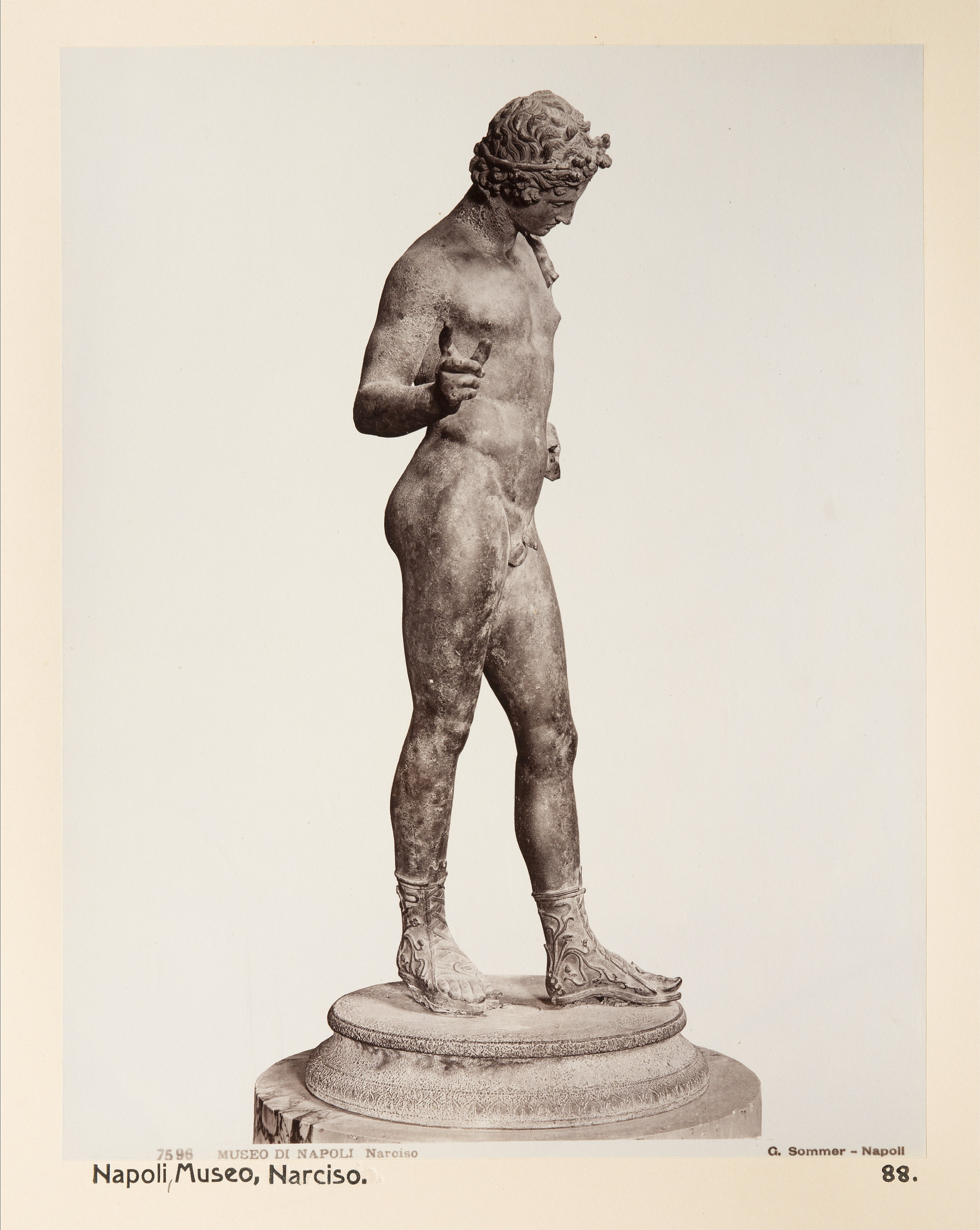Skulptur föreställande Narcissus, Neapel. Fotografierna LXVI:E.01.-198. är inköpta av Wilhelmina von Hallwyl, f. Kempe, i Rom, Neapel, Taormina, Syracusa och Palermo under en resa tillsammans med maken Walther von Hallwyl, modern Johanna Kempe, dottern Irma samt fröknarna Caroline Pflaum och Ida Uhse. De reste till Rom och Neapel, genom södra Italien och Sicilien och åter över Schweiz, 28 januari-11 maj 1888. Uppgifterna kommer från Ida Uhses reseanteckningar.