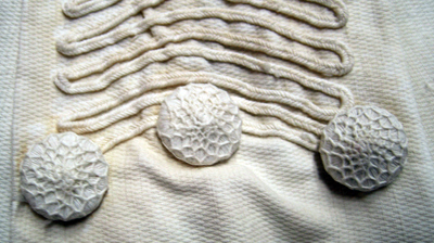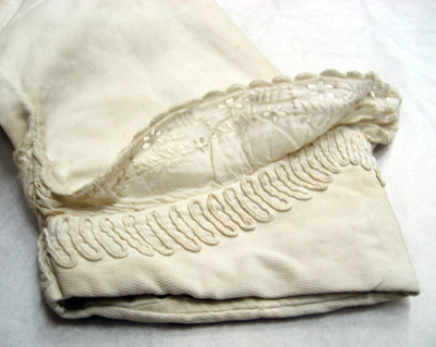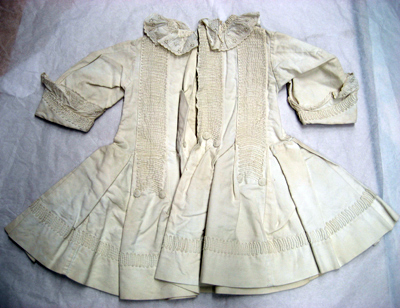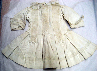 Kolt av vitt bomullsatlasmed skärning i midjan och en vid, veckad kjoldel. Kolten garneras fram av tre breda band fram samt fyra bak. Banden är av koltens egna tyg som sedan sytts fast. På vardera band förekommer en dekor av en smal vit snodd i ett ringlande mönster. Nedtill vid vardera bandända sitter två eller tre dekorknappar klädda med vit silketråd och med galler av vit silketråd. Kjoldelen garneras nedtill av ett band av ringlande vita snoddar. Kolten är öppen i ett sprund mitt bak från halslinningen och ned, l. 275 mm. Sprundet knäpps med sex knappar klädda med vitt bomullstyg samt motsvarande öglor av vita snoddar. Kolten har en rundad halsringning vid vilken sitter påsytt en volang av vitt bomullstyg. Volangen har uddformiga kanter samt en blomdekor av ett vitt plattsömsbroderi samt hålsöm. Vid halslinningen sitter på höger sida ett kort vitt bomullsband. Ärmarna är långa med uppvikta slag, b. 70 mm, vid vilka sitter påsytt samma slags vita volang som vid kragen. Kjoldelen kantas nedtill, på insidan av en bred fåll, b. 57 mm.