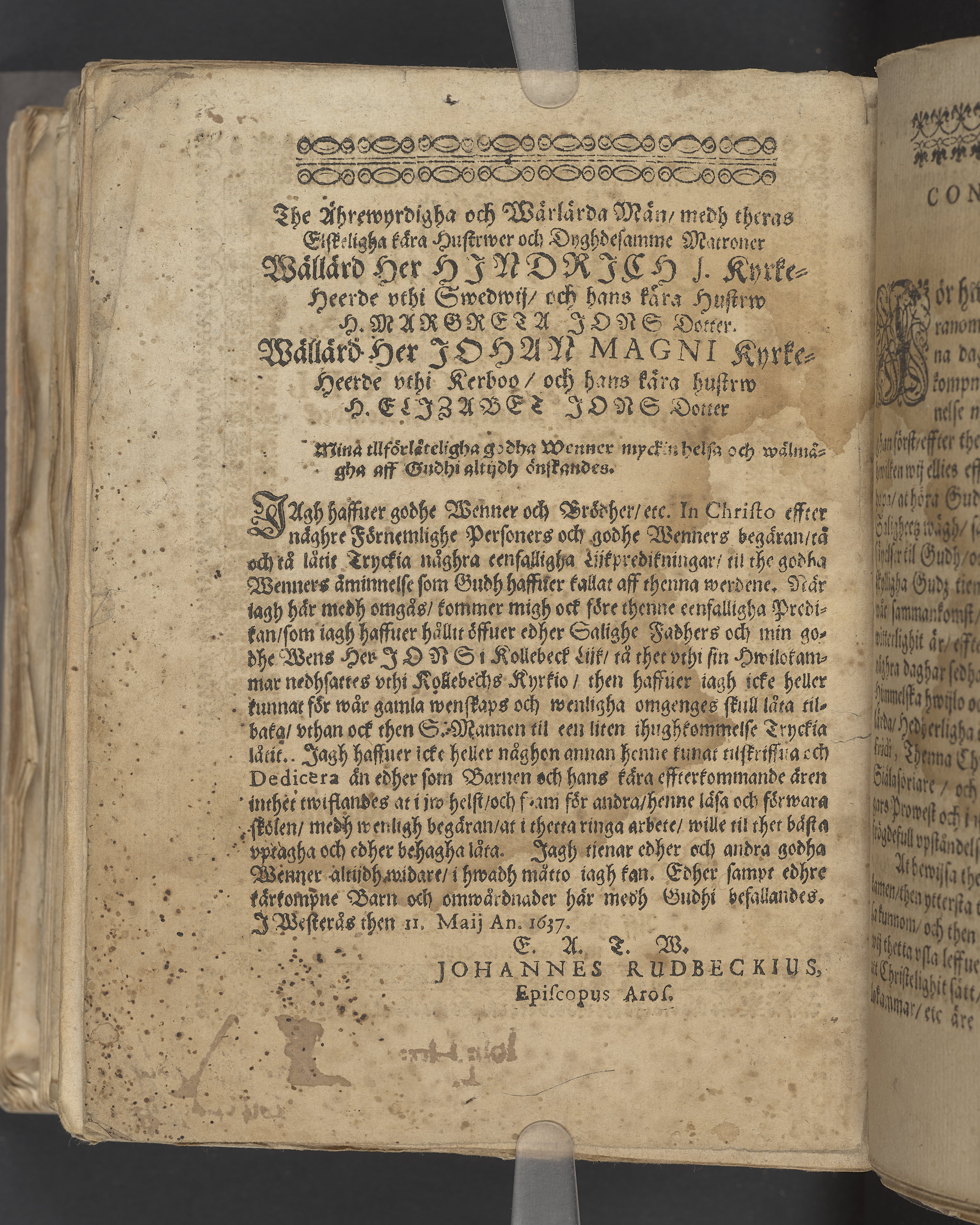 Een christeligh lijkpredikan, hållin vthi ... Dn. Ionæ Sigfridi, kyrkeheerdes och prowestes vthi Kollebeck begraffning. Aff D. Johanne Rudbeckio, biskop vthi Westeråås. Then 12. nov anno Christi 1626 ... Tryckt i Wästerås A. D. 1637. Aff Peder Erickson Wald, medh Capitels tryck.