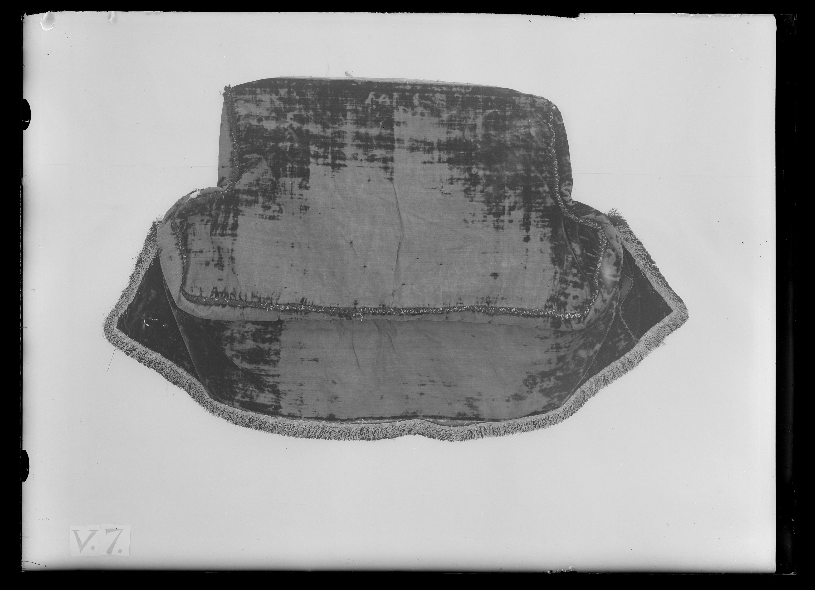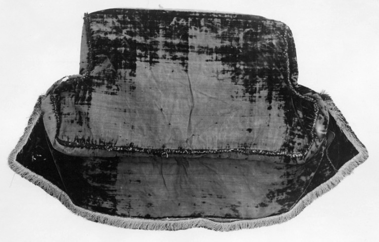 Överplatta, botten och nedhängande kappa av svart kyprad sammet. Underplatta av ljusbrunt läder. Dynan inuti fodrad med gles tuskaftsväv av hampa. Nedhängande kappan av fodrad på blått, glättat linne. I kantens sömmar, ej mot lädret, en 13 mm bred frans av svart silke och silver. Längs nedhängande kappans sidor och nederkant en 35 mm bred frans i två lager, den undre av svart silke, övre av silver. Linnefodret vikt upp över sammetens tio mm breda gulbrunrandiga rödkantade stadkant, därpå är fransen fästad. En läderrem 165 mm lång, 20 mm bred med fem hål och avslutad i vinkel är fästad på lädersidan ungefär mittpå och 130 mm från överkanten. I nedre vänstra hörnet är på linnefodret en papperslapp fästad, med texten. No 20.