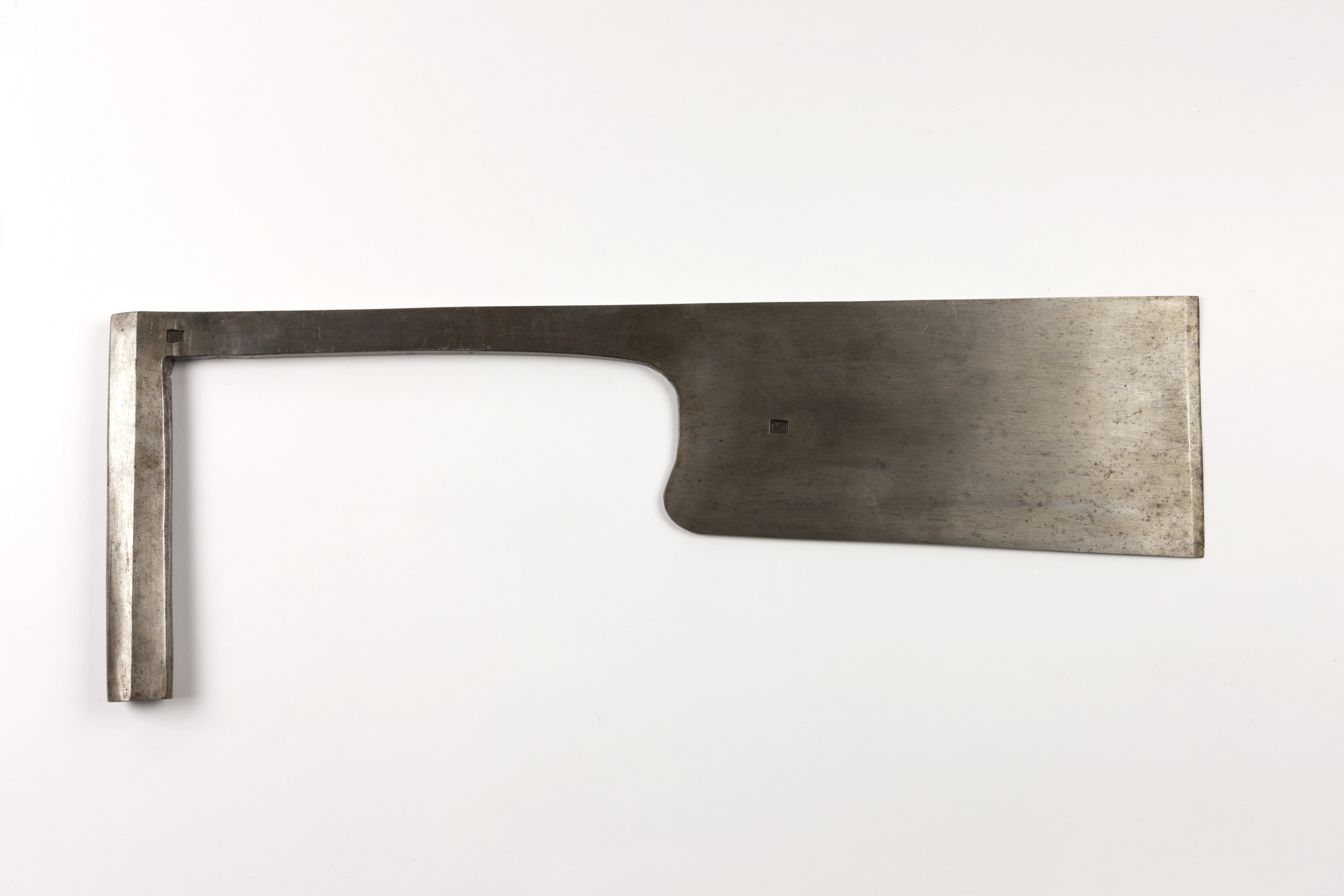 Holländskt standardverktyg för hustimmermän. Smal, sexkantig skafthylsa (holk), sluten i övre änden. Bladet stämplat två gånger med kryss i en rektangel. I varje triangel en punkt. Nedtill på skafthylsan skrivet "7" med svart. Har troligen aldrig haft något skaft.