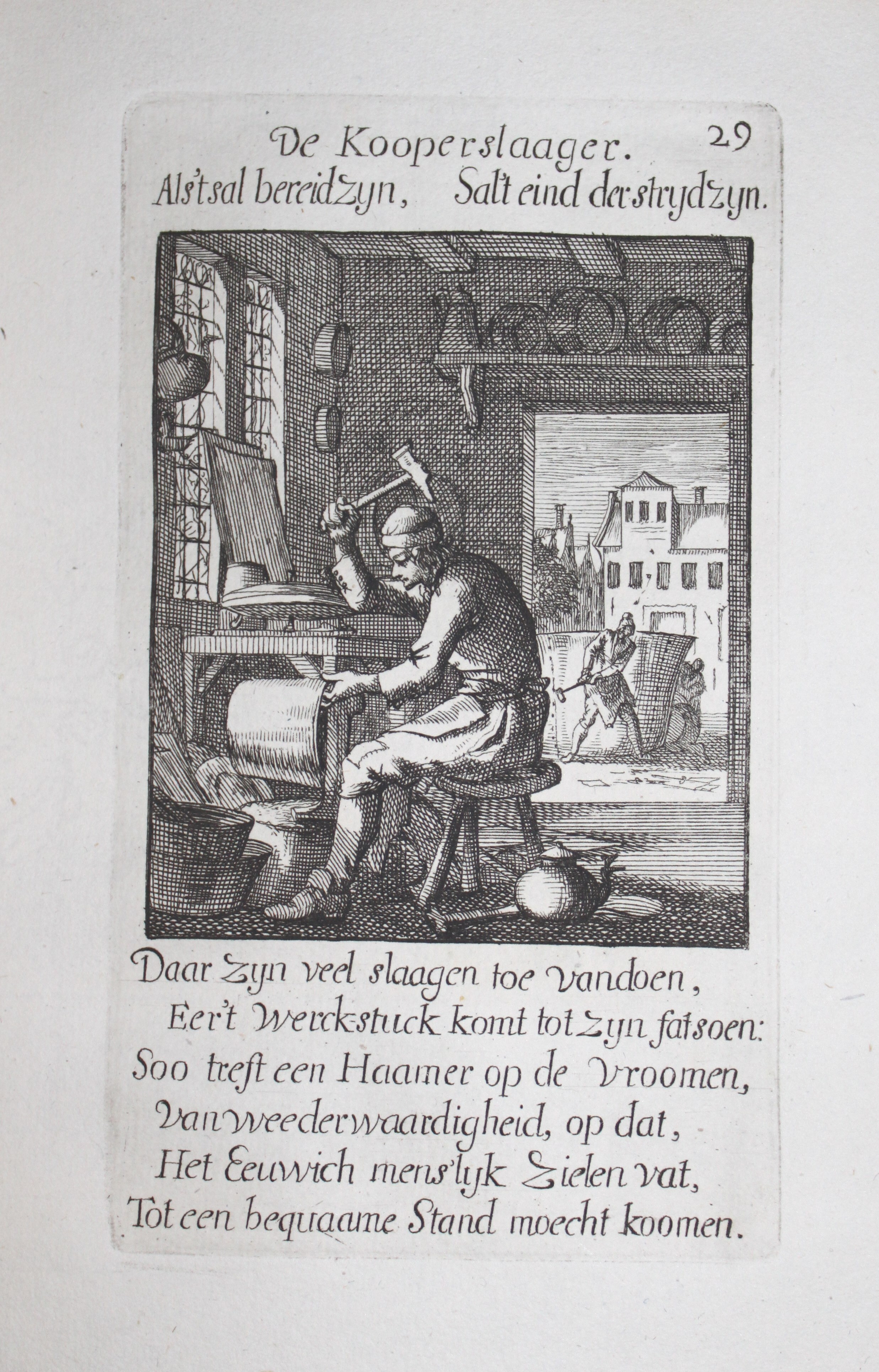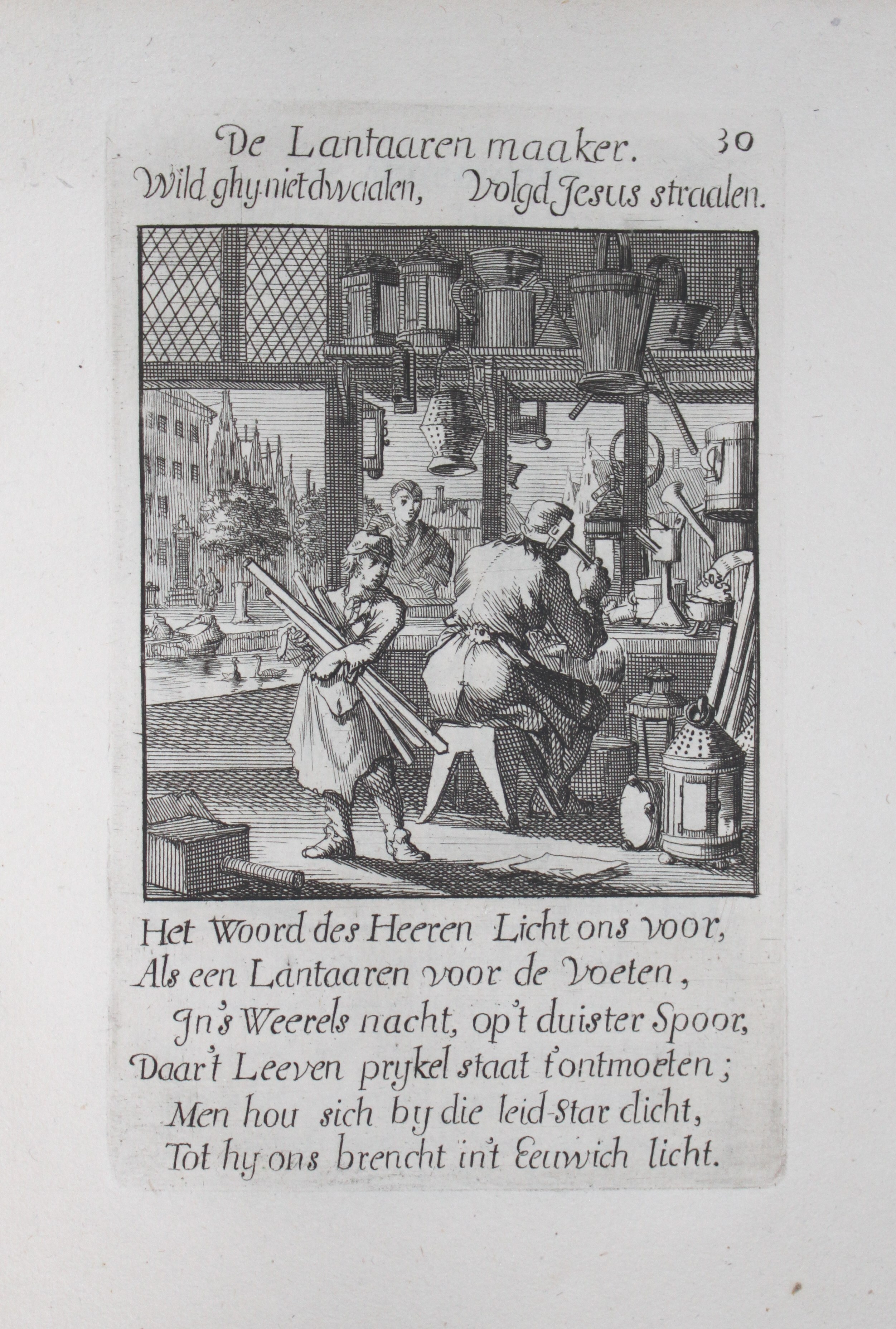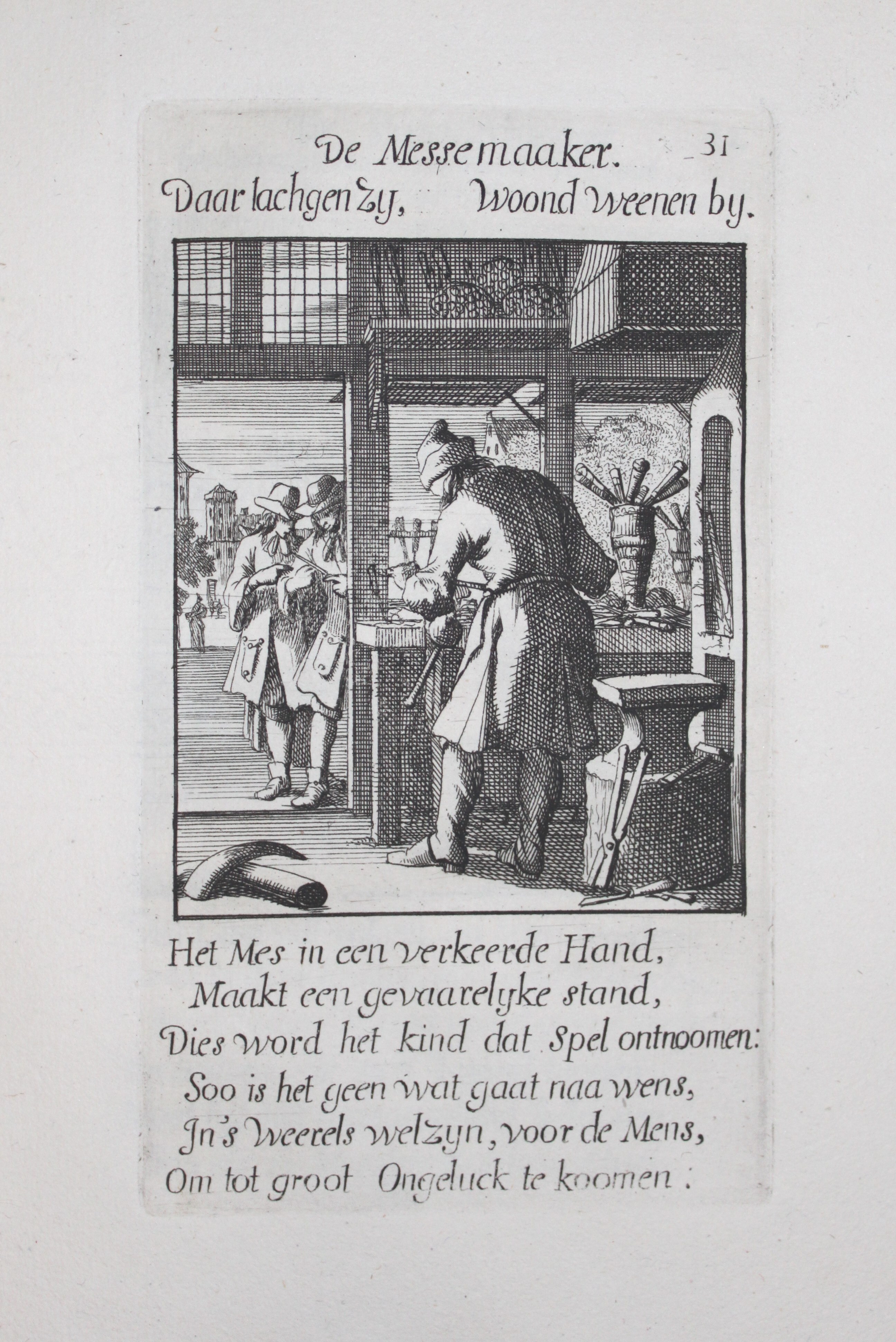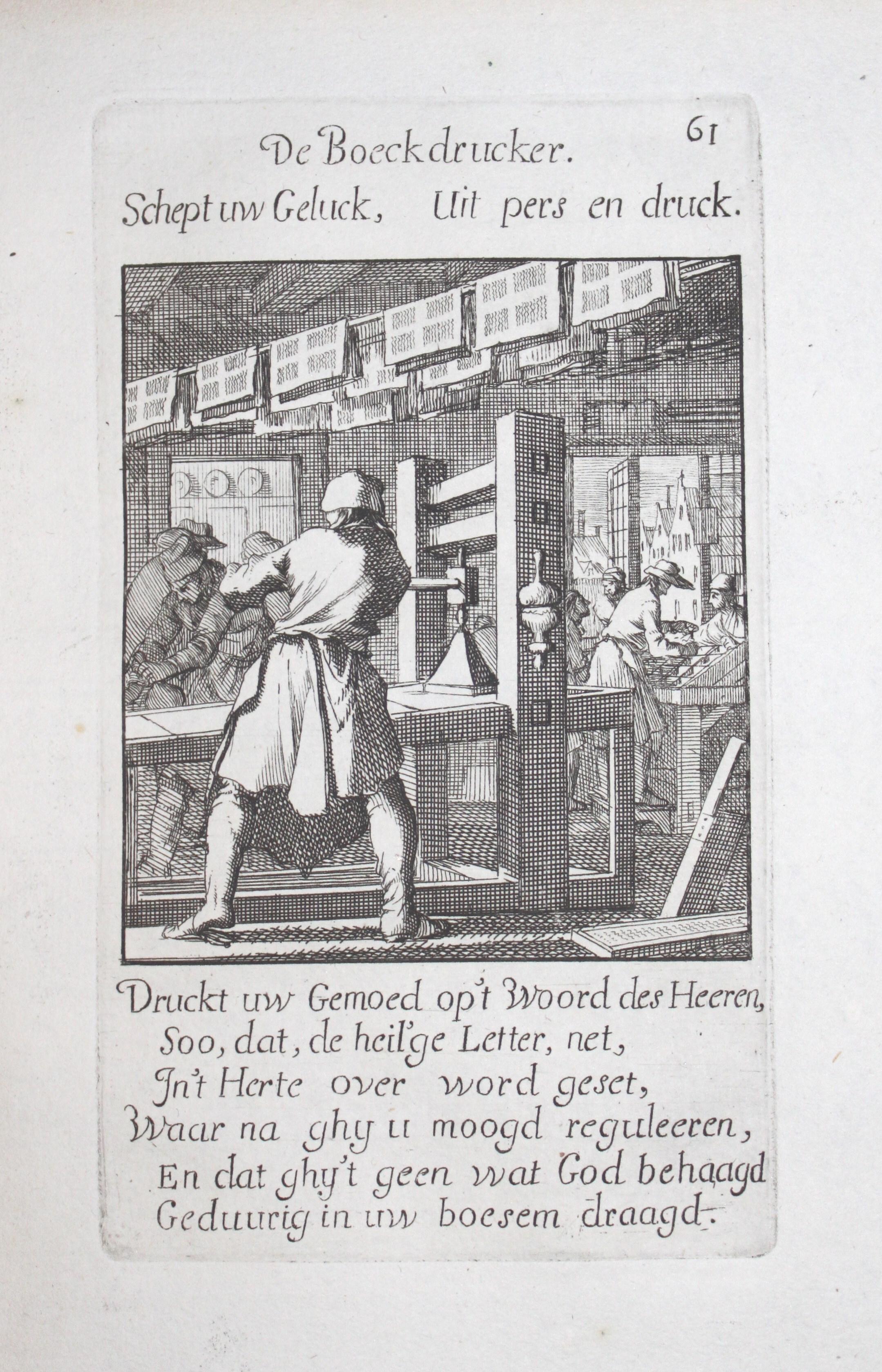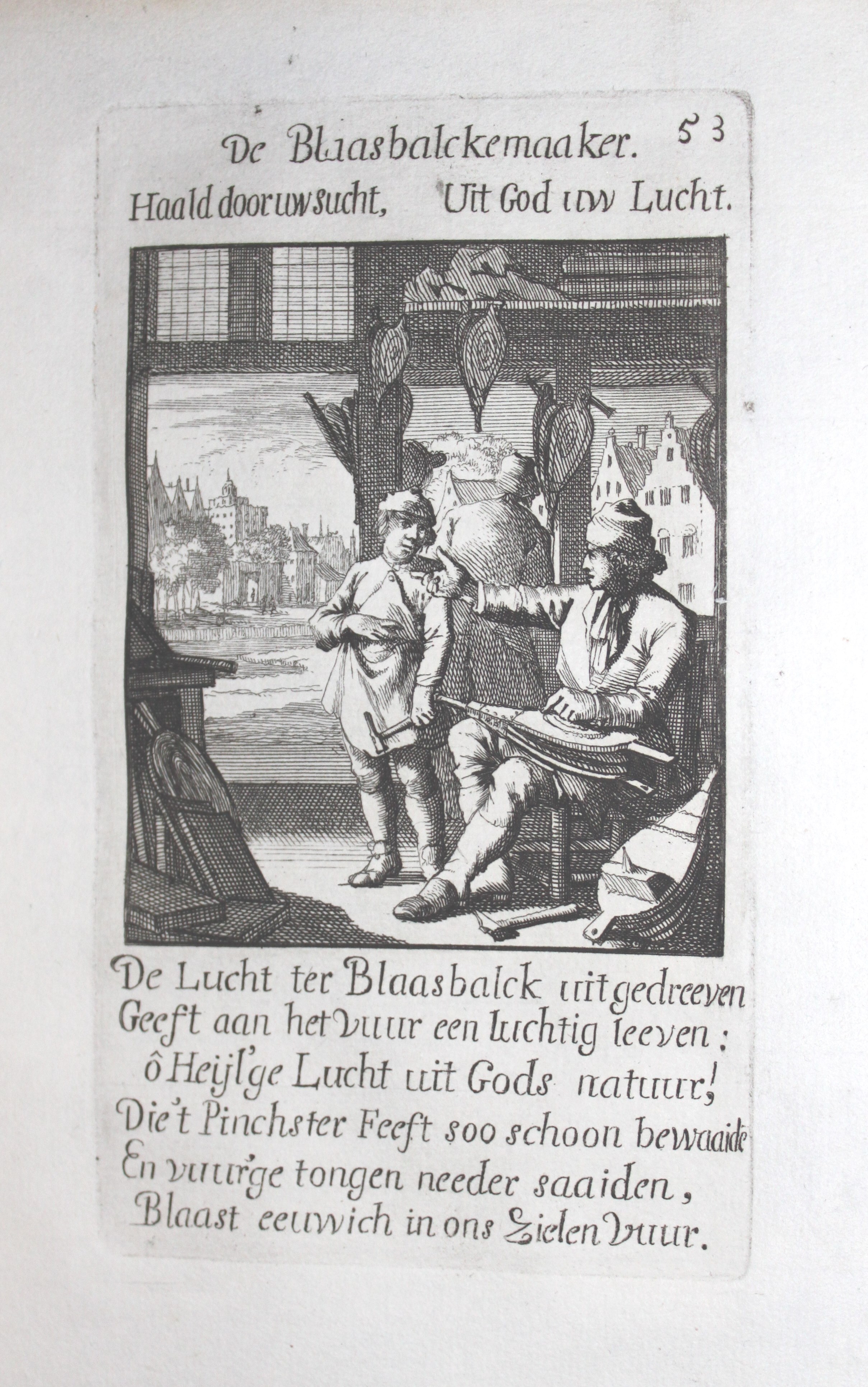 Het menselyk bedryf vertoond in 100 verbeeldingen van ambachten, konsten, hanteeringen en bedryven; met versen ... t' Amsterdam. Gedaan door Johannes, en Caspaares Luiken. 1694.