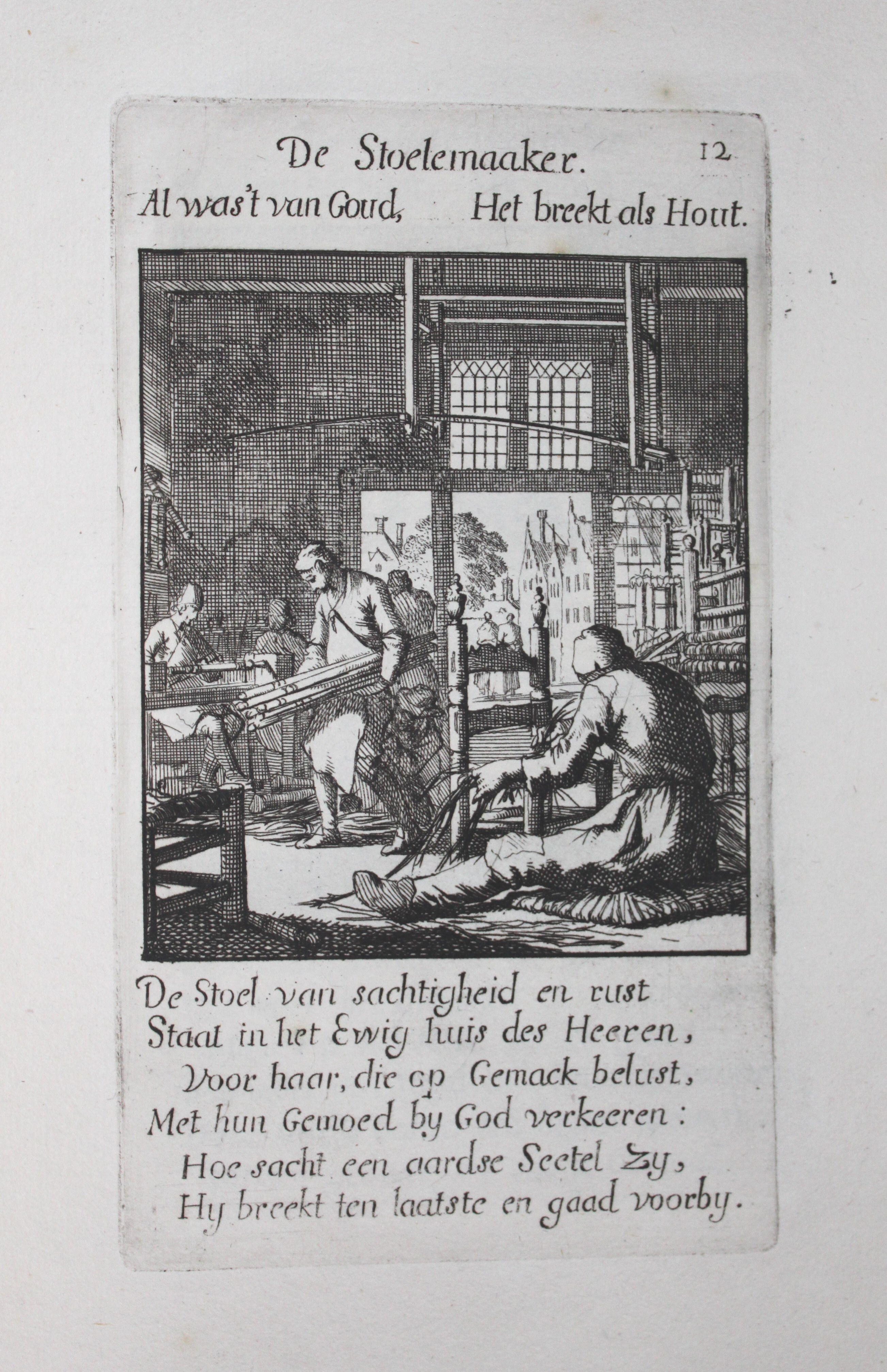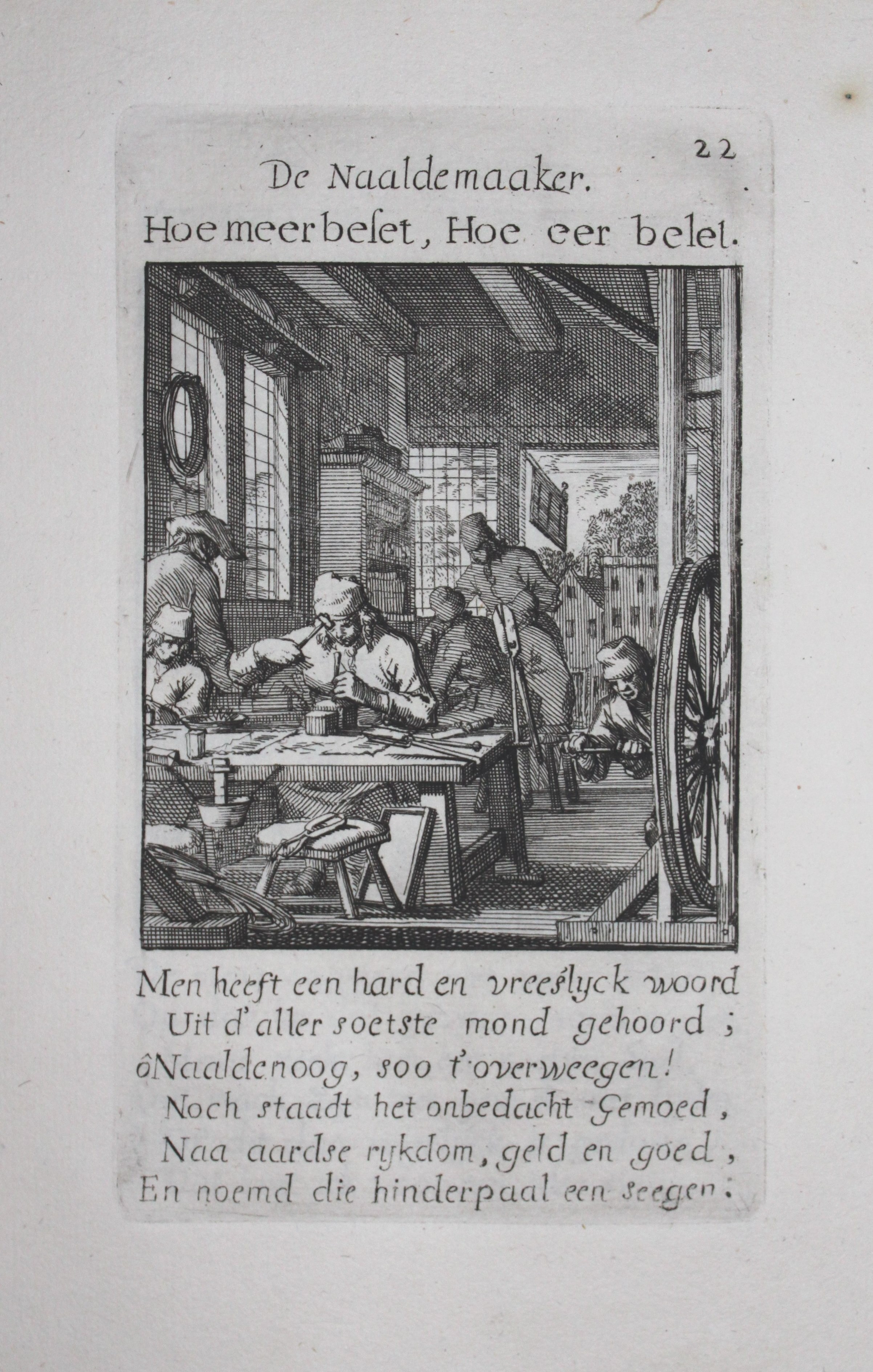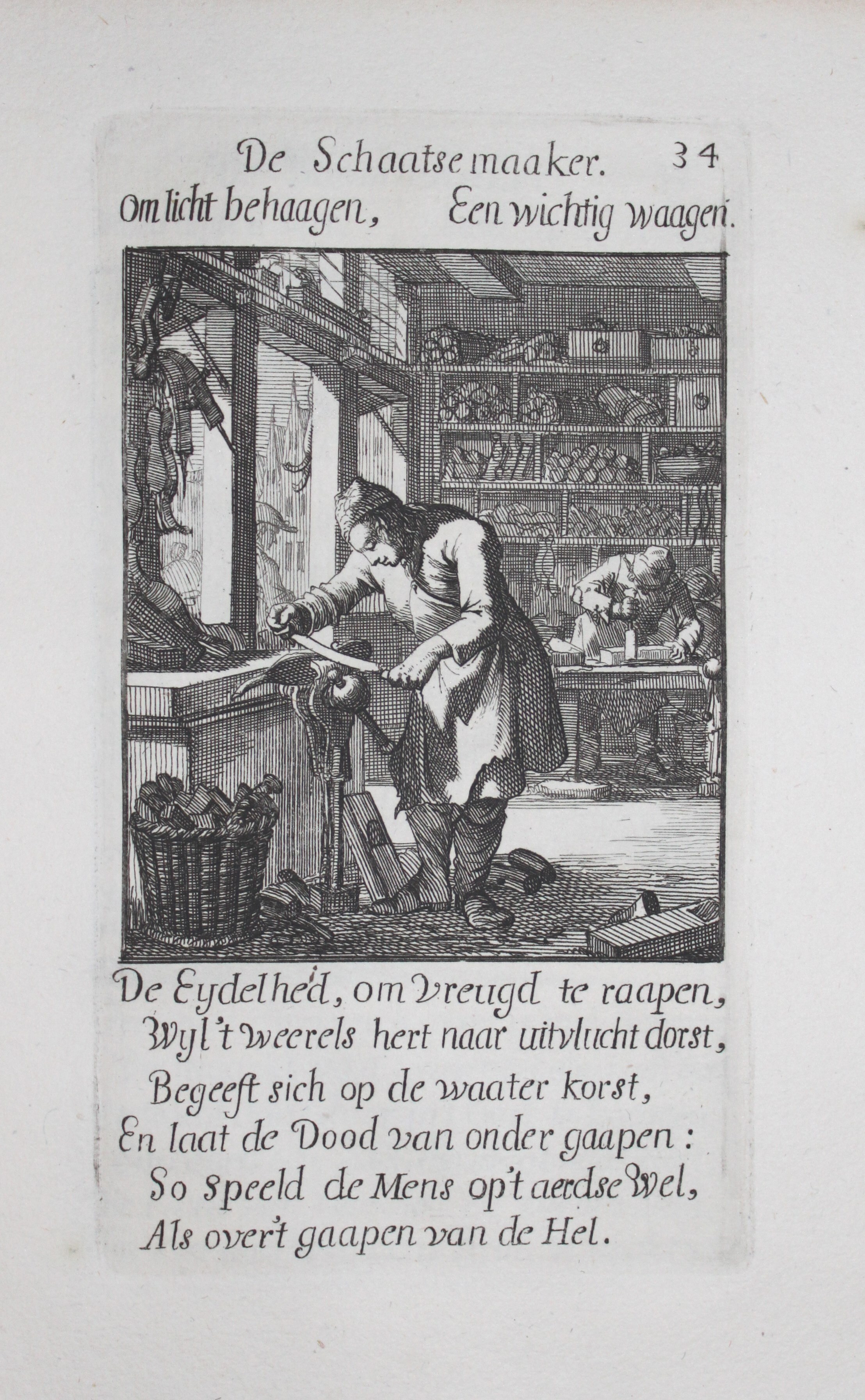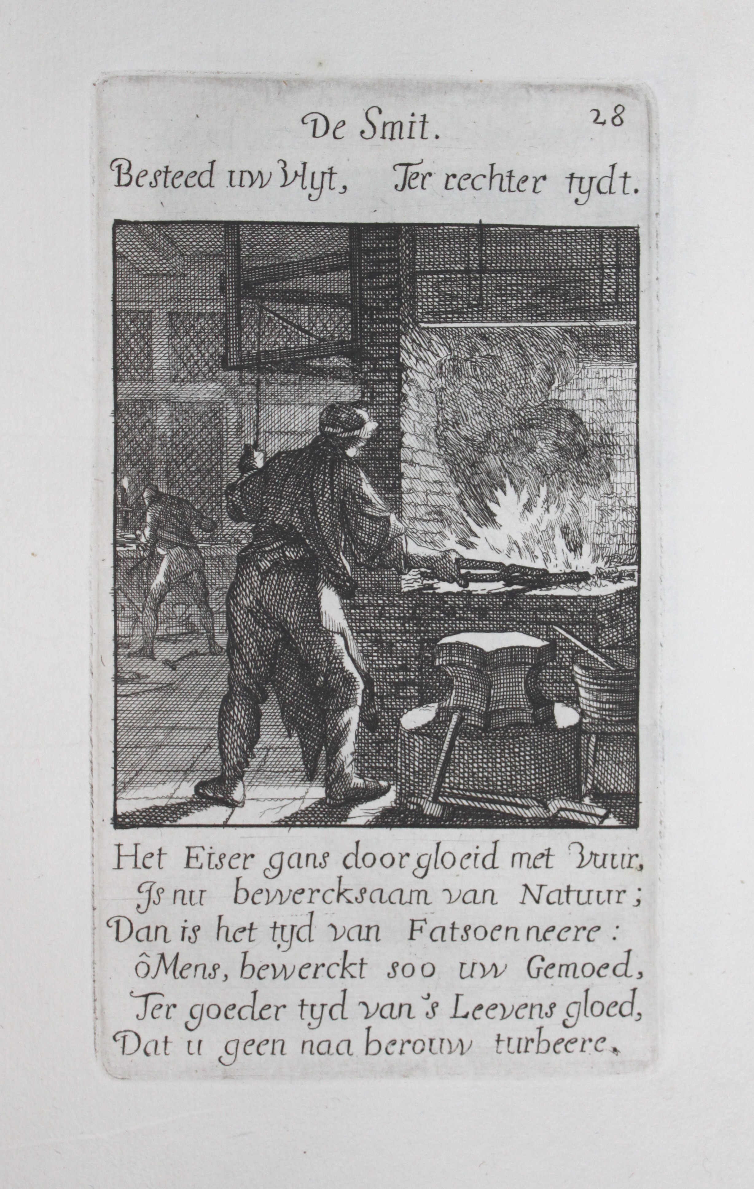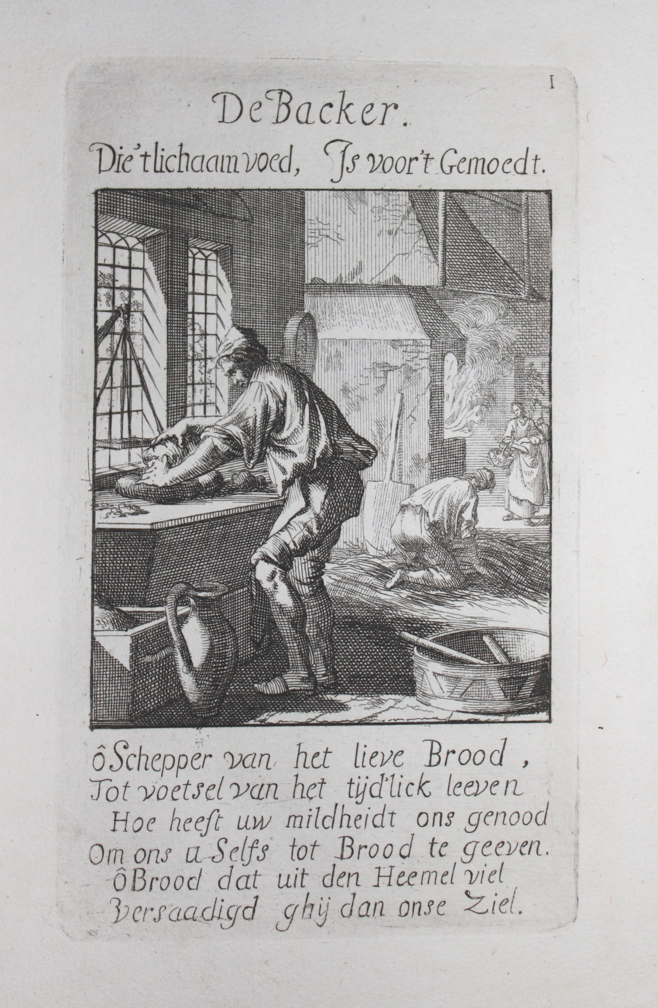 Het menselyk bedryf vertoond in 100 verbeeldingen van ambachten, konsten, hanteeringen en bedryven; met versen ... t' Amsterdam. Gedaan door Johannes, en Caspaares Luiken. 1694.