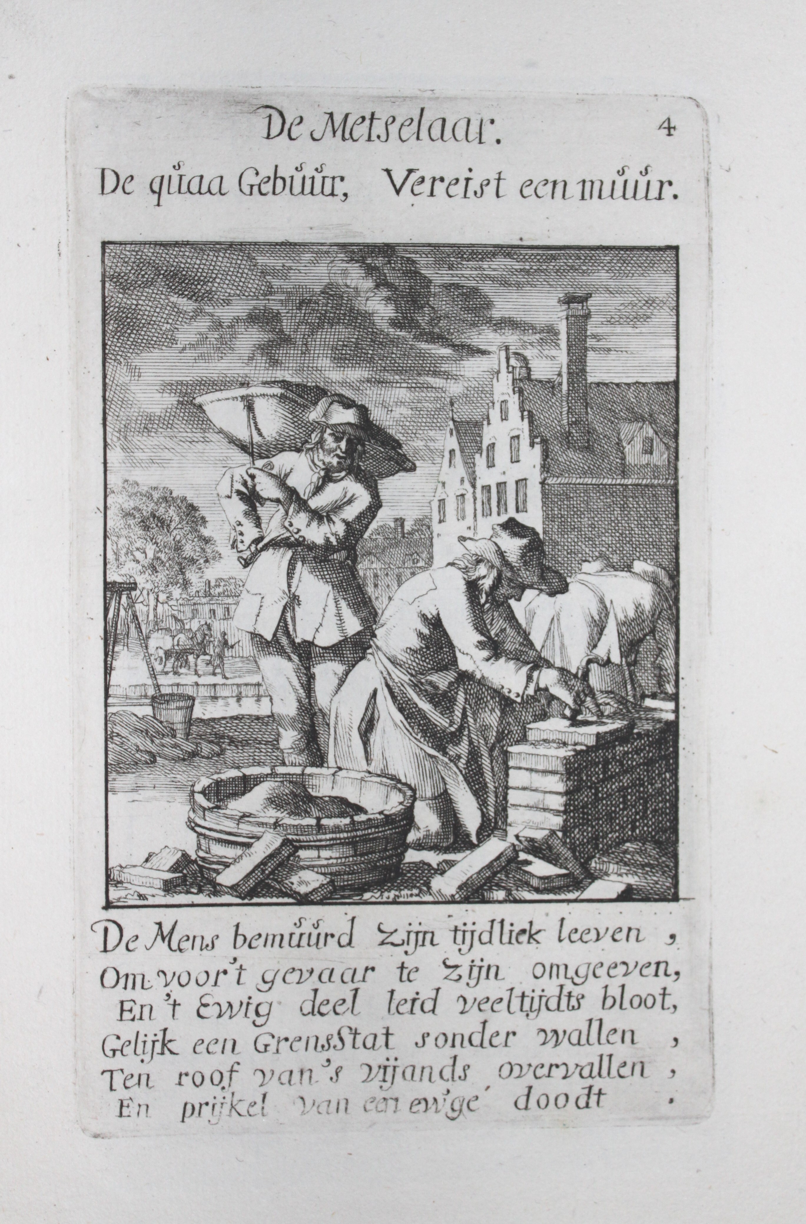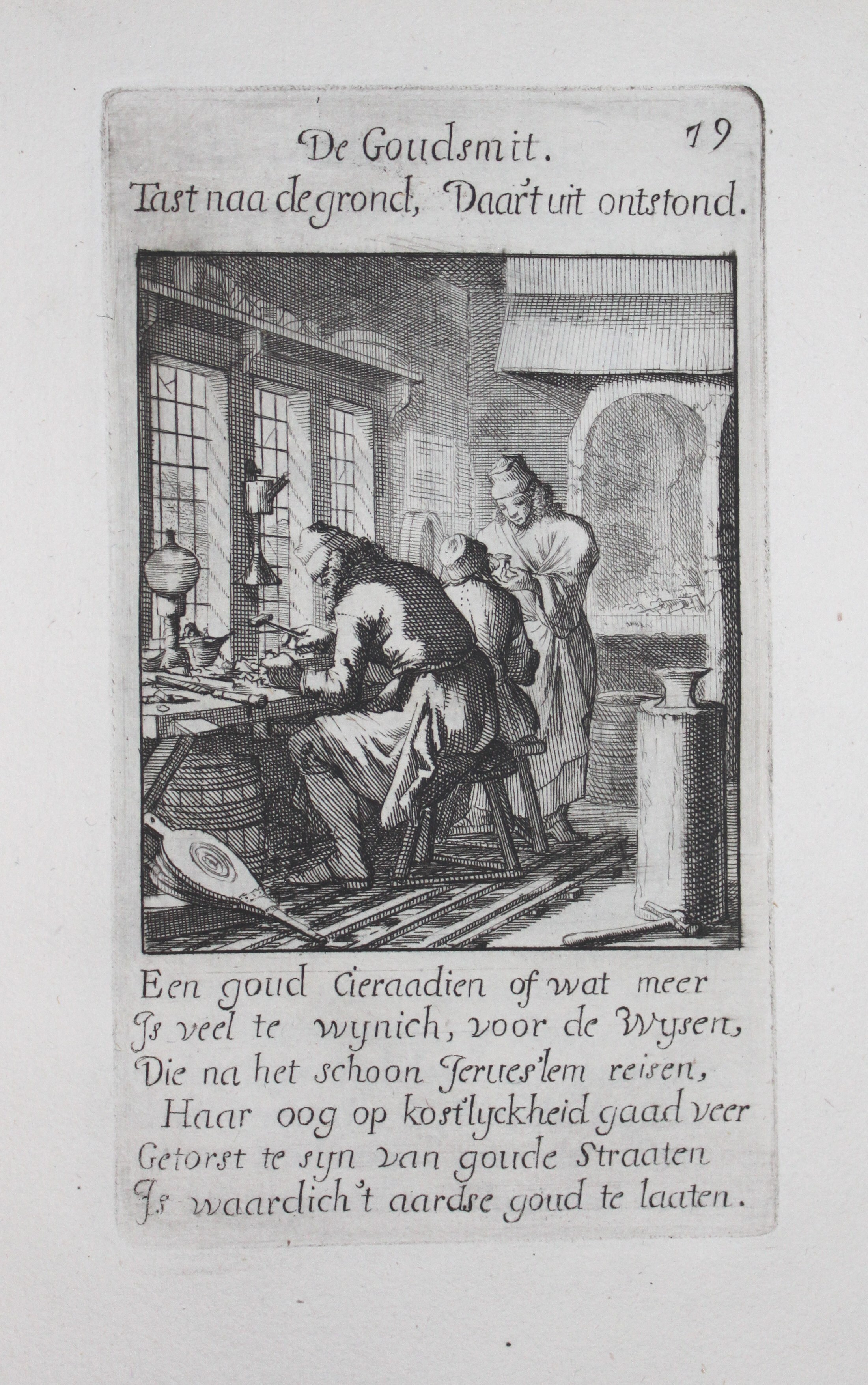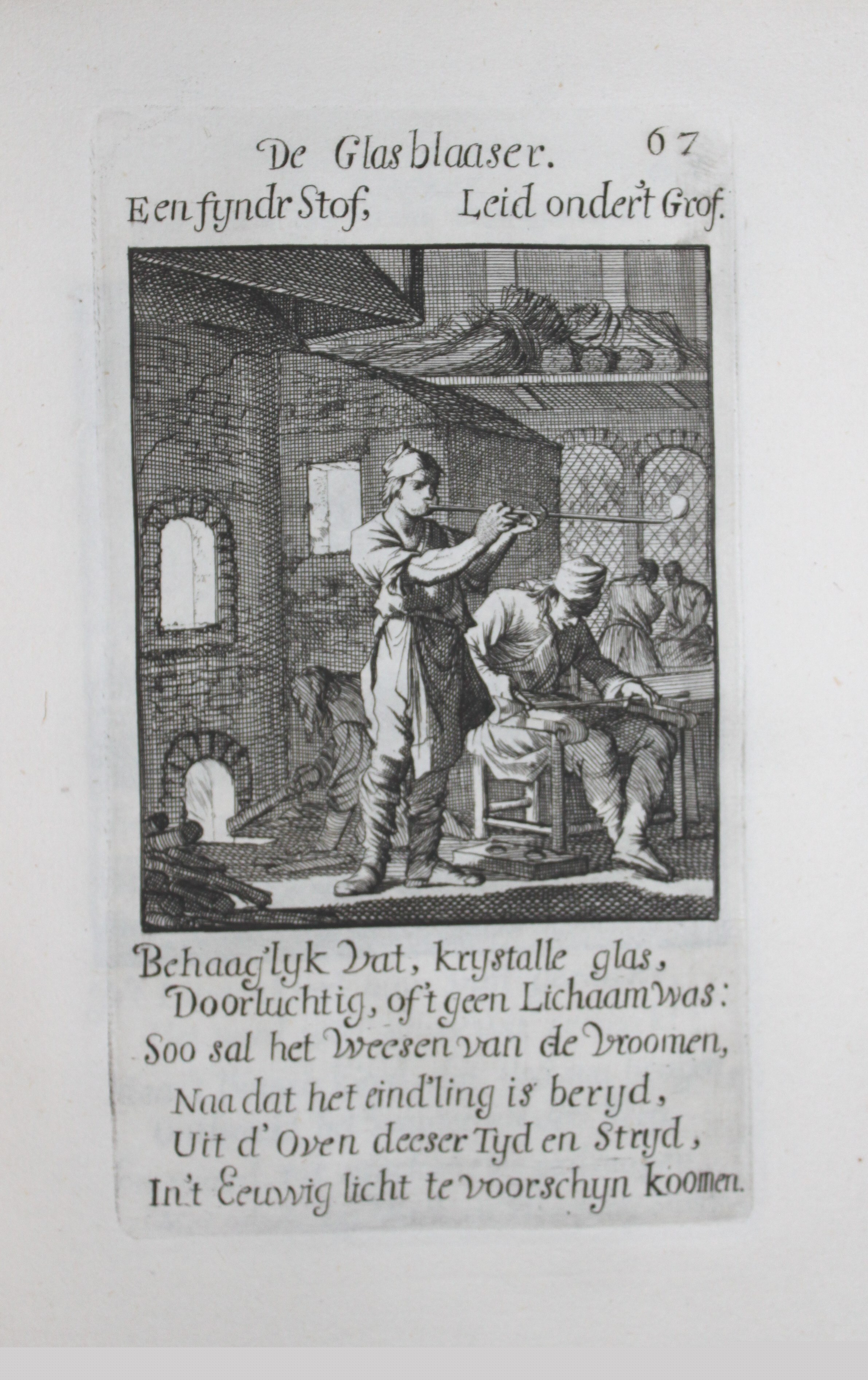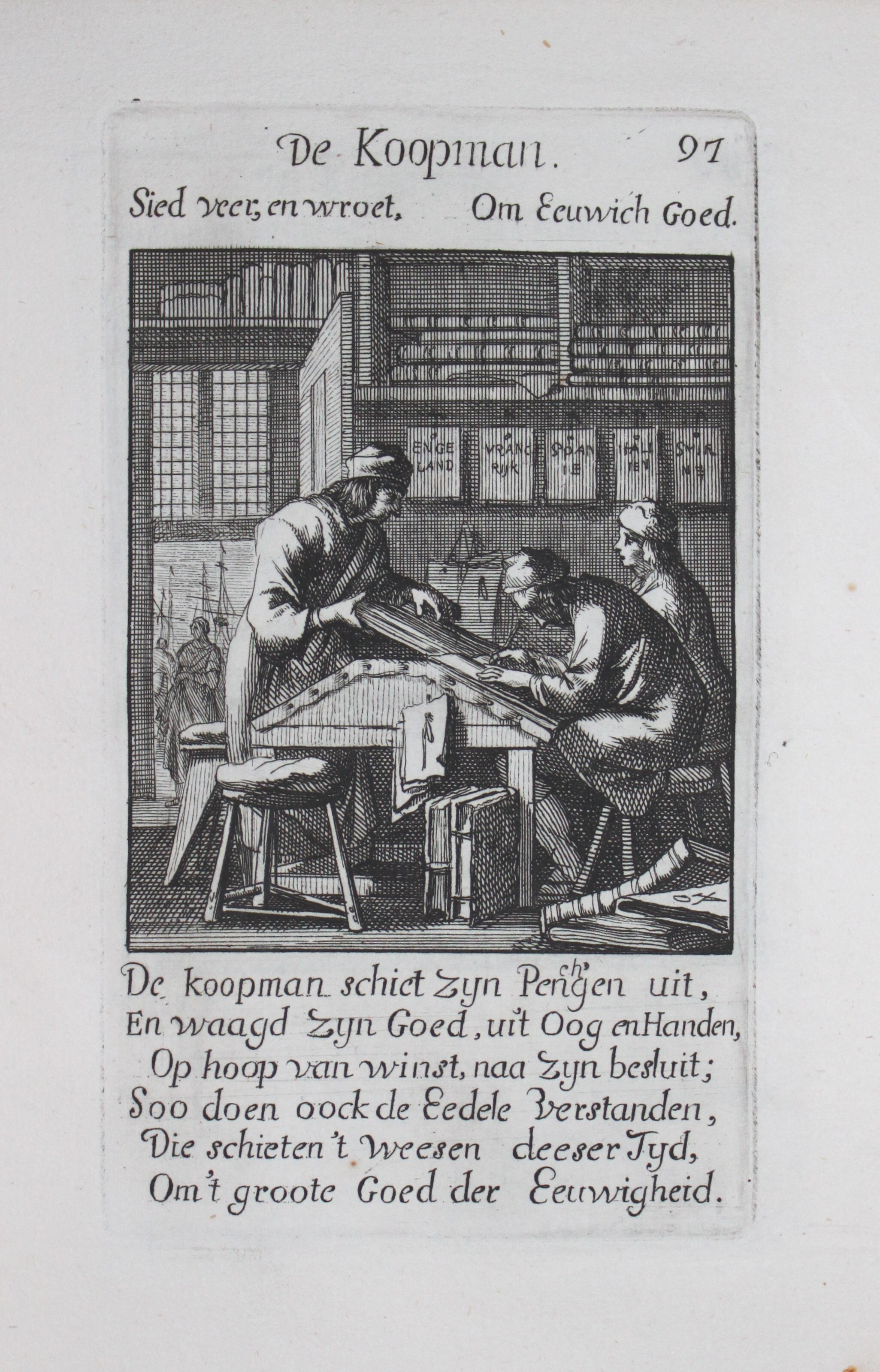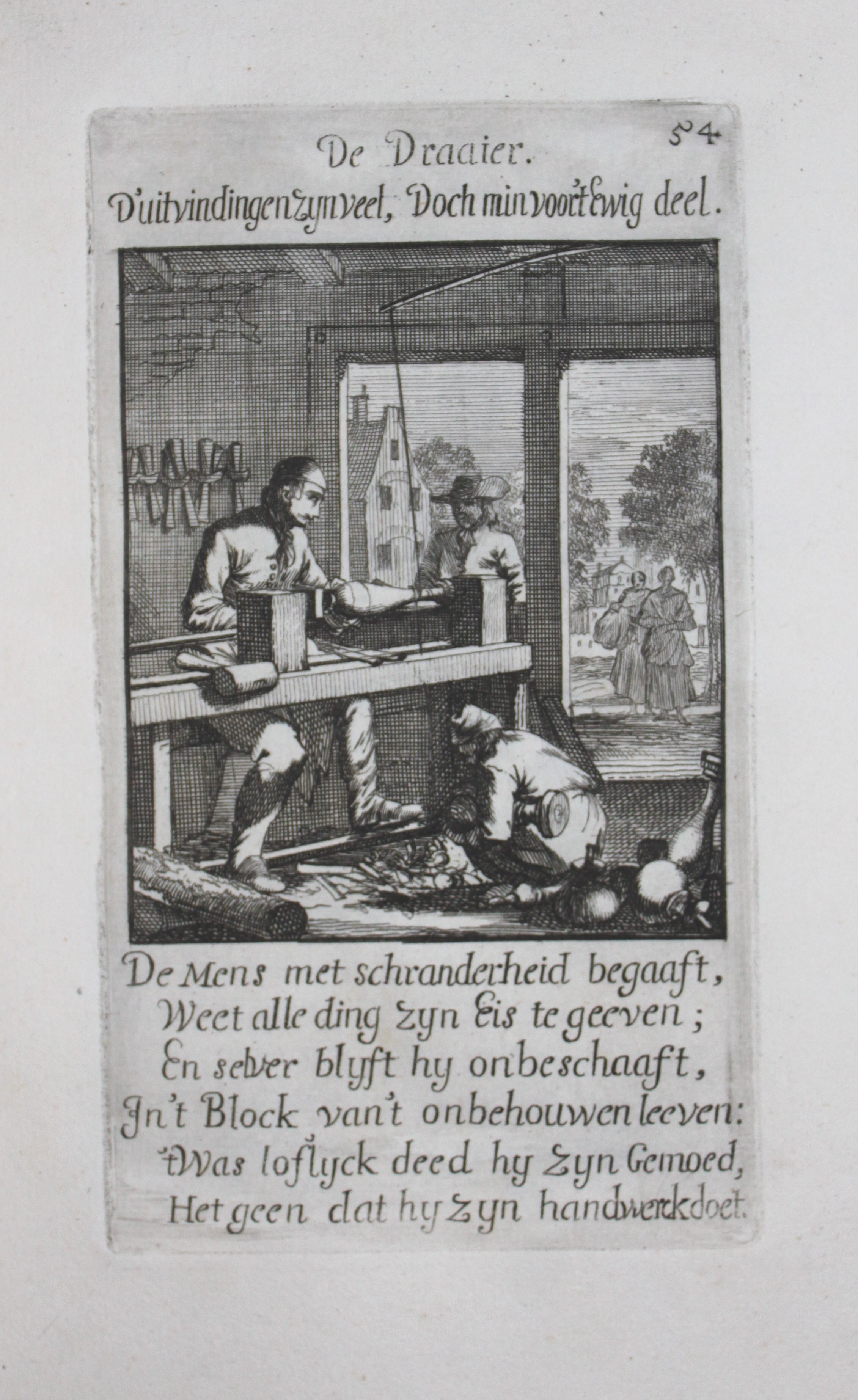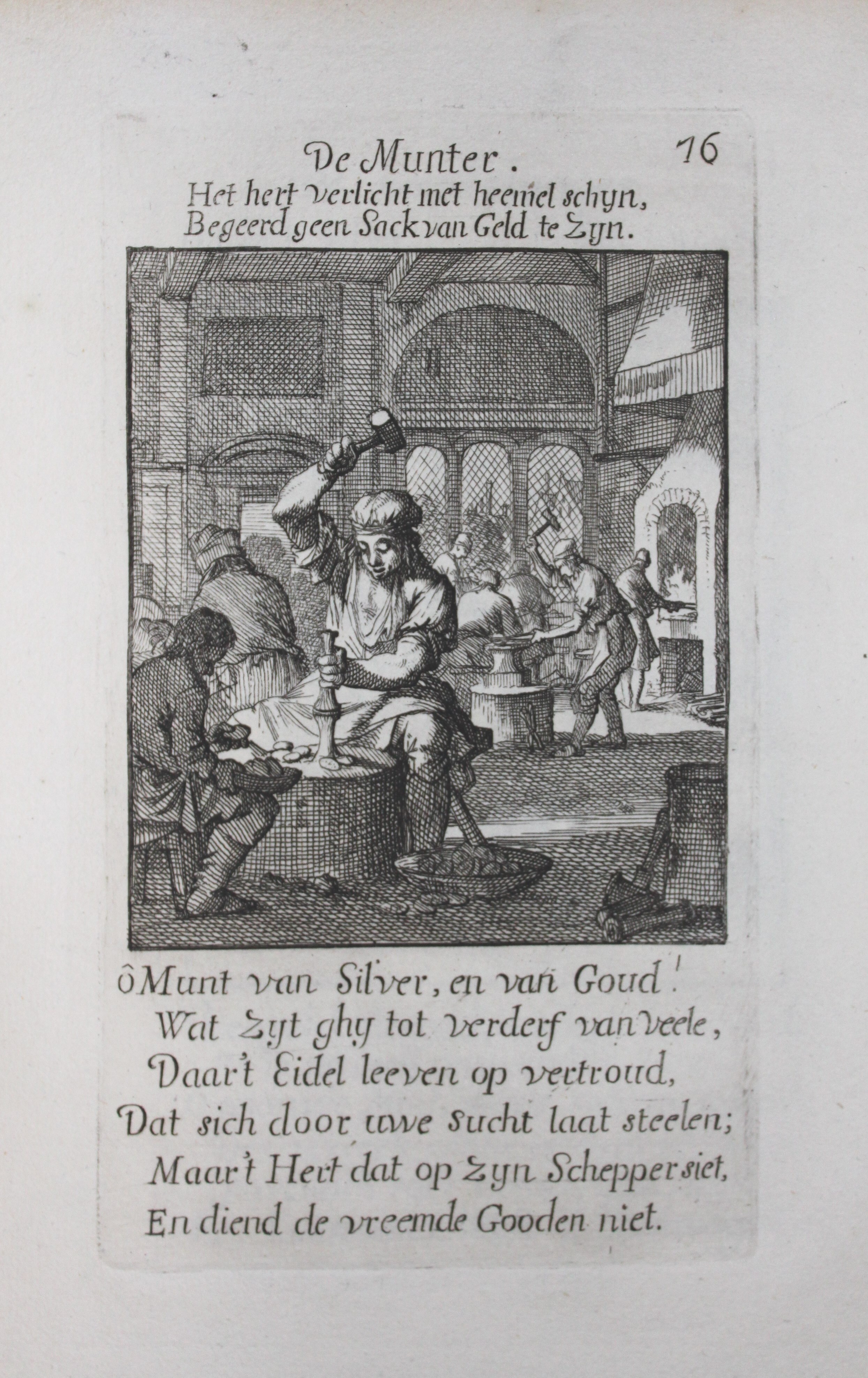 Het menselyk bedryf vertoond in 100 verbeeldingen van ambachten, konsten, hanteeringen en bedryven; met versen ... t' Amsterdam. Gedaan door Johannes, en Caspaares Luiken. 1694.
