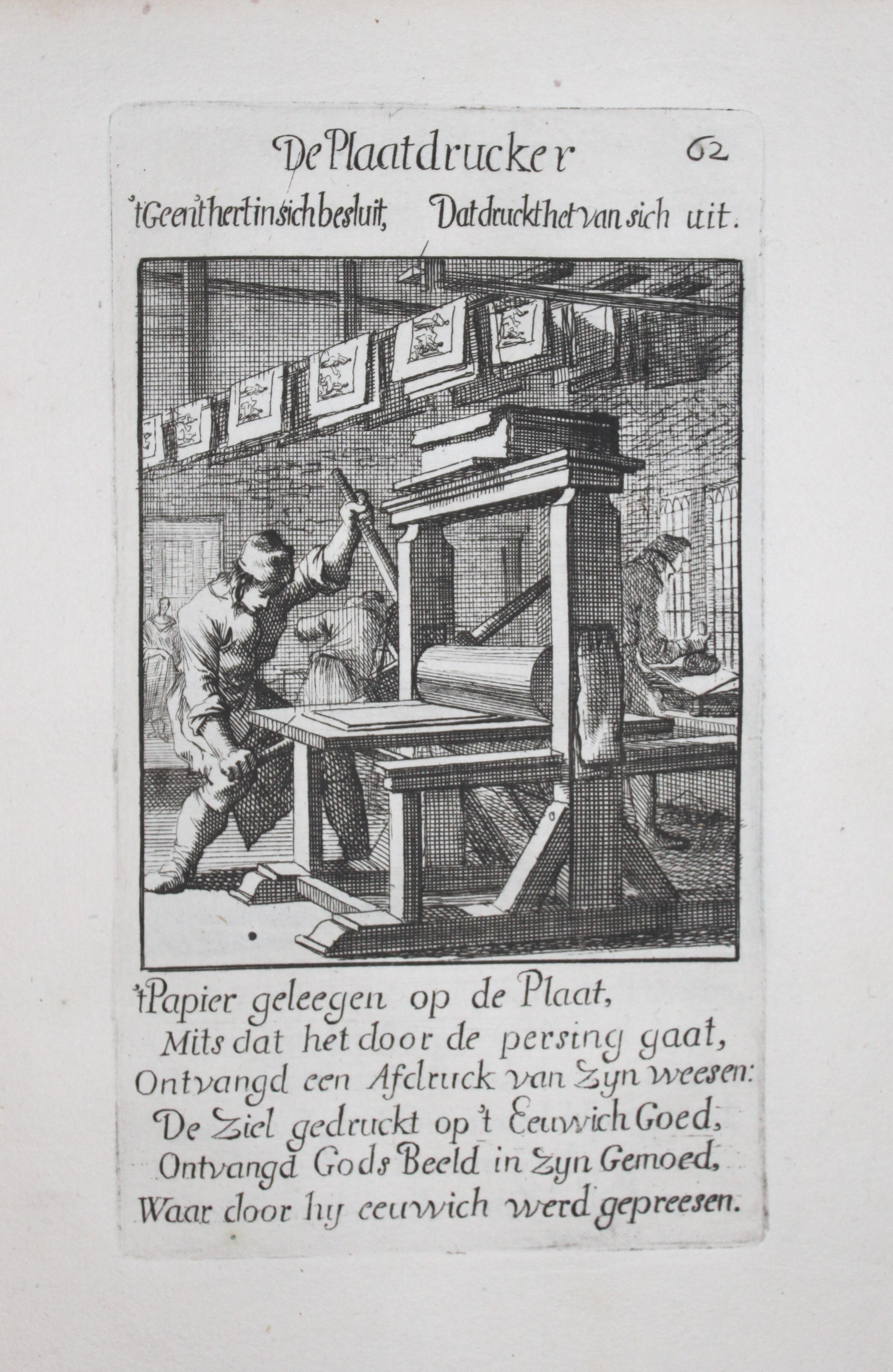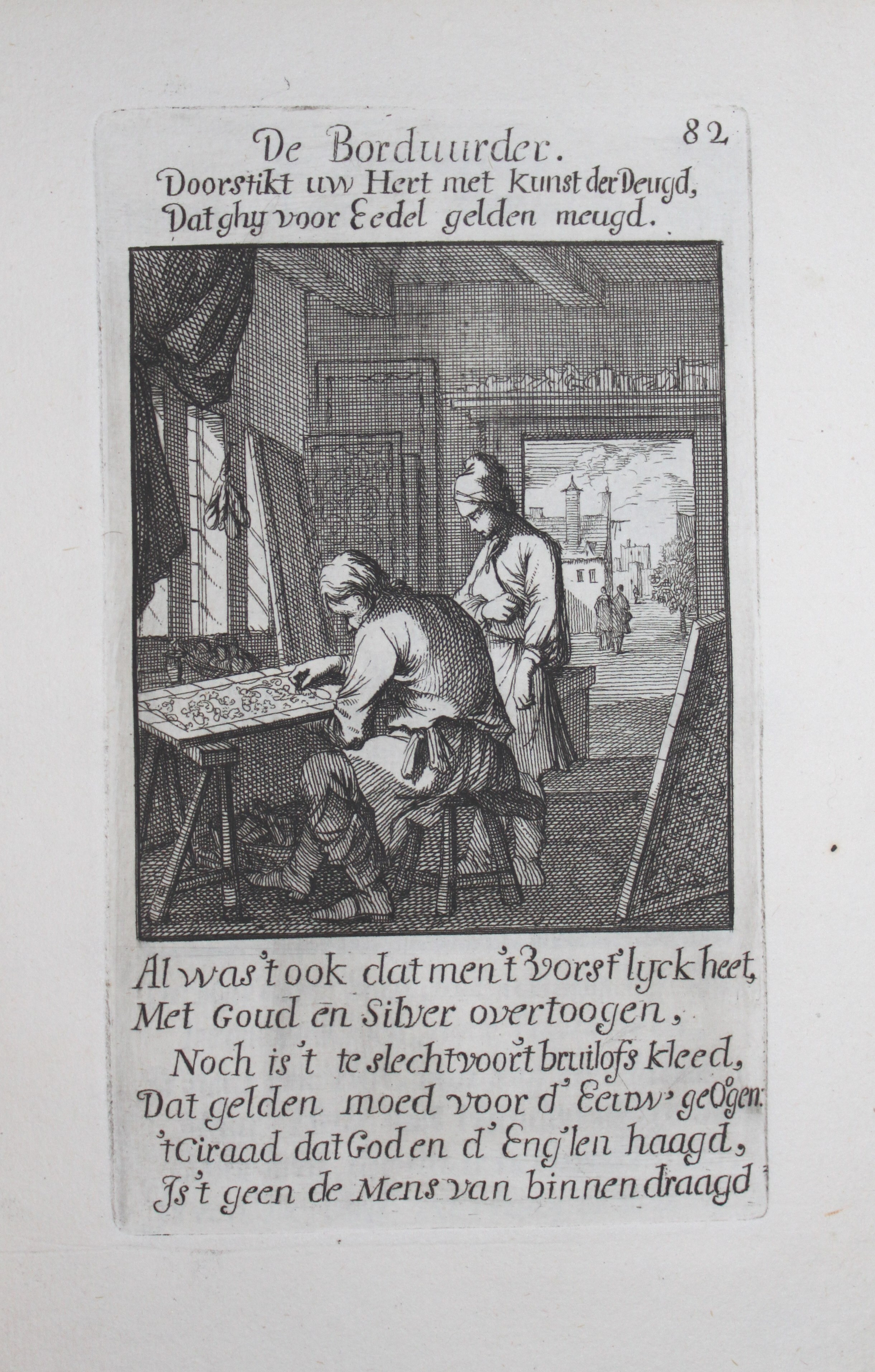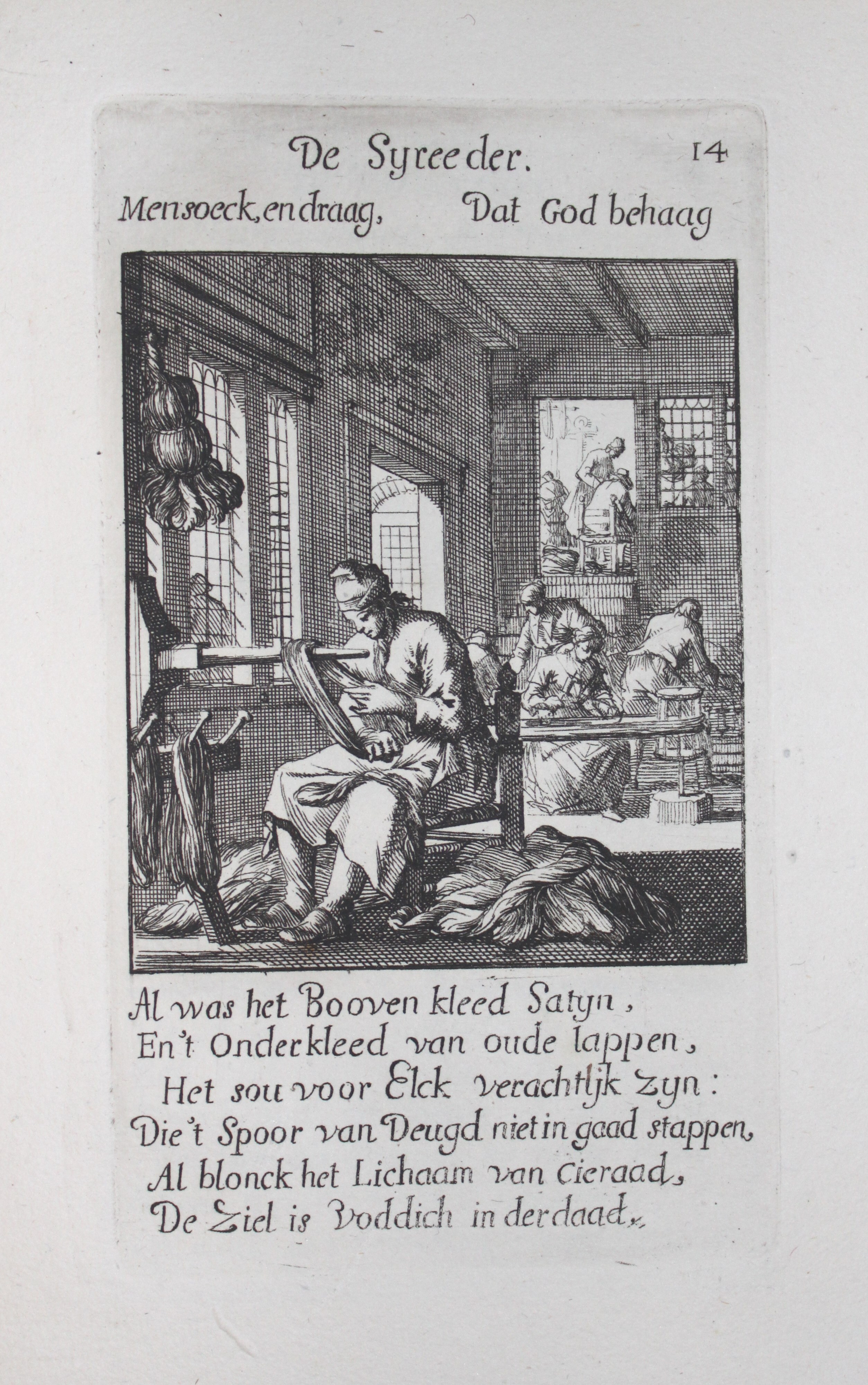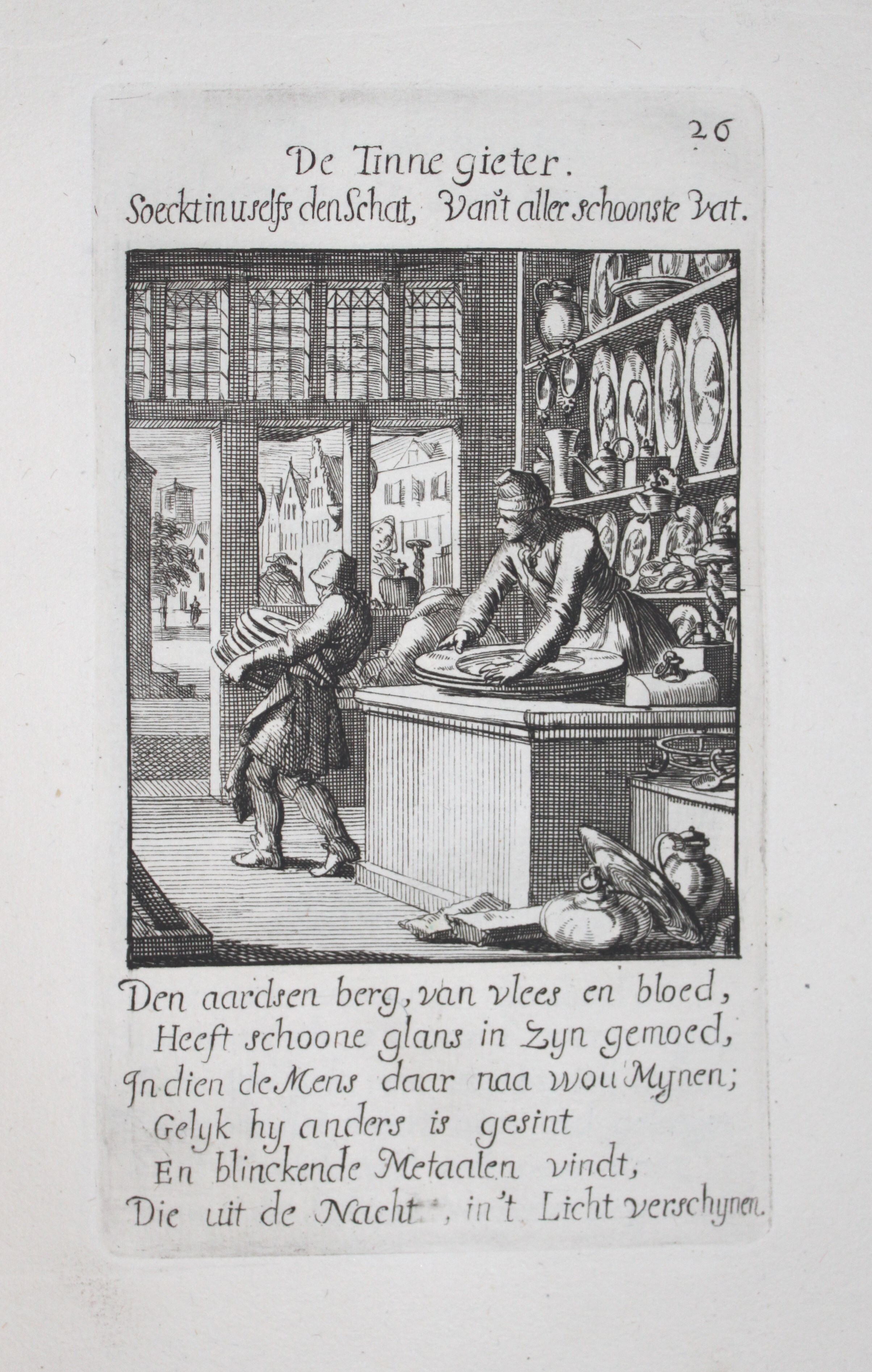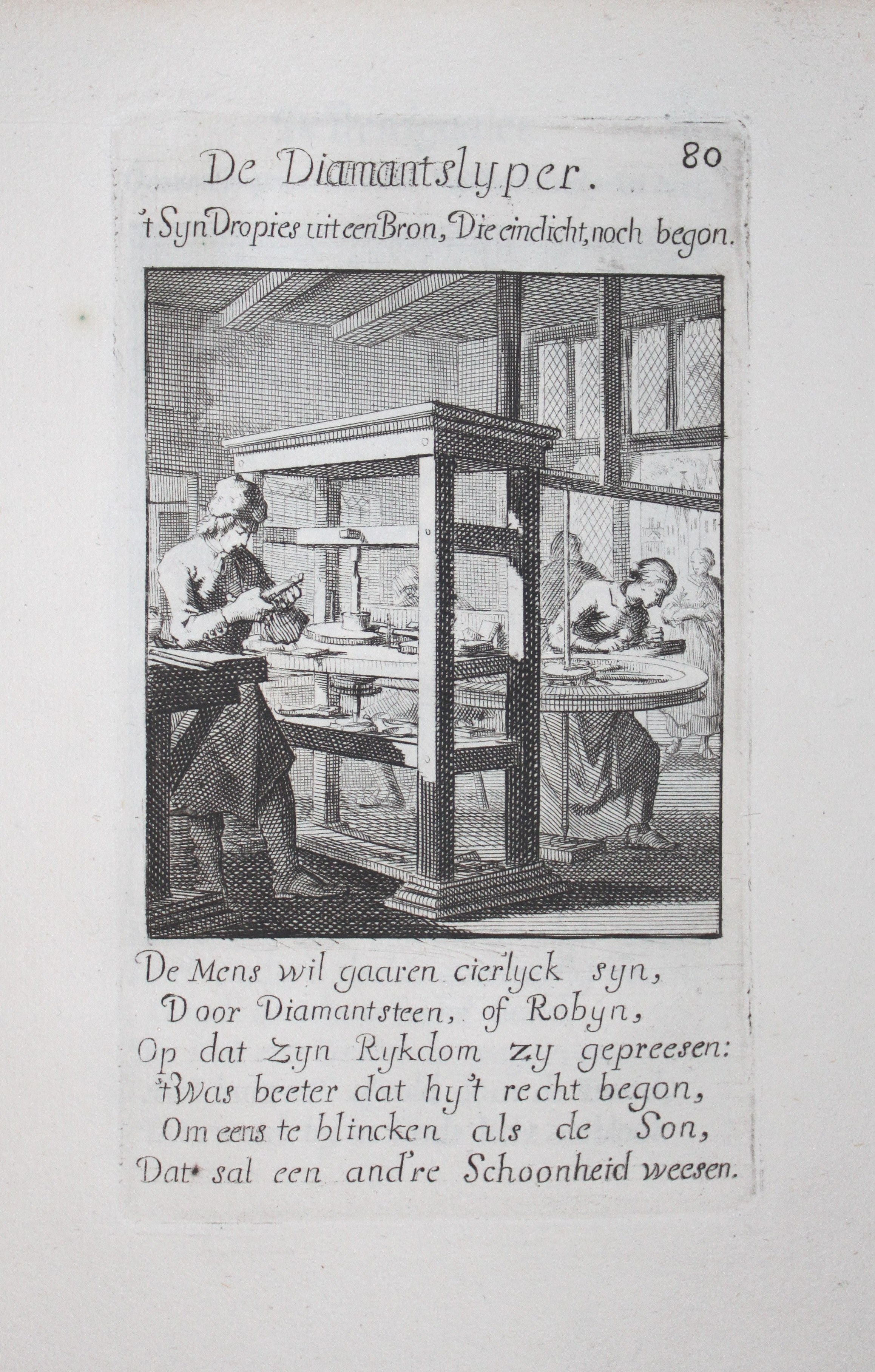 Het menselyk bedryf vertoond in 100 verbeeldingen van ambachten, konsten, hanteeringen en bedryven; met versen ... t' Amsterdam. Gedaan door Johannes, en Caspaares Luiken. 1694.