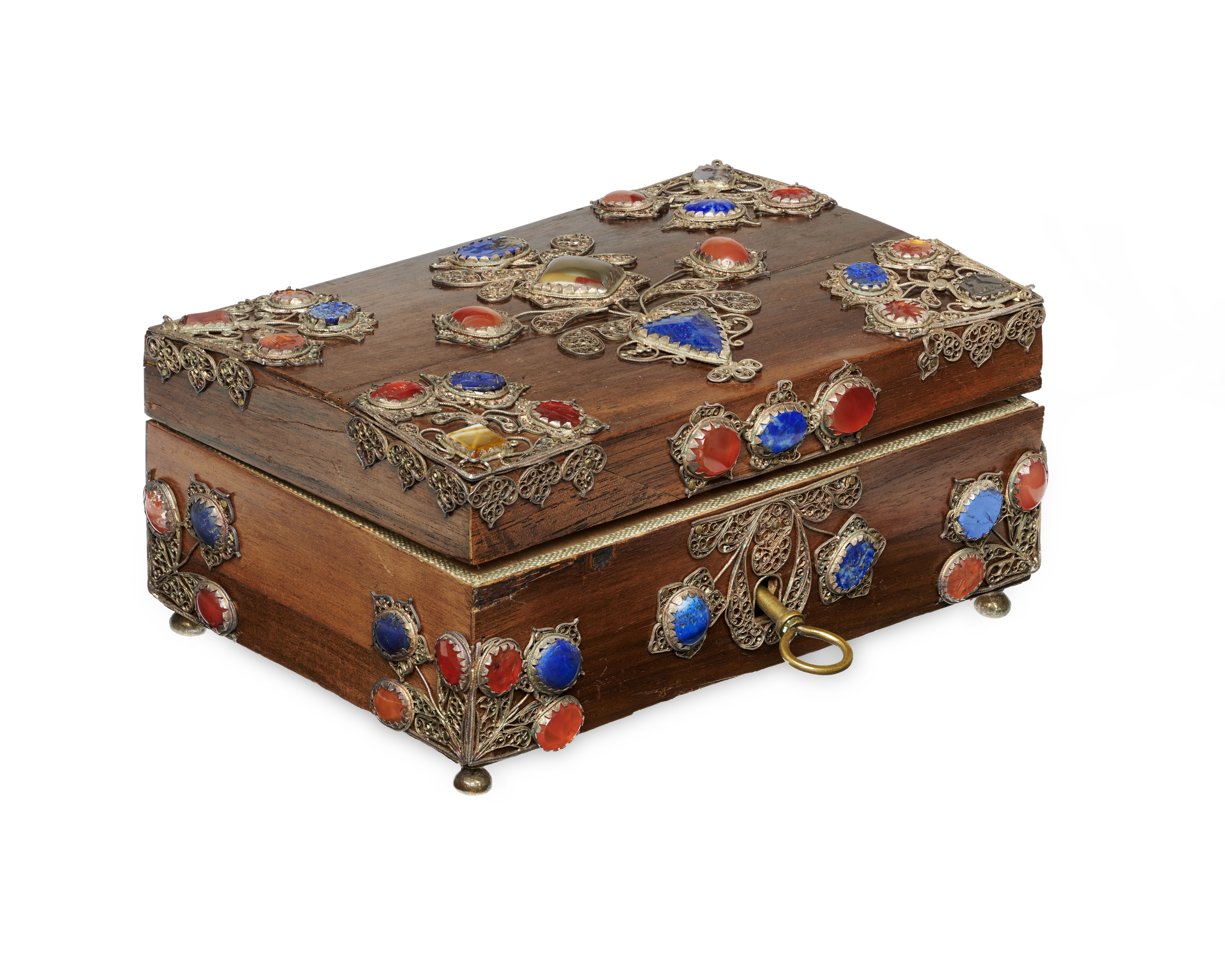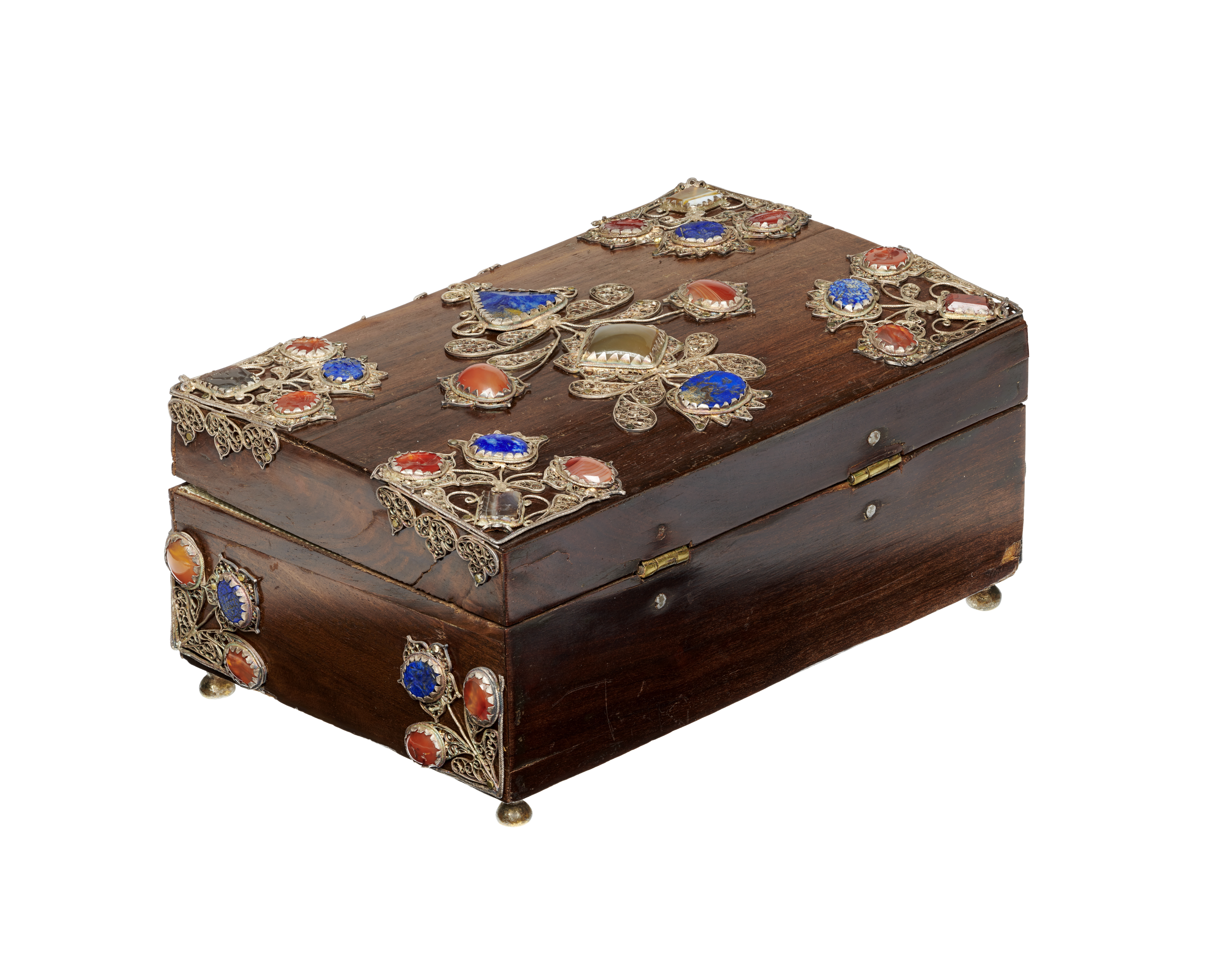 Tillverkad: Troligen Frankrike, omkring år 1700. Skrin av trä fanerat med ädelträ (kraftigt blekt). Beslag av filigranarbete med infattade slipade stenart och skurna gemmer av agat, karneol och lapis lazuli. Invändigt klätt med rött siden medf silvergaloner. Ett fack med lock, utrymmen för bläckhorn och sanddosa i silver, rund dosa med lock i filigranarbete samt sju (ursprungligen åtta) flaskor i blått glas (delvis med innehåll). Ostämplat. Stenar och gemmer av lapis lazuli, agat, karneol m.fl. infattade i silverfiligran. Invändigt klätt med rött siden med silvergaloner. Fack med sanddosa och bläckhorn av silver. Rund ask med lock av silverfiligran. Fack för åtta flaskor av blått glas, h 32 mm, innehållande salveliknande ämne och överbundna med rött siden. Omkring 1700. Fem av flaskorna vilar på hopskrynklade delar av blad från Stockholms Dagblad 1839, två vilar på kork.