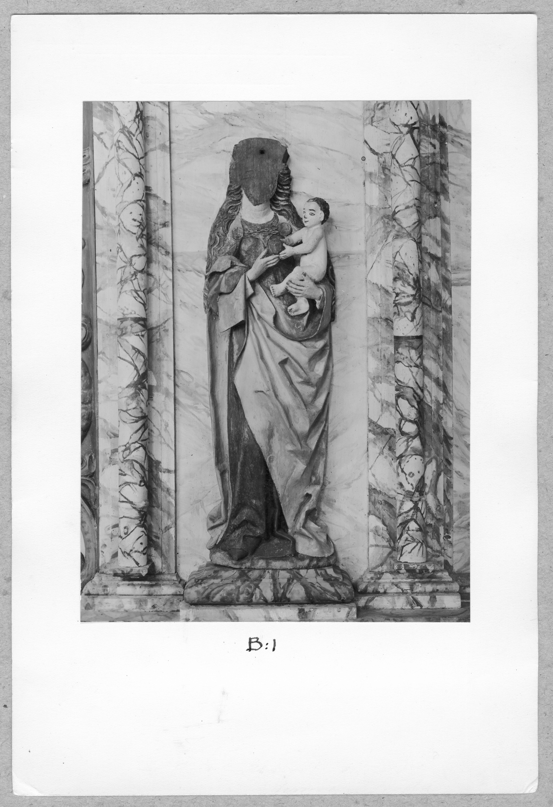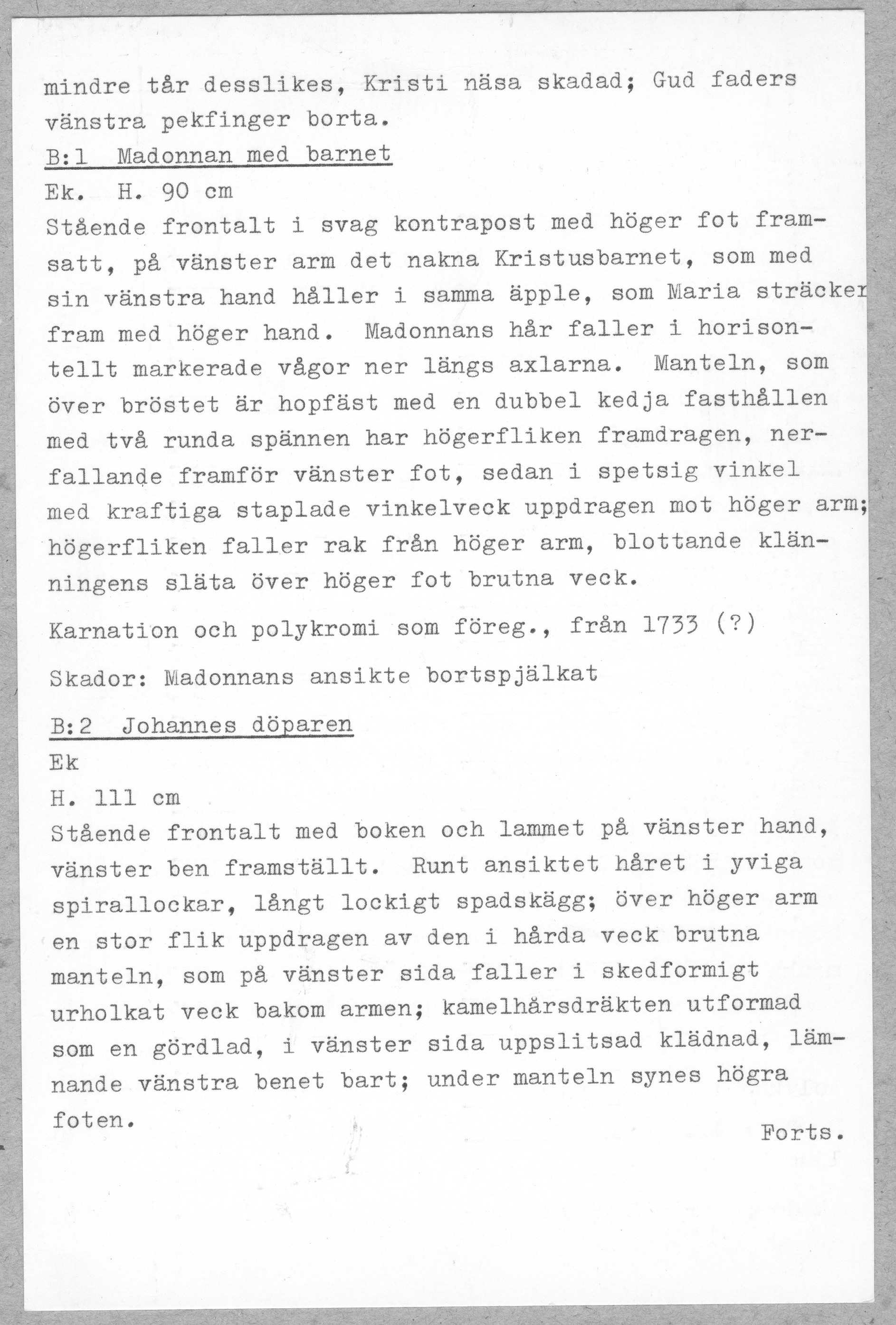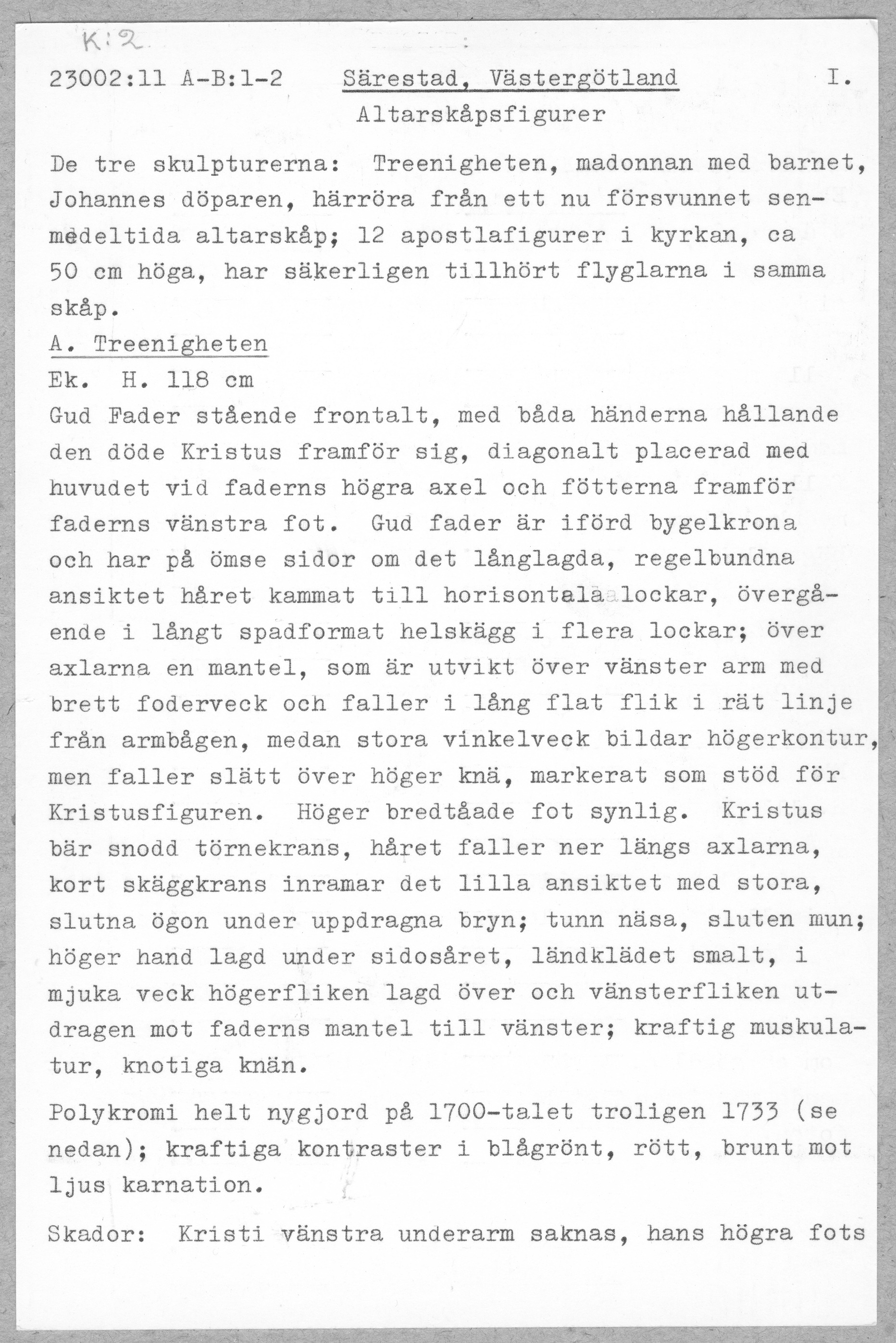 Kondition: god, Marias ansikte är bortfallet framför limfog, Kristus vänstra underarm förlorad, törnekronan fragmentarisk, Johannes högra pekfinger bortbrutet. Färg: all synlig färg är från 1733, då figurerna placerades i en nytillverkad altaruppsats.
