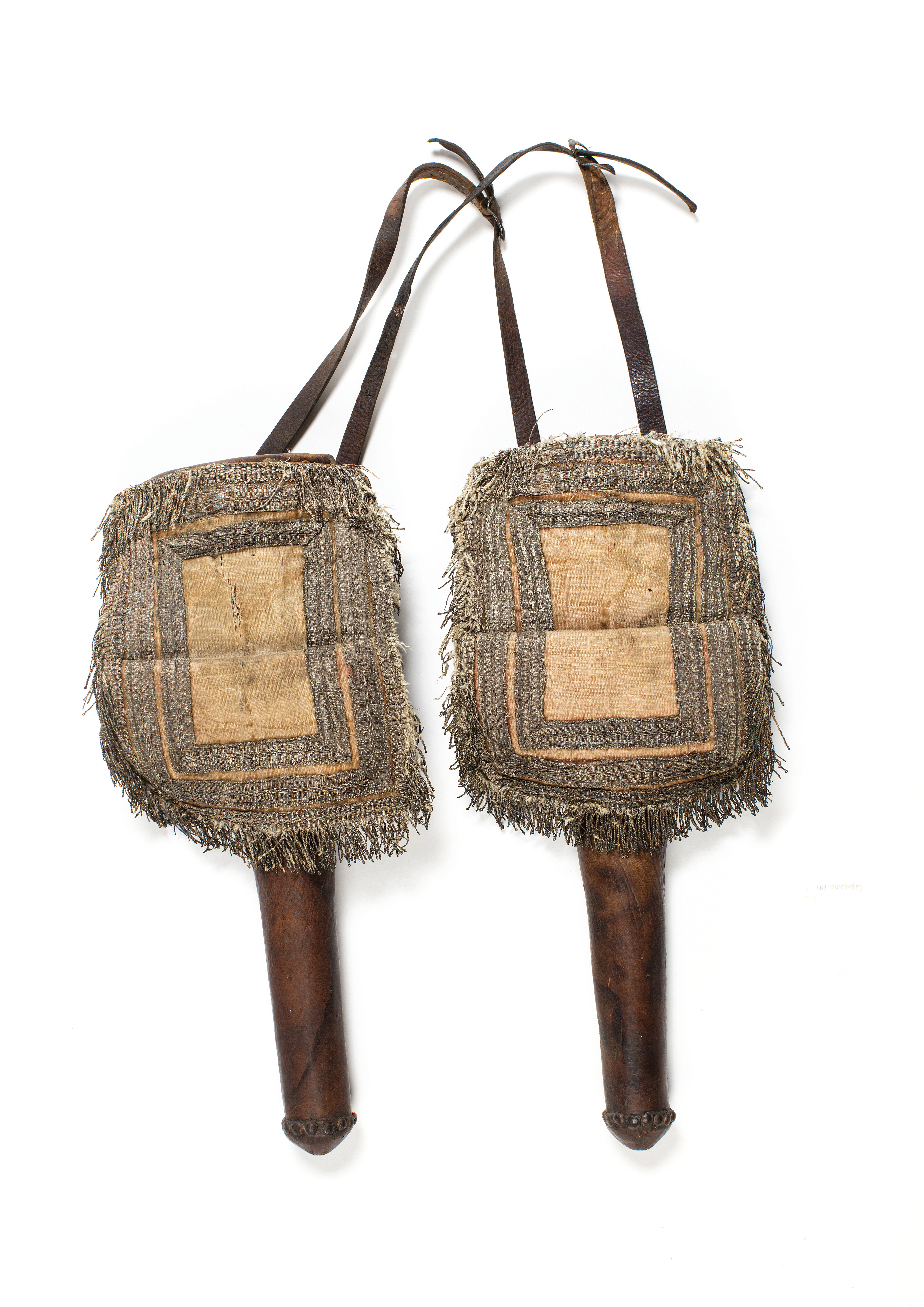 Av hård papp eller trä, överklätt med brunt läder. Hölsterkappa av ursprungligen laxröd sammet, numera blekt i en gulaktig nyans. Kappan har ficka och är på baksidan läderfodrad. Dekor i form av dubbel kantbård av silverband, längs yttersta kanten frans av silver och silketråd. Hölstret är nertill slutet. På baksidan finns två utskurna rembyglar. Tillbehör: Rem (15 mm bred) trädd genom rembyglarna, med spänne av stål.