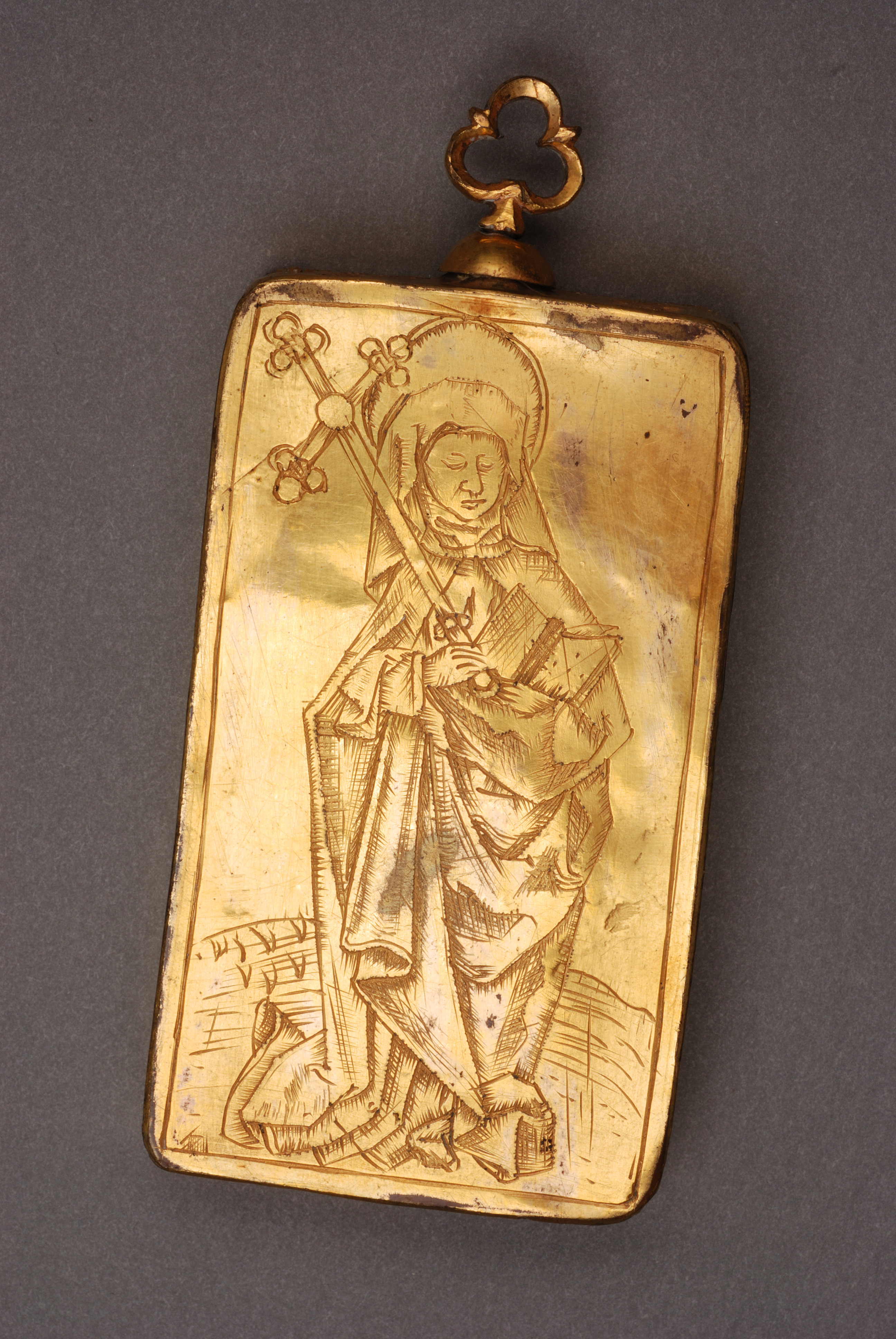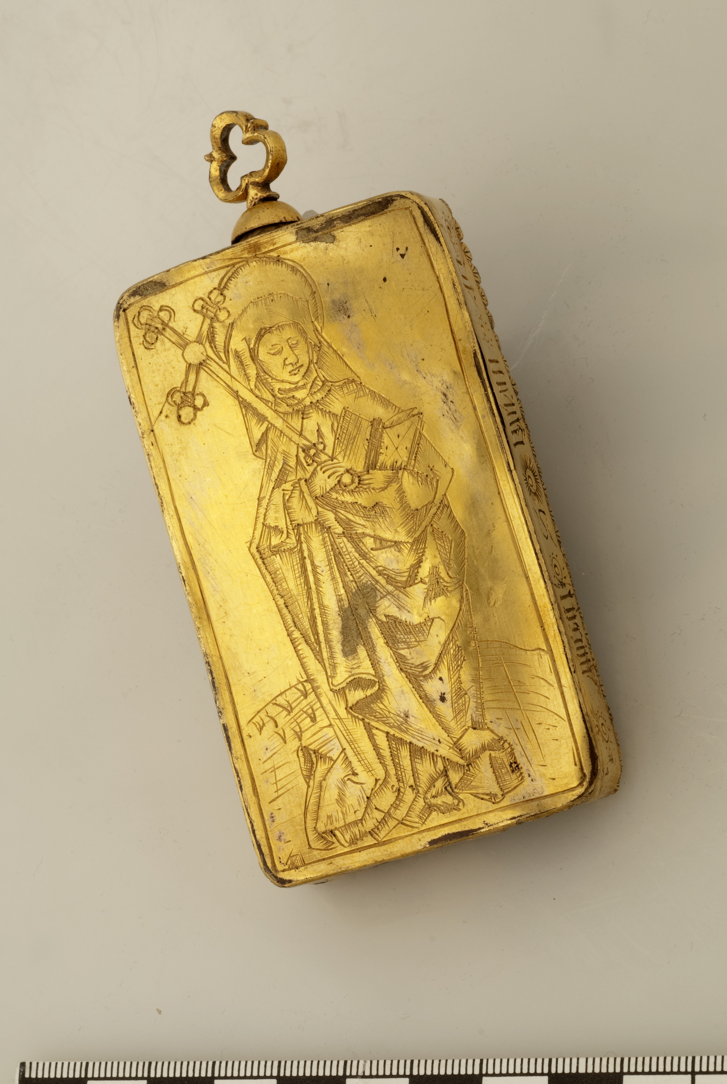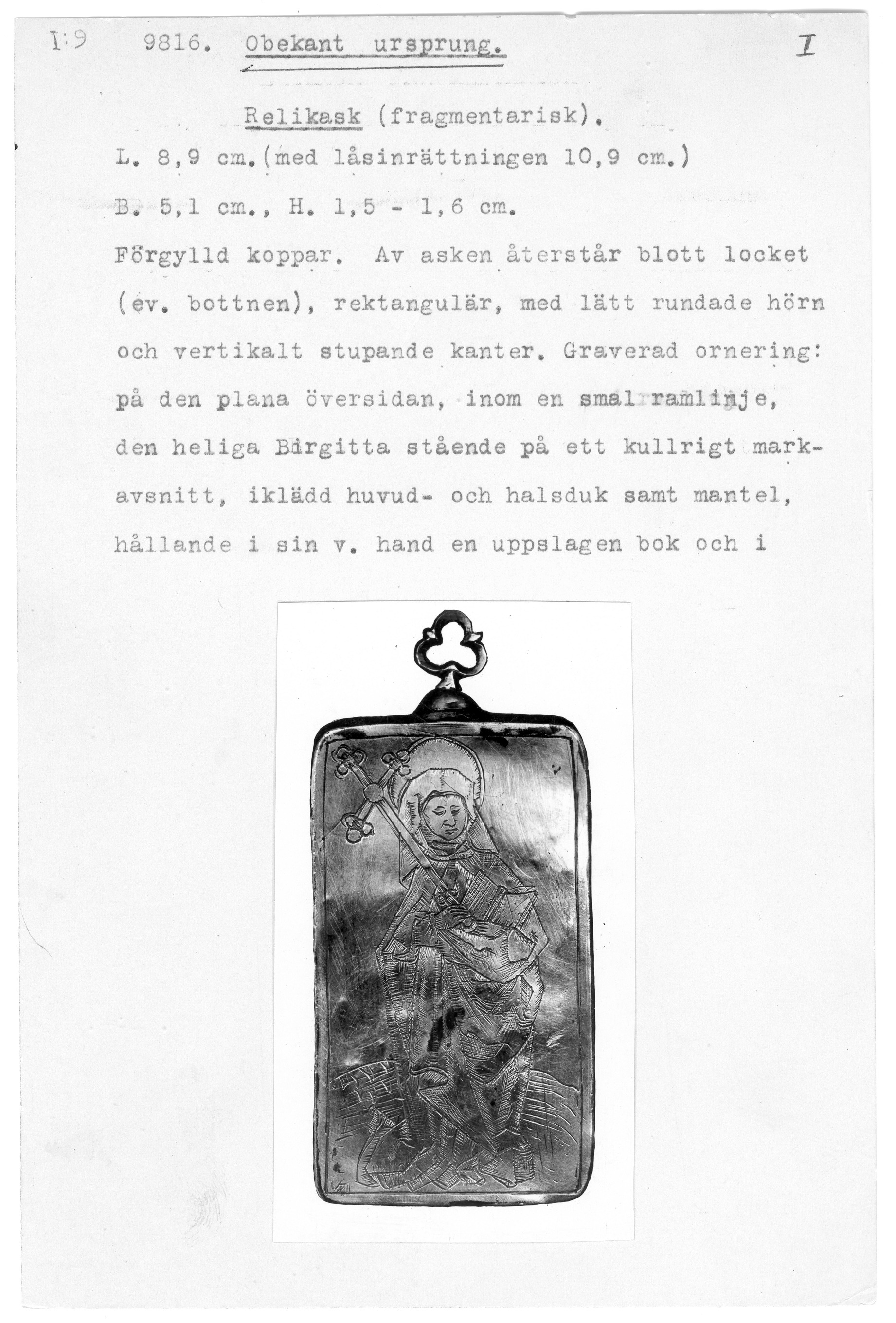 Relikask med avbildning av Heliga Birgitta som pilgrim.