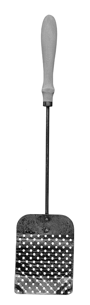 SKUMSLEV Av förtent järn. Blad av tunn plåt, rektangulärt med rundade innerhörn samt genombrutet med i rader ställda runda hål. Skaft rundstavigt, på yttre änden ett svarvat spolformigt handtag av al, med en mässingsring kring inre änden. Längd: 38,5 cm. Blad, längd: 11 cm.; bredd: 8 cm. Handtag, längd: 12,3 cm.