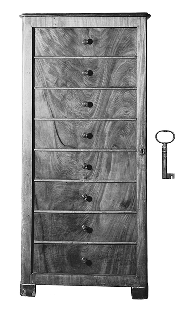Stående rektangulärt deokumentskåp med en utanpåliggande dörr med ram och fyllning, karnisformig list. Fyllningen imiterar åtta över varandra liggande lådor svarvade och profilerade lådknappar av trä. På främre ramstycket i mitten en stående oval nyckelskylt av trä, på insidan ett infällt lås. Kortsidor med faner. Översidan med kort utsprång och karnisformigt profilerad kant. Låga fyrsidiga fötter. Rygg av furu, inredning av furu. Åtta över varandra liggande lådor, till vänster om lådorna ett längs hela sidan gående smalt fack, i vars mitt en hylla. Inredningen och dörrens insida fernissade. Nyckel av järn,med oval ögla, upptill på pipan en profilering. Tillhört inventarierna i Wilhelm Heinrich (Henrik) Kempes privata kontorsrum; inrymd i Schinkelska huset, dåvarande adress Kornhamnstorg 2,( nuvarande Kornhamnstorg 4), Stockholm, 1843 - 1883; därefter på firman Wilh. H. Kempes (innehavare Walther von Hallwyl och Johanna Kempes, f. Wallis) kontor vid Blaiseholmstorg II, 1884 - 1896, och vid Hamngatan 4, 1896 - 1909.