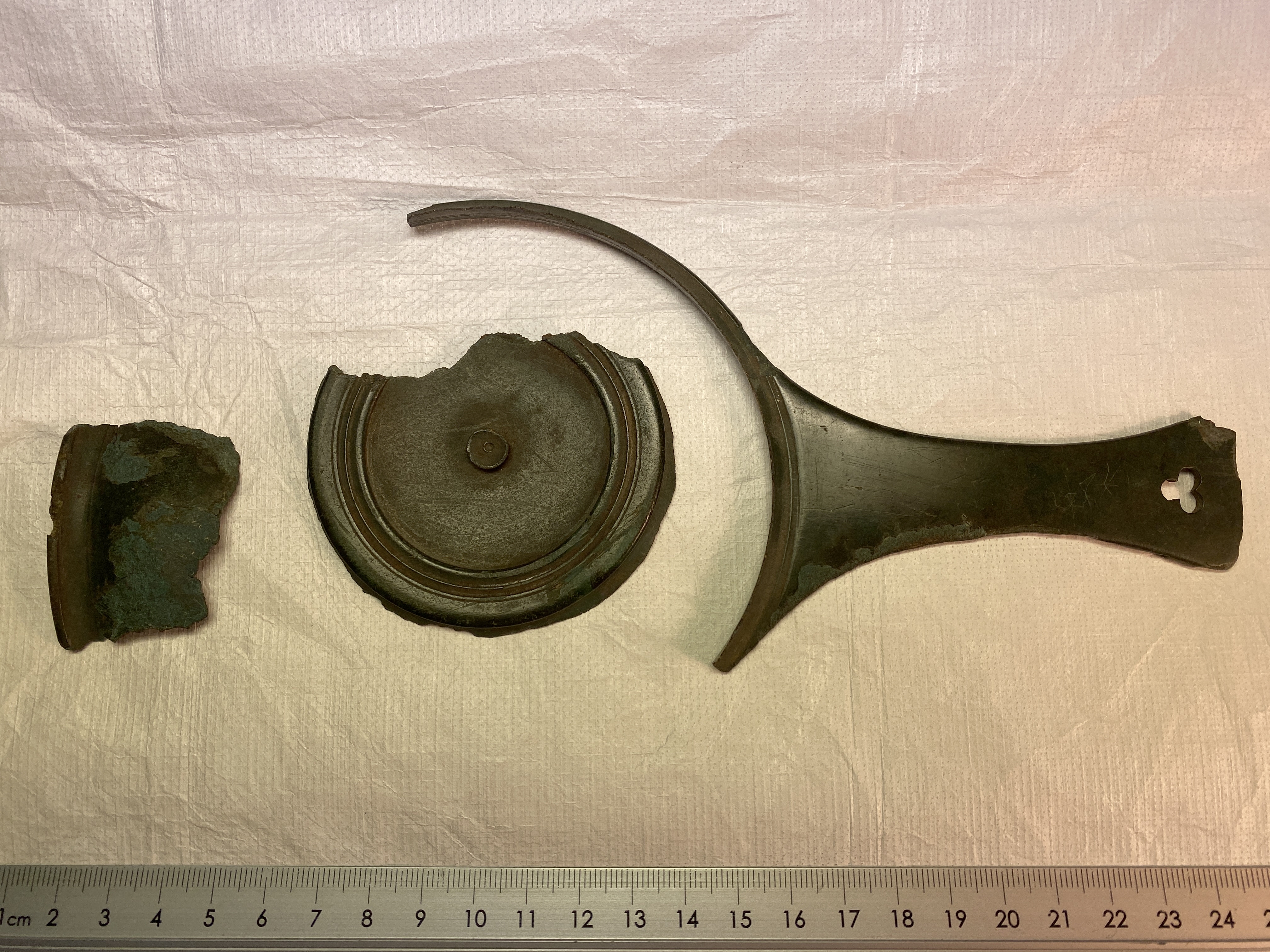 kasseroll i 3 delar. Botten försedd med koncentriska cirklar på undersidan. Mynningen har en förtjockad kant med en hålkäl under. Skaftet är rakt avslutat med ett treklöverformat hål. På undersidan är skaftet skadat och har rester av den romerska fabriksstämpel: NSIEPHAPRO? skaftsidan med fabriksstämpeln har flera skador i form av repor och skrapmärken som finns redan på katalogkorten från 1900-talets början eller mitt. Även själva stämpeln är skadad på 1800- eller 1900-talet.
