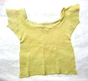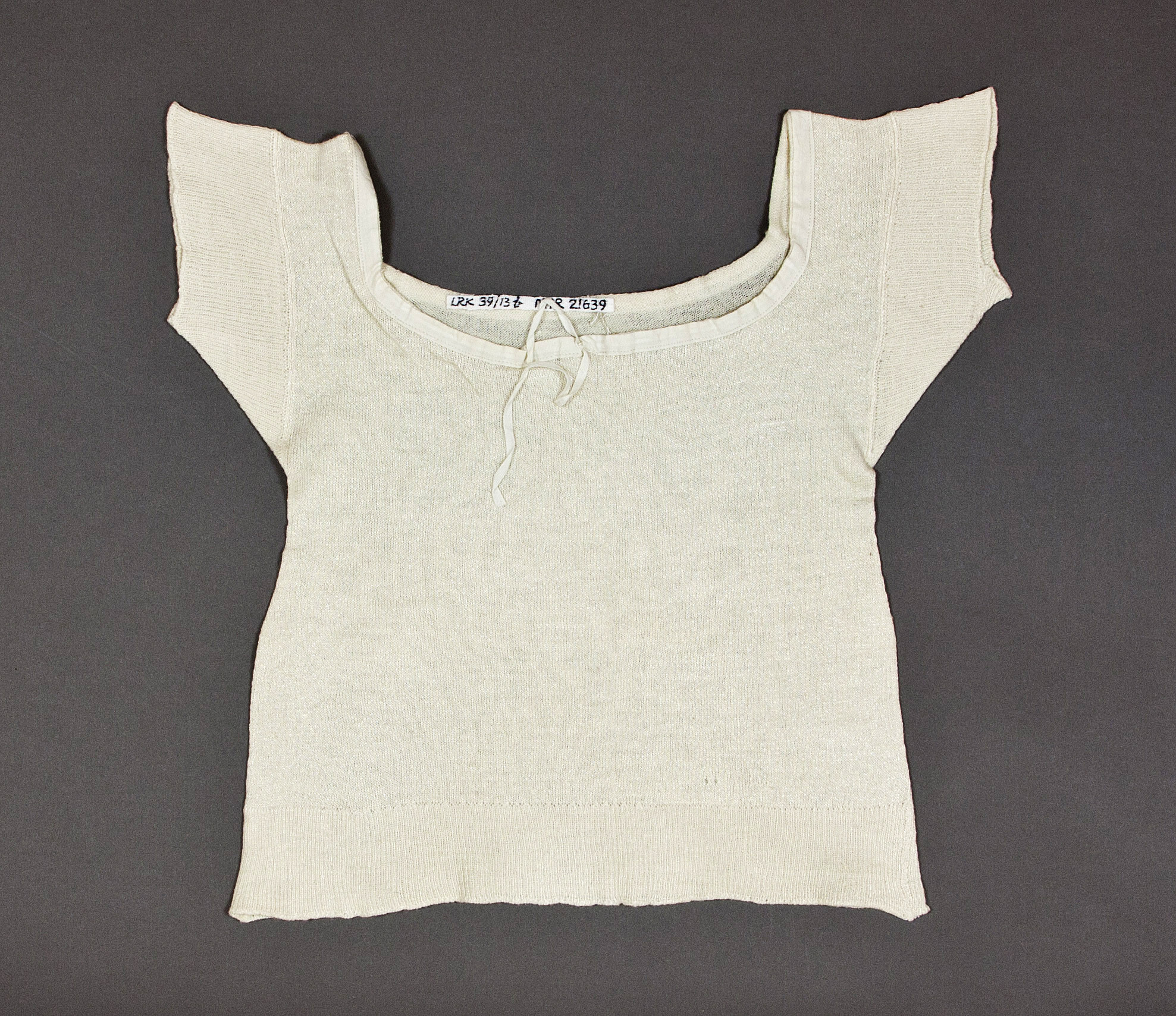 Ärmarna och tröjans nederkant är muddar. På framsidan är ärmarna raka i överdelen men kilformade nertill, på baksidan är den kilformade delen stickad på samma sätt som resten av tröjan. Halslinningen rektangulär med rundade kanter. I sömmen runt halslinningen löper ett tygband som är knutet i en öppning mitt fram. Bandets längd är 130 mm på ena sidan knuten och 60 mm på den andra.