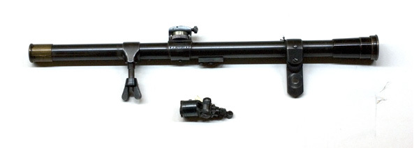 Kikarsikte med blånerad ståltub, d: 18 mm. I ena änden sitter ett lins-hus av svartmålad mässing med linsskydd av mässing med skruvgänga. I andra änden påskruvat ett stålrör, l: 20 mm med påträtt linsskydd av mässing. På röret är fastskruvat ett blånerat fäste i form av en nedåtriktad stålten med hål för fästskruven på mekanismens v sida. På mitten en blånerad hållare för en oblånerad justerskriva med räfflad ring nertill. Därovanför sitter på v sida en gradering 1, 2, 3, på hållaren stämplat: "PATENTED BY // W. J. JEFFERY & CO // 1900". På rörets undersida därbakom är fastskruvat en platta, stämplad 312. Framför justeranordningen är påträtt en stålring med en åt h riktad stav med vingmutter för fästning baktill på siktplattan. Patent W J Jeffery & Co, London. Tillverkningsnr 312.