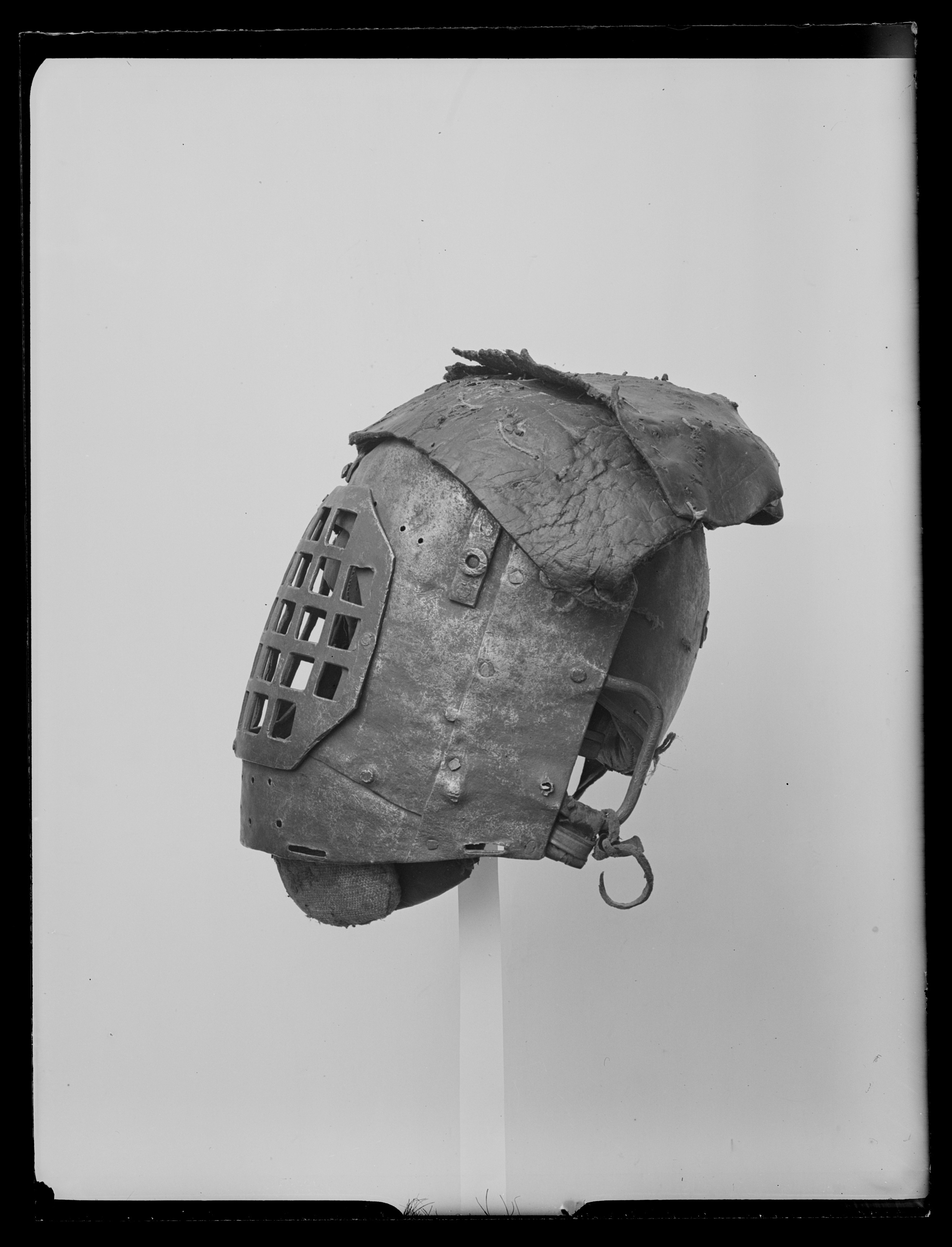 Skadad, ej komplett. Av stål med skydd för hjässan av läder och övre stoffering av uppstoppat läder. Skyddet för ansikte och huvudets sidor bestående av tre i sidled sammannitade stålplåtar, den i mitten med en nedtill nitad, smalare plåt (som hakskydd). Samtliga plåtar böjda efter huvudets form. Den i mitten med en större urtagning varöver ett pånitat ansiktsgaller av stålplåt med trettioen symmetriskt ordnade, kvadratiska hål (fem gånger fem jämte en rad av tre vertikalt ordnade hål vid vardera sidan, hålens sida ca 20 mm). Nedanför plåten med ansiktsgallret två horisontella rader, vardera med sju runda hål, ovanför gallret en ojämn, horisontell rad med åtta (synliga), runda, något mindre hål. På vardera sidan vid ansiktsgallrets överdel pånitat, ca 50 mm höga, vertikala fästanordningar av stål, båda med en flat förstärkningsring på mitten, anordningarna utgör på maskens insida fästen till gångjärn för ett nackskydd av stålplåt. Vid huvudskyddets övre del ett system av pånitade, böjda tenar av stål, (den mellersta böjd som en bakåtriktad, stor ögla), avsett som stödjande underlag för ett ovanför bygelsystemet liggande skydd av grovt (söndrigt), mörkbrunt läder, sammansatt av flera olika delar och (numera) endast fäst baktill. Vid vardera sidan av fäktmaskens nedre kant två smala urtagningar för fästande av remmar till numera förkomna hals- och bröstskydd. I urtagningen längst bort vid maskens högra sida en bevarad, kort rem med fyrsidig sölja av mässing och torne av stål. Nitade vid fäktmaskens båda sidokanter en ca 80 mm hög, rak bygel avsedd för fästande av ett förkommet nackband av samma bredd som bygelns höjd. I den högra bygeln en kort läderrem med sölja av stål, i den vänstra en hopknuten, smal läderrem. Utmed maskens insida upptill (för h jässan), kring nacken och runt ansiktet stoppade putor av brunt läder med mässingssöljor.