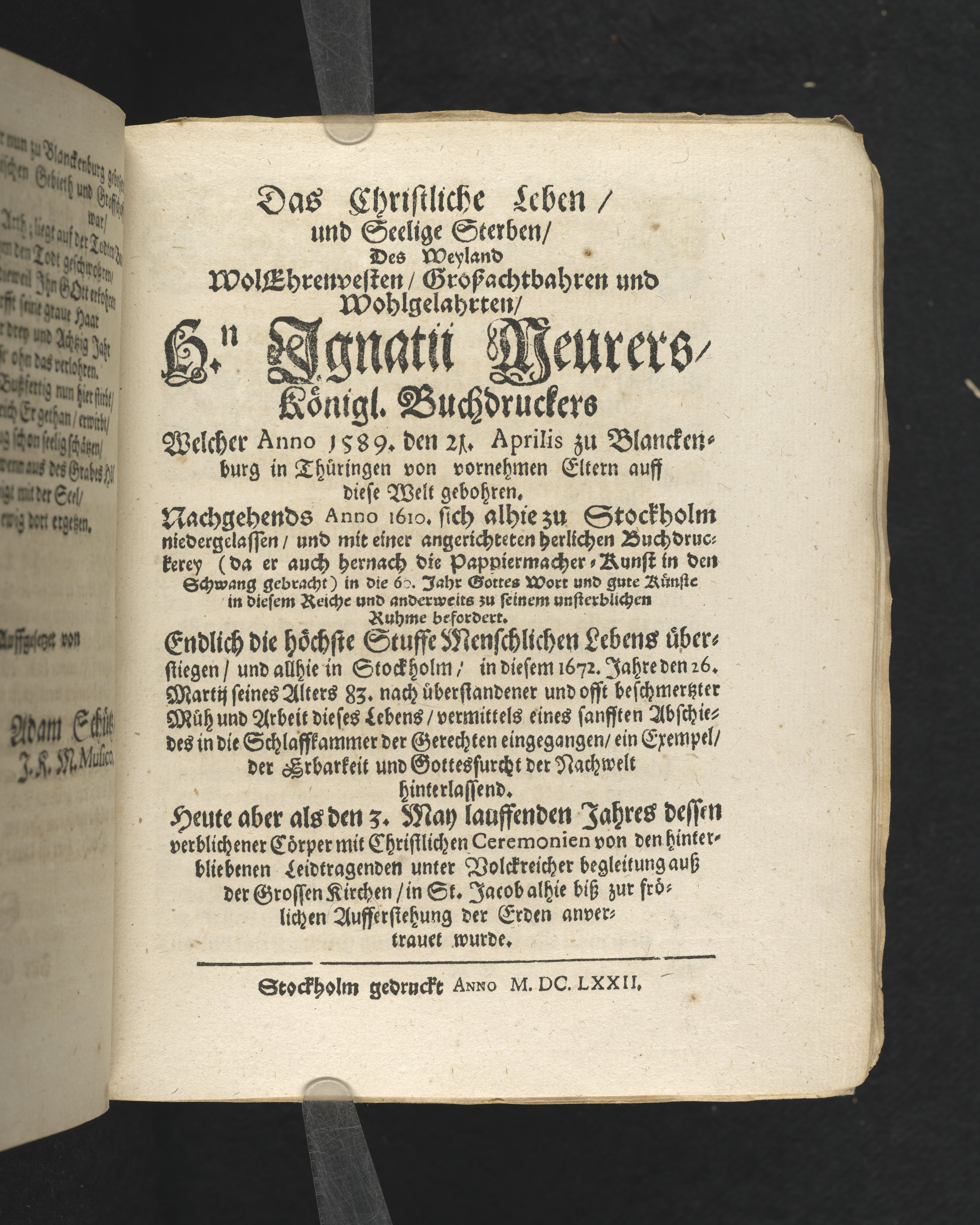 Das christliche Leben, und seelige Sterben, des weyland ... Hn. Ignatii Meurers, königl. Buchdruckers ... Nachgehends anno 1610. sich alhie zu Stockholm niedergelassen, und mit einer angerichteten herlichen Buchdruckerey ... Stockholm gedruckt anno MDCLXXII.
