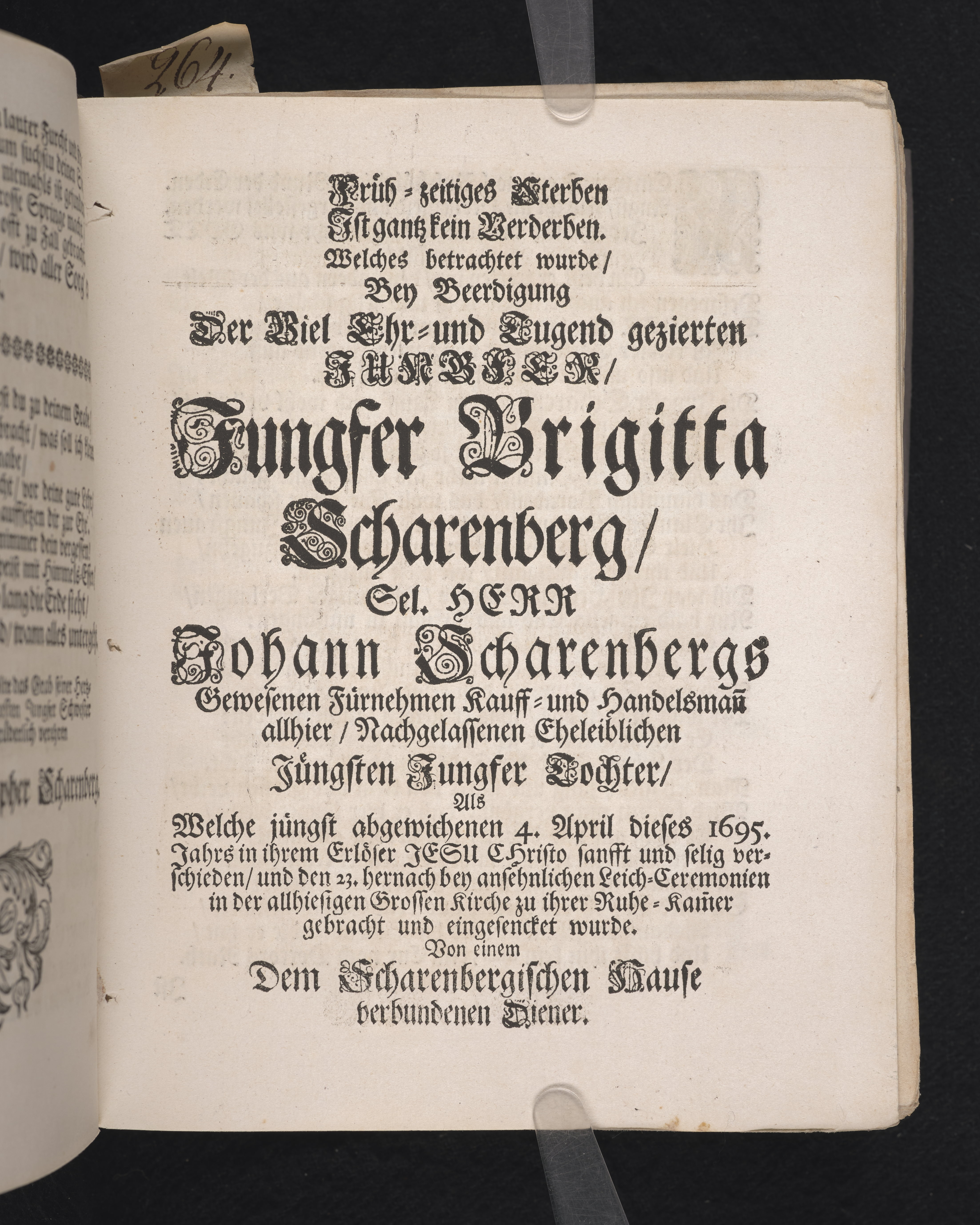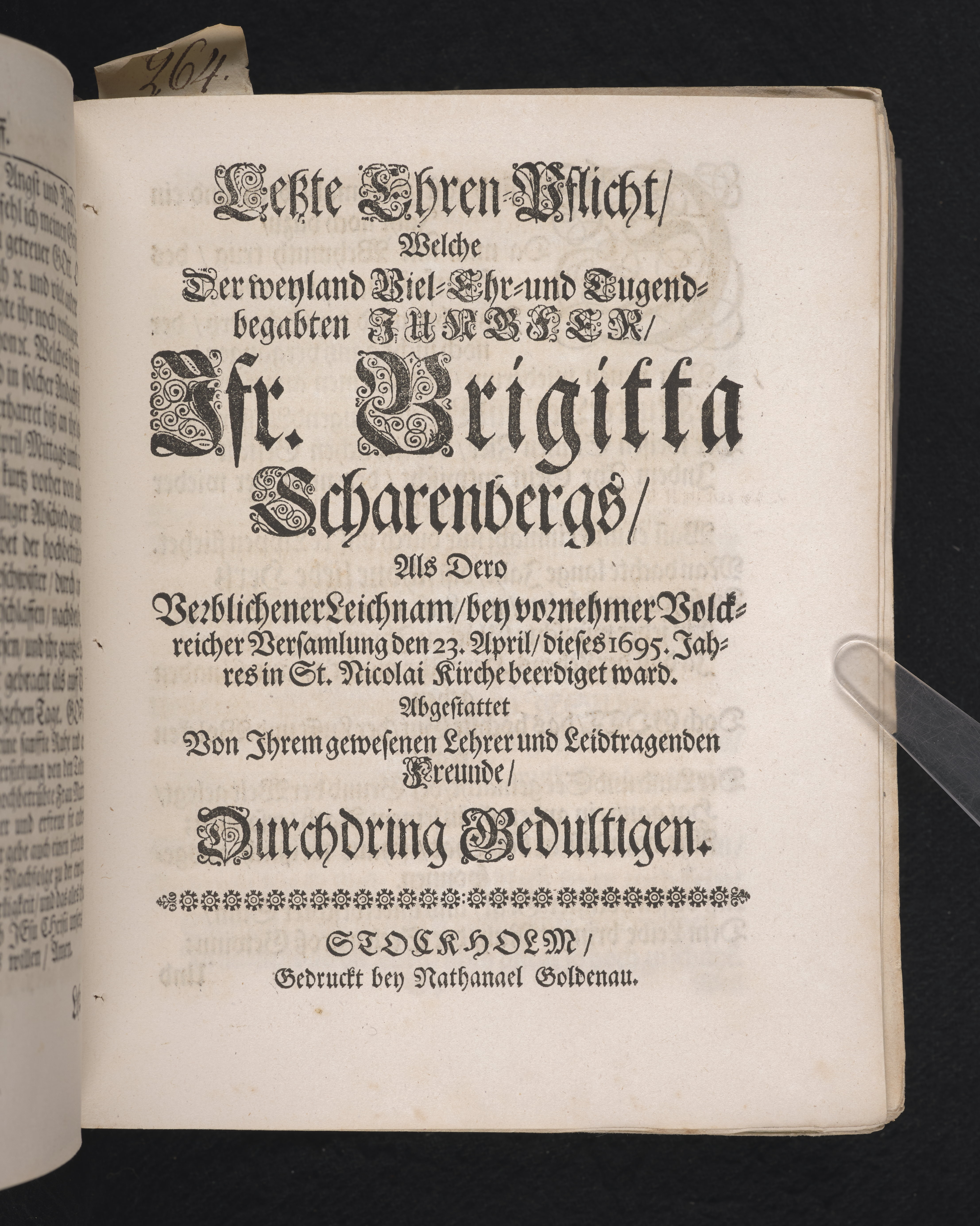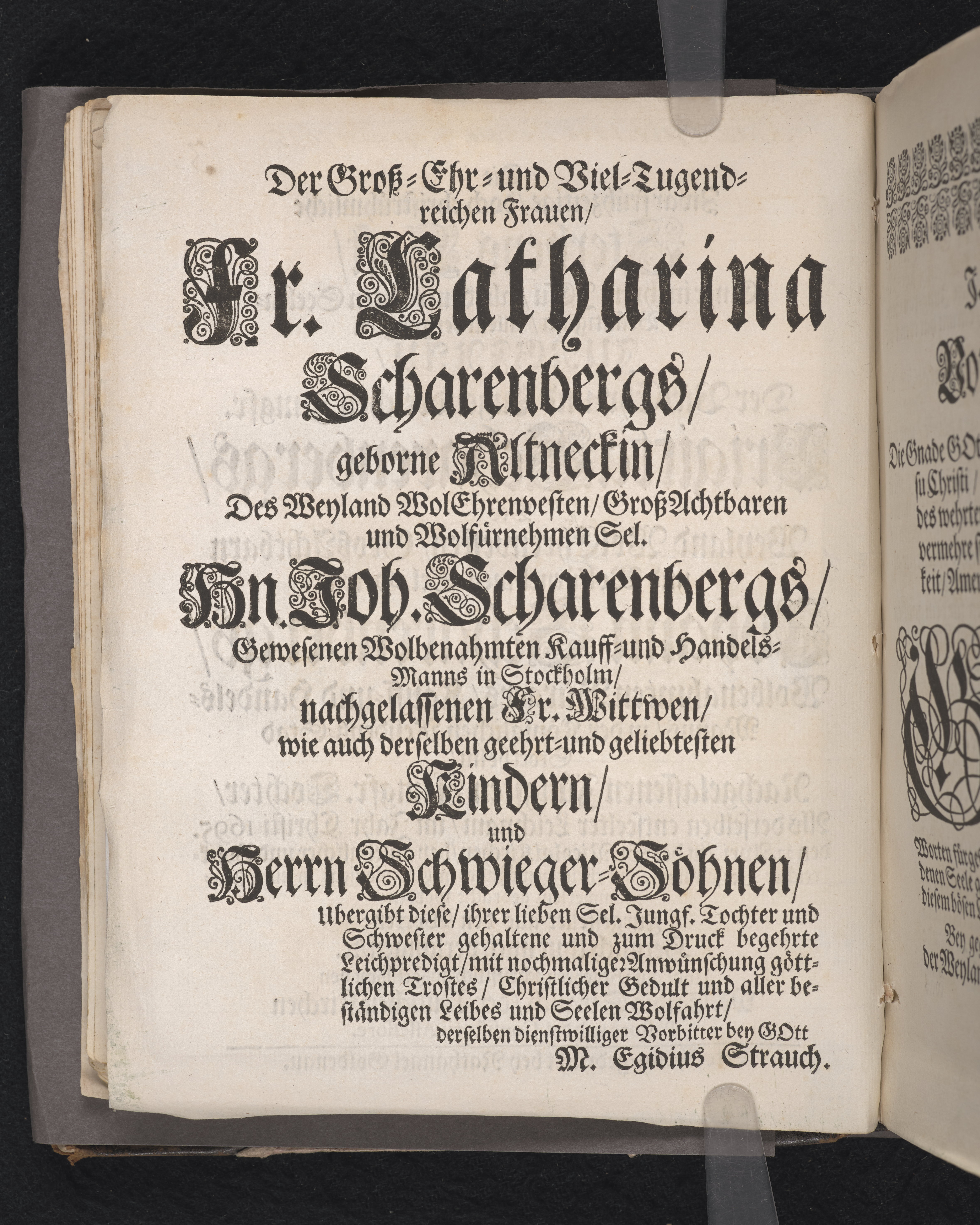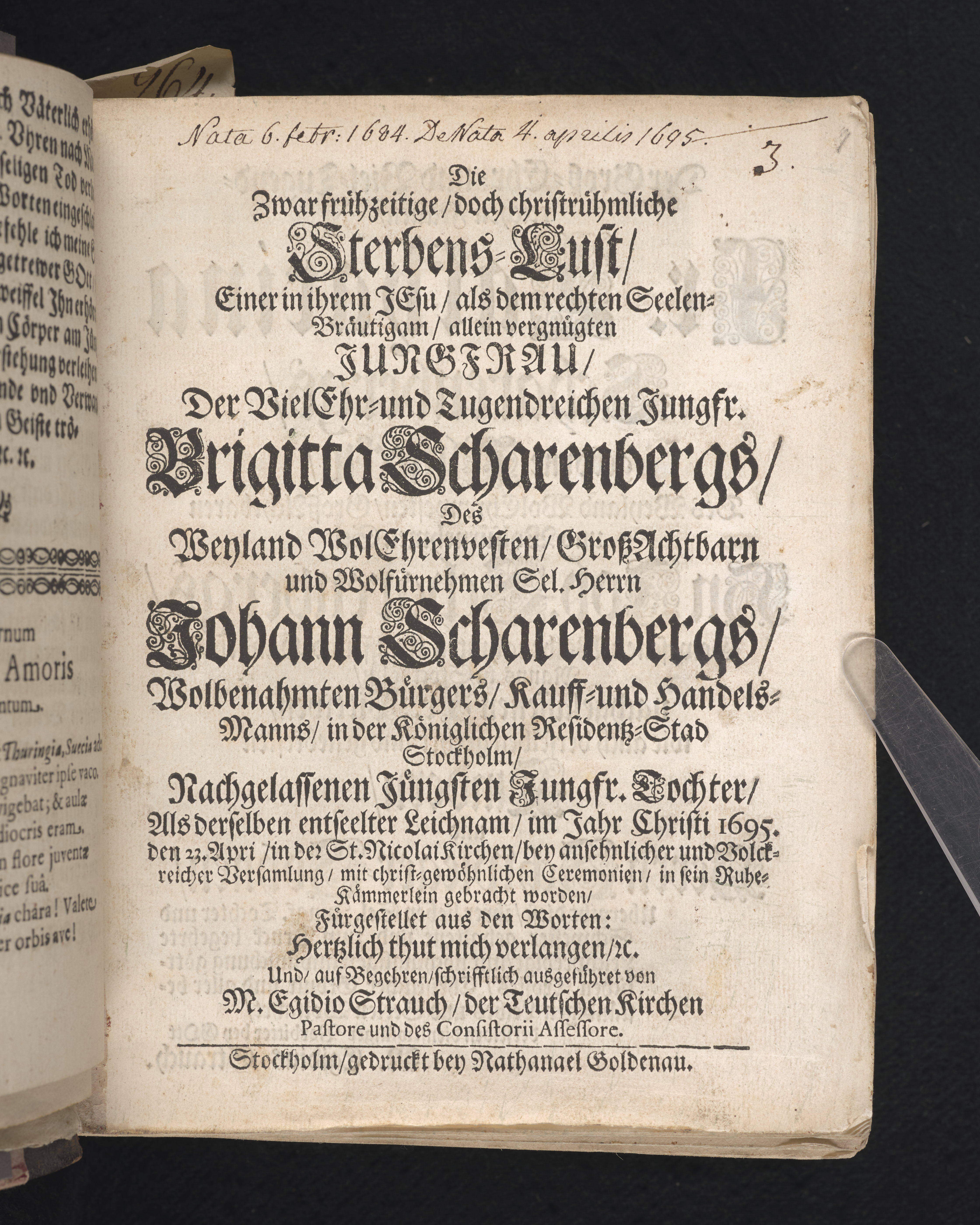 Die zwarfrühzeitige, doch christrühmliche Sterbens-Lust einer ... Jungfrau, der ... Jungfr. Brigitta Scharenbergs, des ... Herrn Johann Scharenbergs ... Kauff- und Handels-Manns, in der königlichen Residentz-Stad Stockholm ... jüngsten Jungfr. Tochter ... 1695. den 23 April, in der St. Nicolai Kirchen ... fürgestellet ... von M. Aegidio Strauch ... Stockholm, gedruckt bey Nathanael Goldenau.