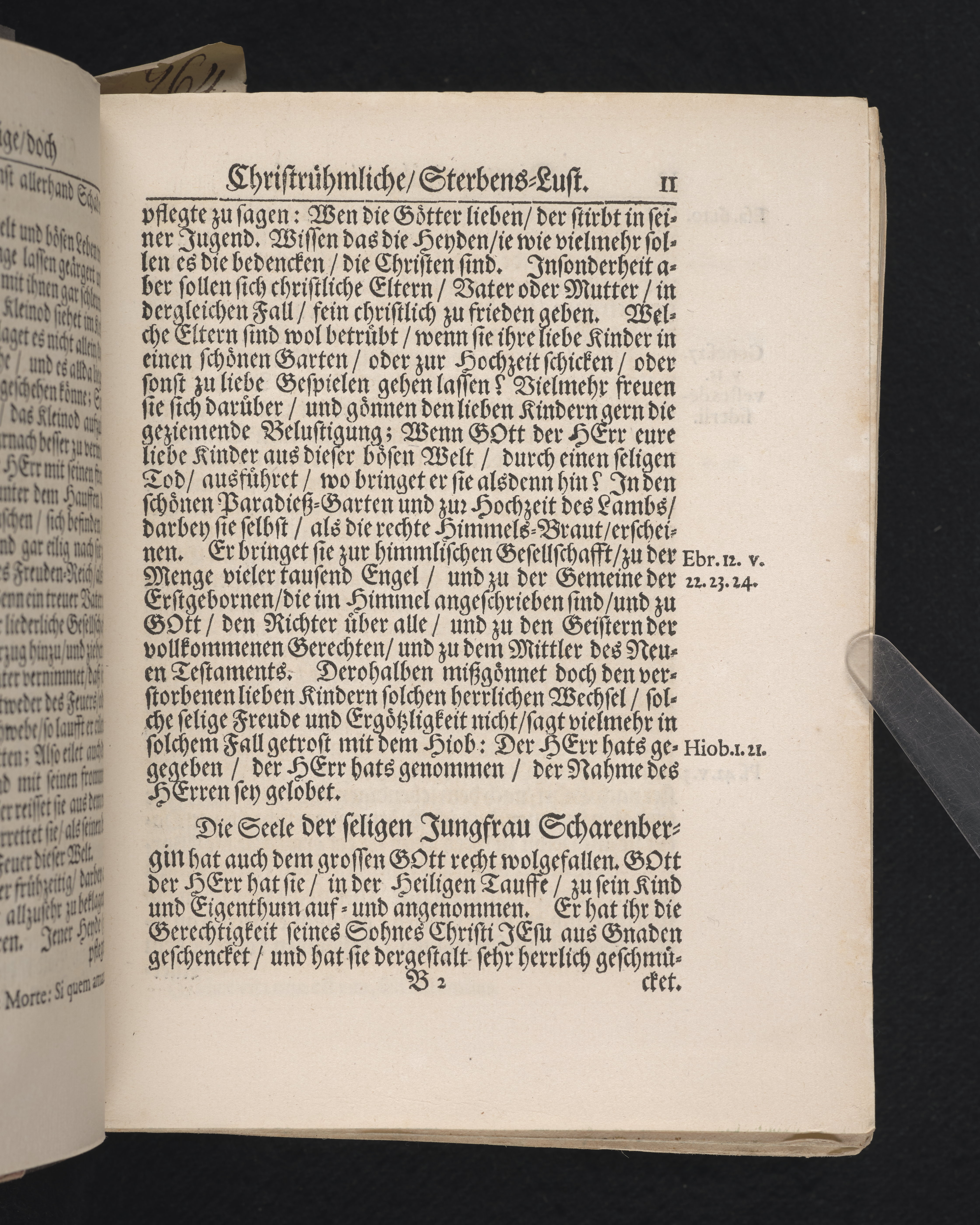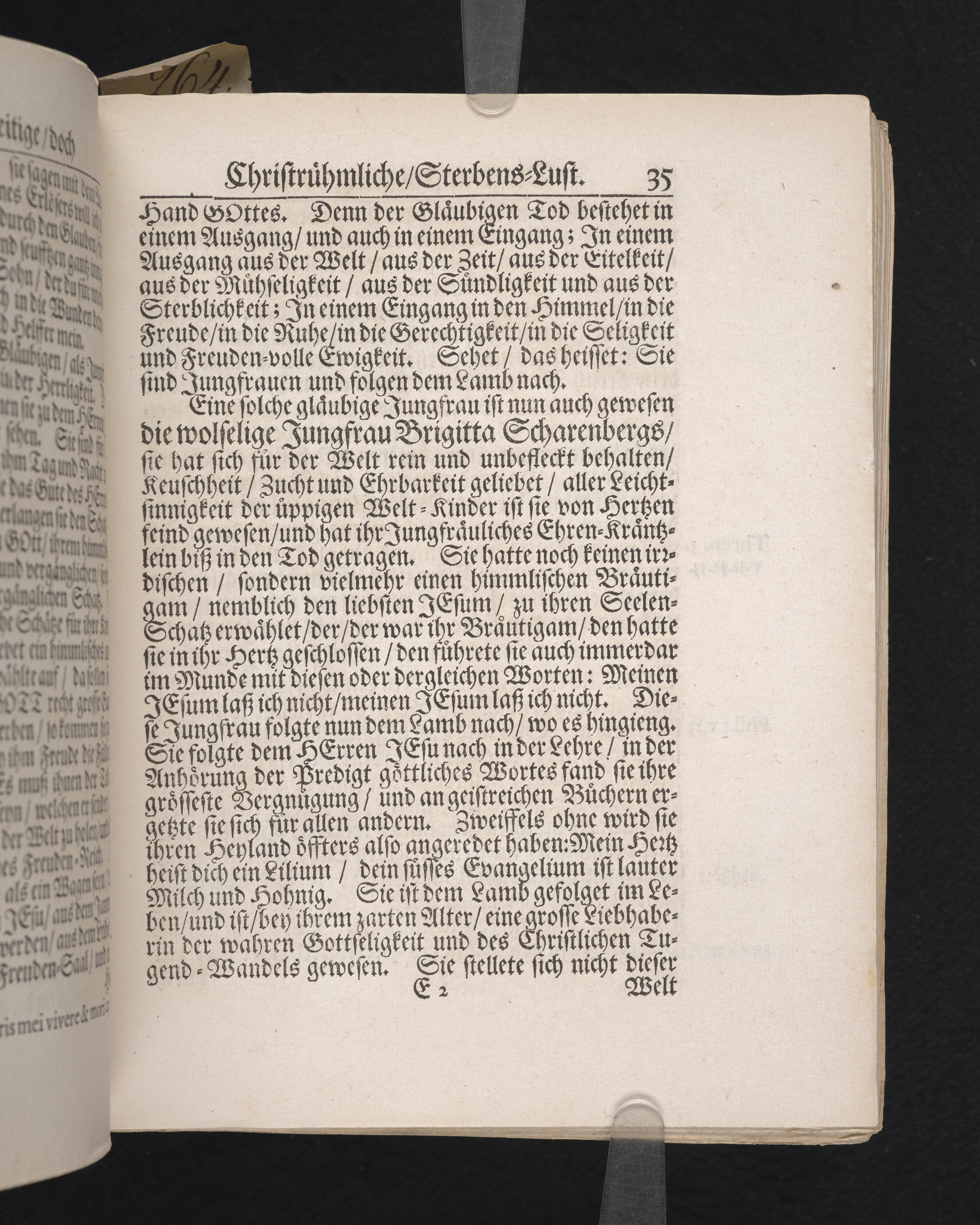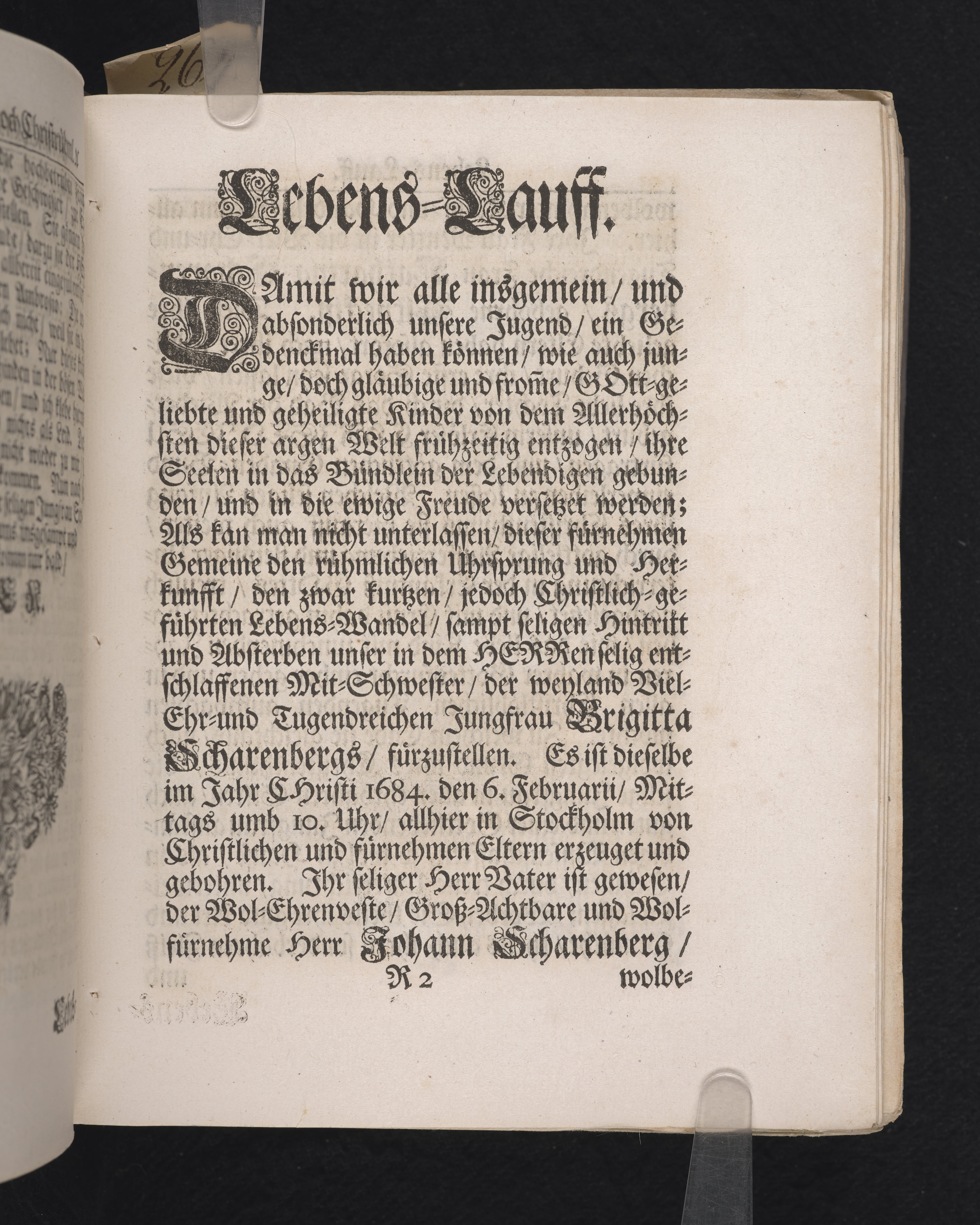 Die zwarfrühzeitige, doch christrühmliche Sterbens-Lust einer ... Jungfrau, der ... Jungfr. Brigitta Scharenbergs, des ... Herrn Johann Scharenbergs ... Kauff- und Handels-Manns, in der königlichen Residentz-Stad Stockholm ... jüngsten Jungfr. Tochter ... 1695. den 23 April, in der St. Nicolai Kirchen ... fürgestellet ... von M. Aegidio Strauch ... Stockholm, gedruckt bey Nathanael Goldenau.