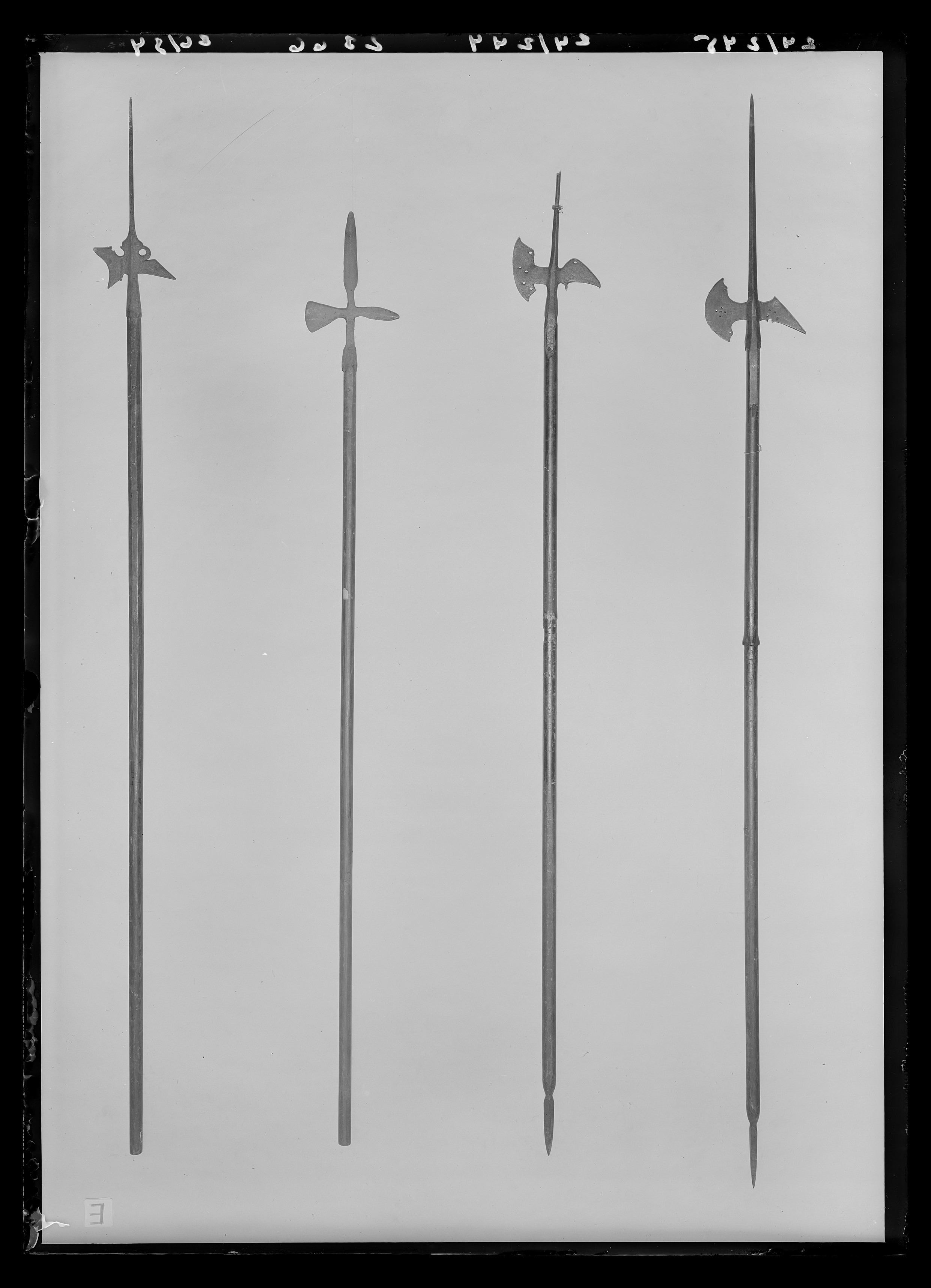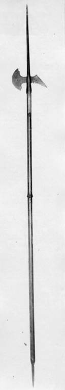 Ståldelen svärtad. Klinga, l: 470 mm med fyrsidigt tvärsnitt. Yxblad smalt vid holken och vidgar sig i en båge mot eggen. Eggen kraftigt rundad, konvex. Mitt på bladet fem små rundade hål, upptill och nedtill ett likadant hål. Hake nästan tresidig, nedåtriktad, på överdelen på ena sidan en stämpel (se litt), på nederdelen fyra rundade hål och en rund inskärning. Holk l: 70 mm, mjukt åttsidig med rund inskärning på egg- och ryggsida. Seknor l: 154 resp. 130 mm, fastskruvade vid skaftet. Skaft runt av svartbetsat trä med fyrsidig utvidgning mitt på som ett lansskaft. I änden lans- eller spjutspets, l: 141 mm med mötande skär, rund holk, l: 46 mm, fäst vid skaftet med skenor, l: 604 mm.