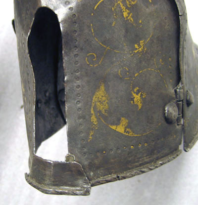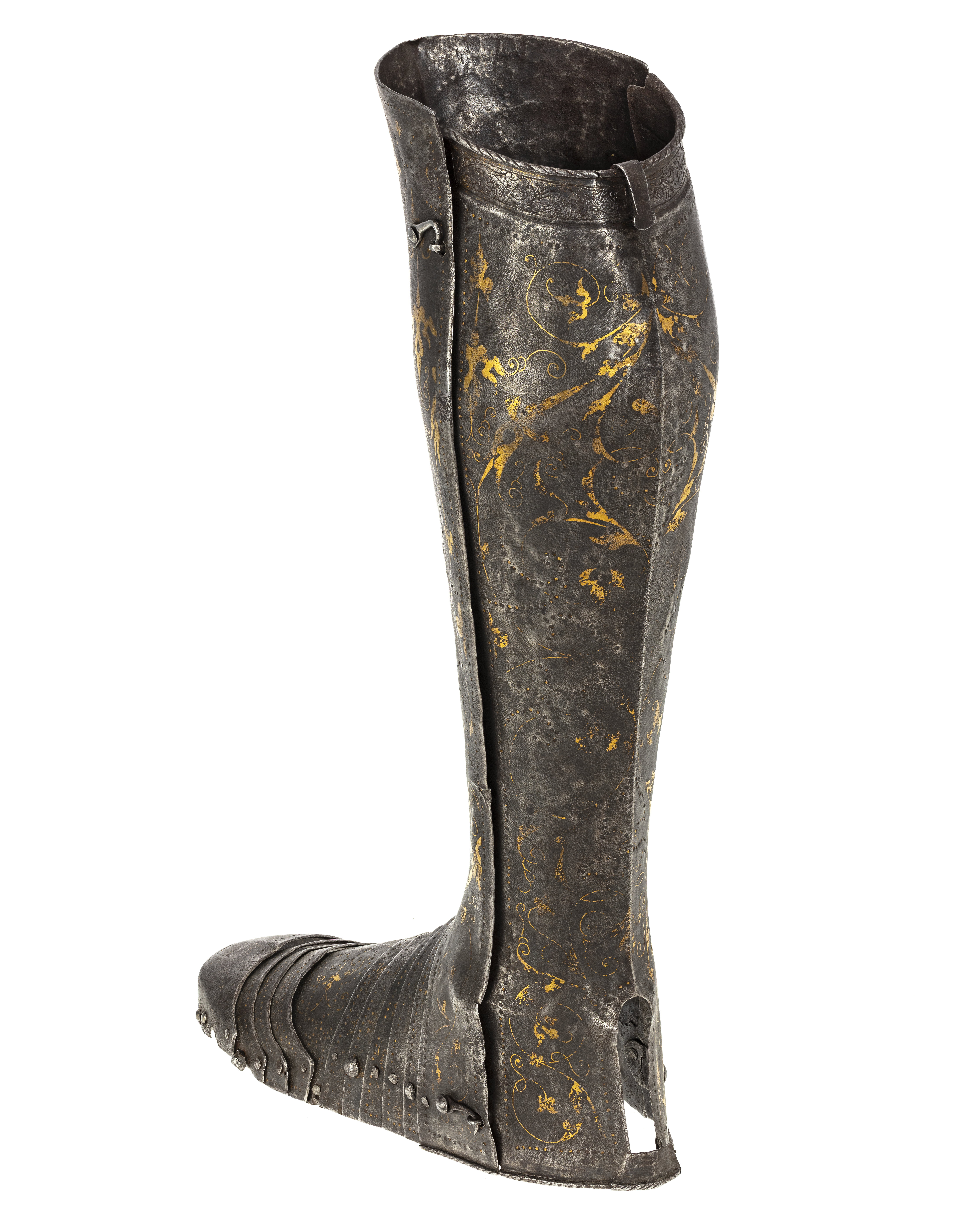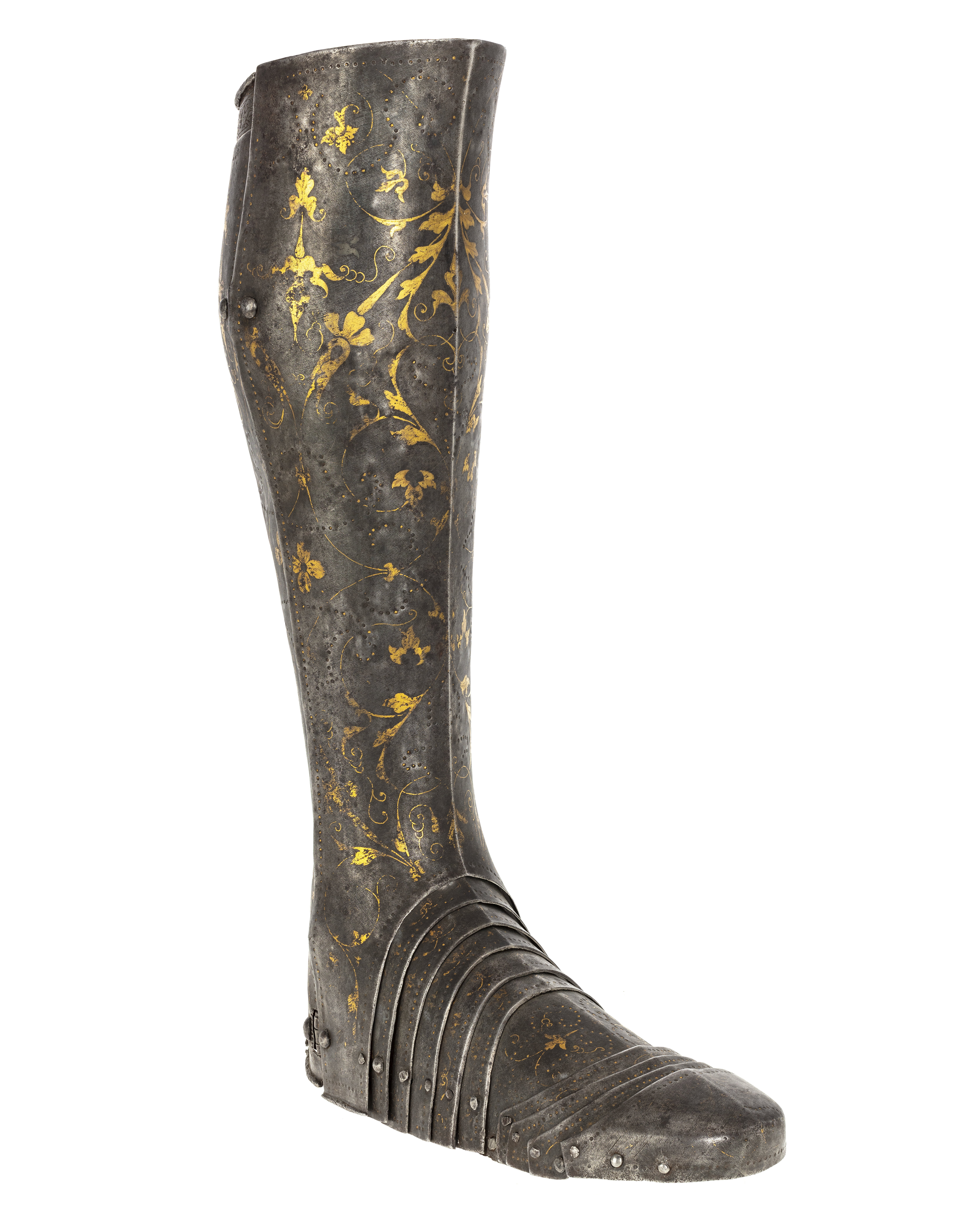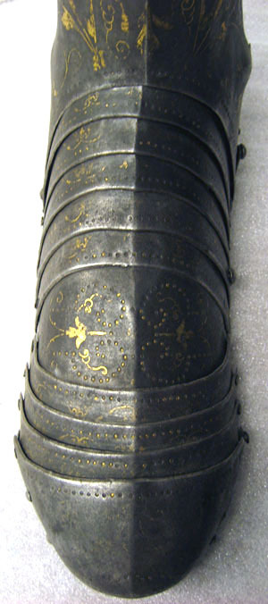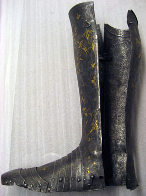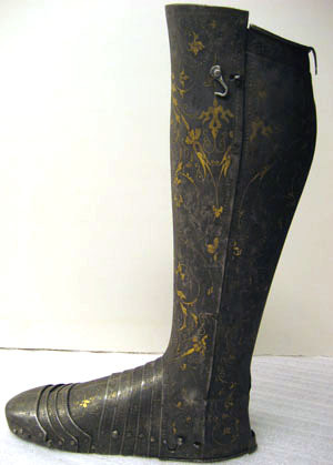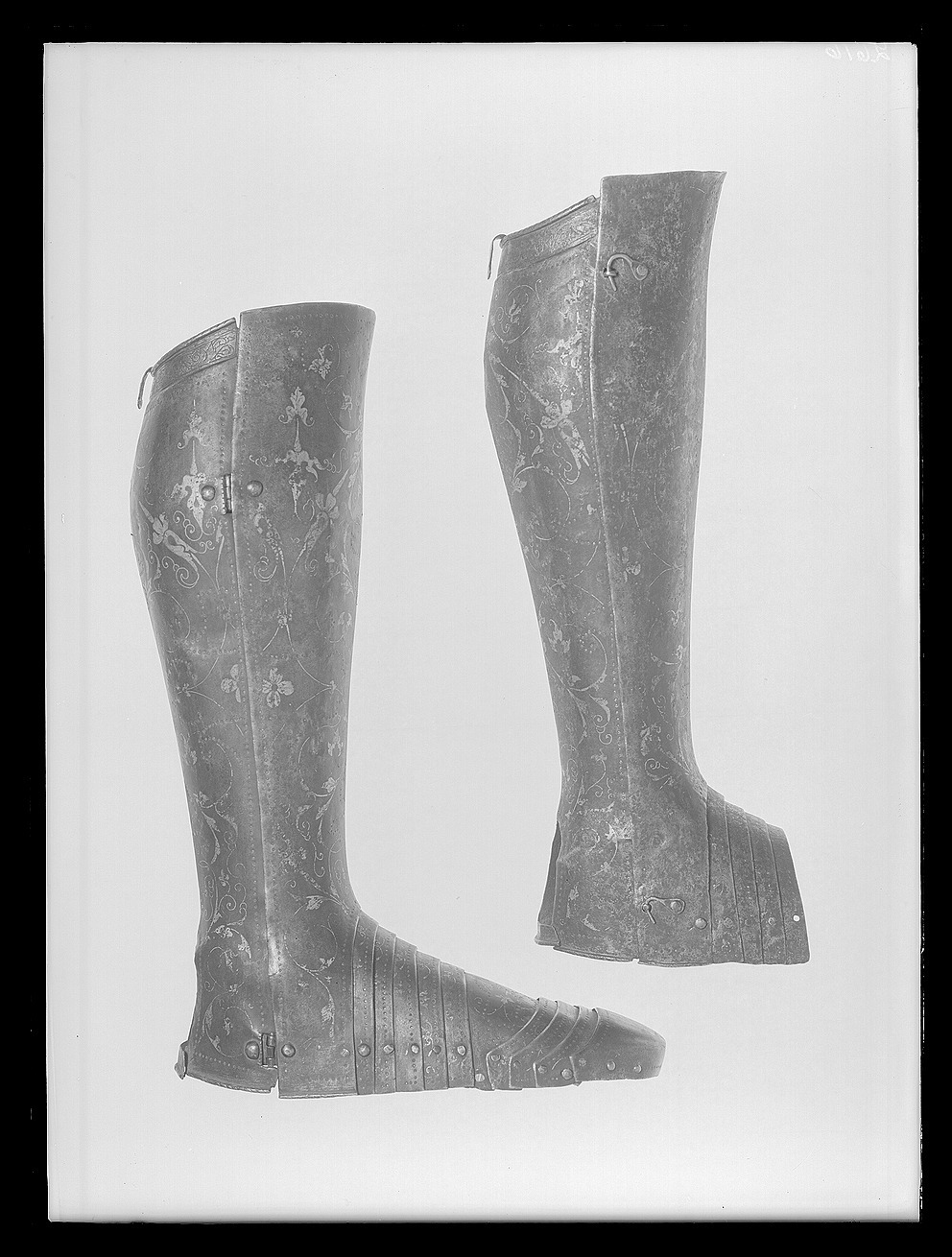 Driven stålplåt med på utsidan rankdekor av påslaget guld och silver mot mörk botten. Insidan brunaktig med tydliga hammarslag. Sammanlagt 12 delar. Rörformig benskena bestående av två välvda halvor, drivna efter benets form med utbuktning över vaden, avsmalnande nedåt och bredare över foten. Bakre kanten vid knävecket snett avtagen och lutande utåt. Delarna fästade samman med mot insidan två gångjärn och mot utsidan upptill och nertill genomborrad tapp och hasp. I hälen ett vertikalt ställt rektangulärt hål, 65 x 17 mm. På bägge skenor en skarp mittås, framtill löpande från övre kant till skon. Upptill en hake av plåtbit, nitad på insidan och vikt över kanten. Sko av sammanlagt tio delar, åtta välvda skenor lagda omlott och sammanfogade nertill med nitar. Fem bakre och fyra främre som möts över en oval mittenskena. Sedda från sidan är de bakre skenorna raka och de främre svängda framåt. Skon avslutas framtill över tårna av en större skena formad som en skyddande kappa med nervikta kanter. Skenornas nedre kanter raka. Dekor: Blånerad yta med skrafferade partier med påslaget guld och silver i form av slingrande rankor och blommor. Över och genom detta mönster löper slingor av punsade och guldfyllda prickar. Längs bakre skenans övre kant löper en försänkt bård med etsad och förgylld dekor av bladverk.