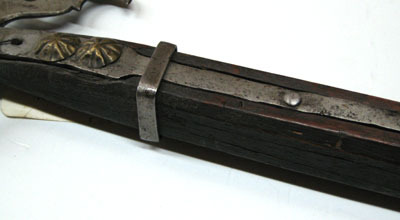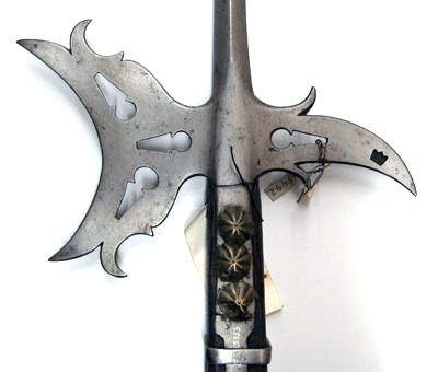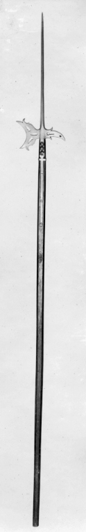Utdragen klinga med rombiskt tvärsnitt. Yxblad med konkav eggsida och ovanför och nedanför denna uppåt-inåtböjda flikar samt tre genombrutna nyckelhålsliknande ornament. Smal nedåtböjd hake med vid basen två flikar och ett ornament som de på yxbladet. Holk 95 mm lång av två skenor samt med tre stora nitar med välvda blomliknande huvuden. Holken nedtill avgränsad med ett 8 mm brett, slätt band av stål. Från holken två smala skenor 286 mm långa. Skaft av brunbetsat trä med fyrsidigt tvärsnitt med avfasade hörn.