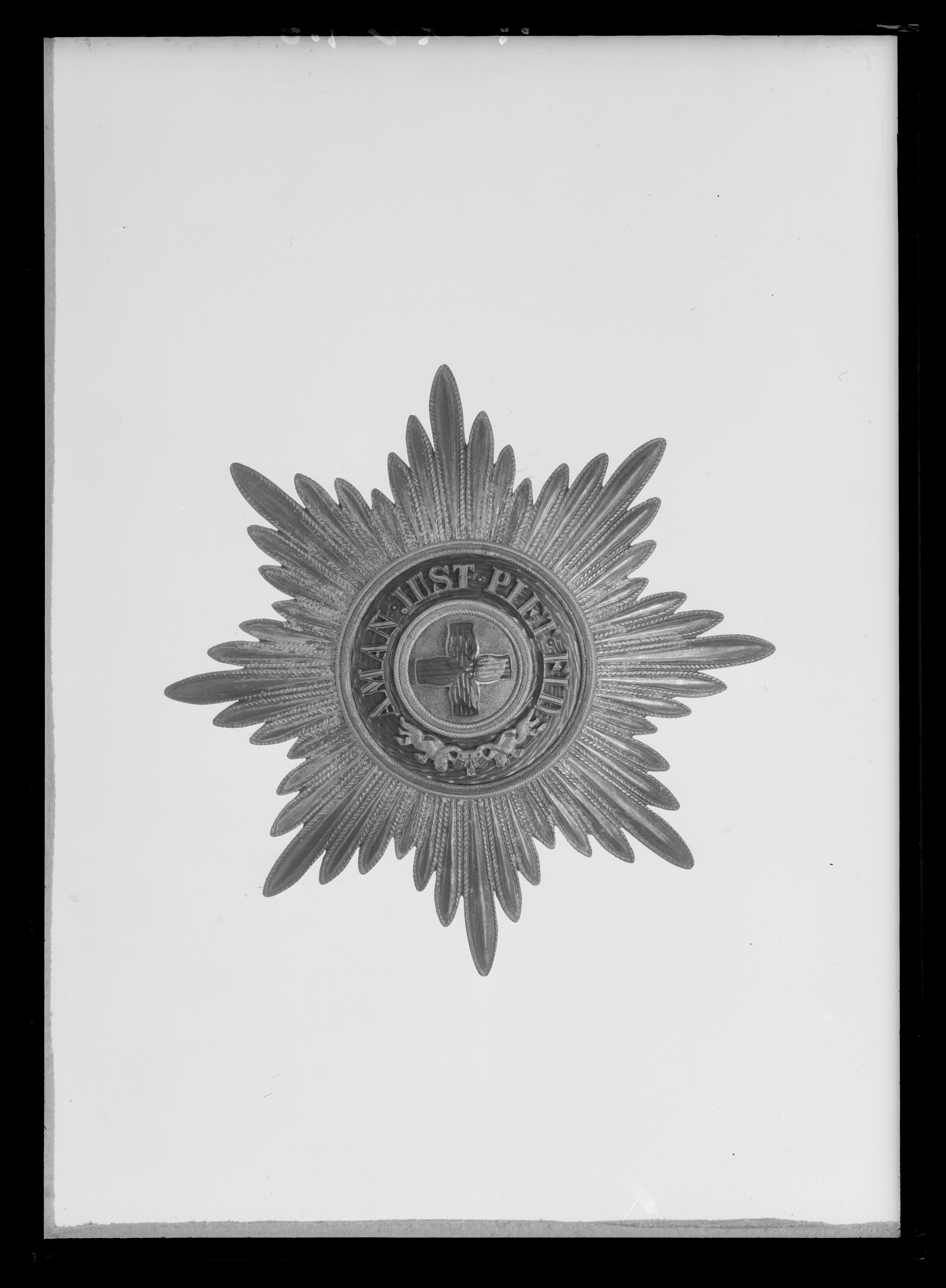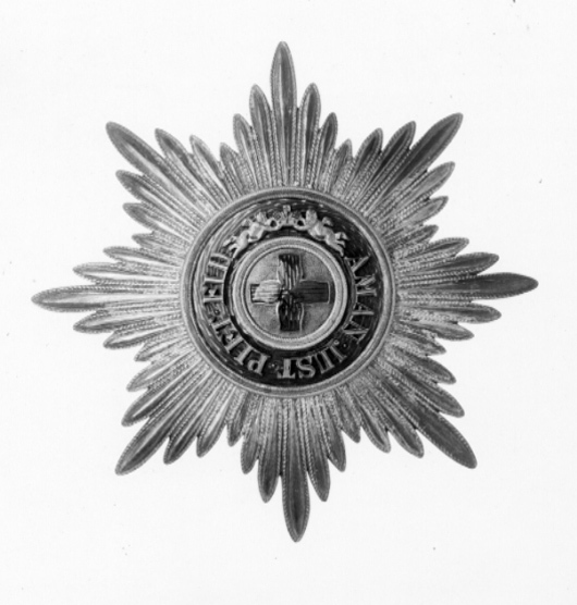 Åttauddig strålstjärna av silver, sammansatt av 48 välvda strålar med repstavskant. Välvd, mattpunsad, förgylld medaljong, därpå fäst ett flamkors av silver, täckt med röd, genomsynlig emalj. Ring täckt med röd, genomsynlig emalj, därpå fäst silvertext: "AMAN. JUST. PIET. FID." (amantibus justitiam, pietatem, fidem - åt dem som älskar rättvisa, fromhet, trohet) samt två keruber, som lyfter upp den ryska kejsarkronan. På in- och utsidan av den röda ringen ringar av silver med repstavskanter samt slät ring i mitten. Frånsidan förgylld, stämplar: ryska statsvapnet, Keibel, två korslagda ankare och spira samt till höger därom: 84. Vertikalt placerad säkerhetsnål, fästet nertill.