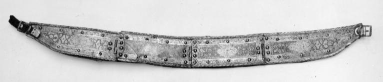 2:ne tyglar hvardera i 4 delar, sammanhållna med gångjern, på hvarje tygel finnes 2:ne söljor och en med svart sammet öfverklädd spännrem, hvilken är försedd med en ciselerad tamp och ett spännhål med skoning - gångjernet på ena tygeln bristfälligt.